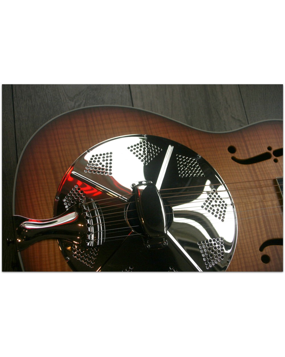 The Estralita Deluxe, developed in 2001, is constructed of walnut back and sides, figured maple laminate top triple bound with ivoroid/black/ivoroid. The walnut neck features an ivoroid bound rosewood fingerboard with mother-of-pearl diamond inlays. The slotted headstock is overlaid with white pearloid and engraved with the National logo. Tuners are vintage-style engraved, open gear.