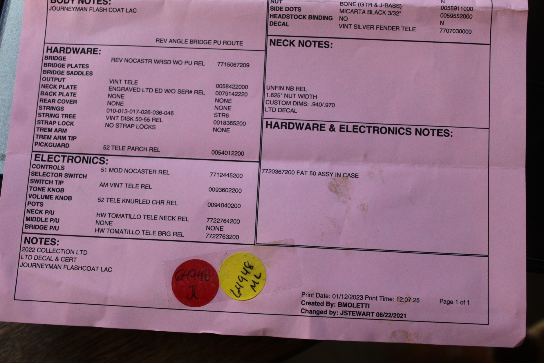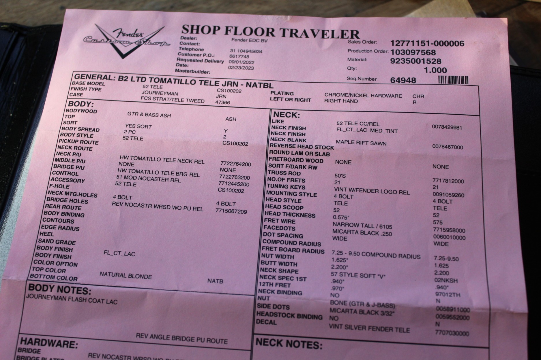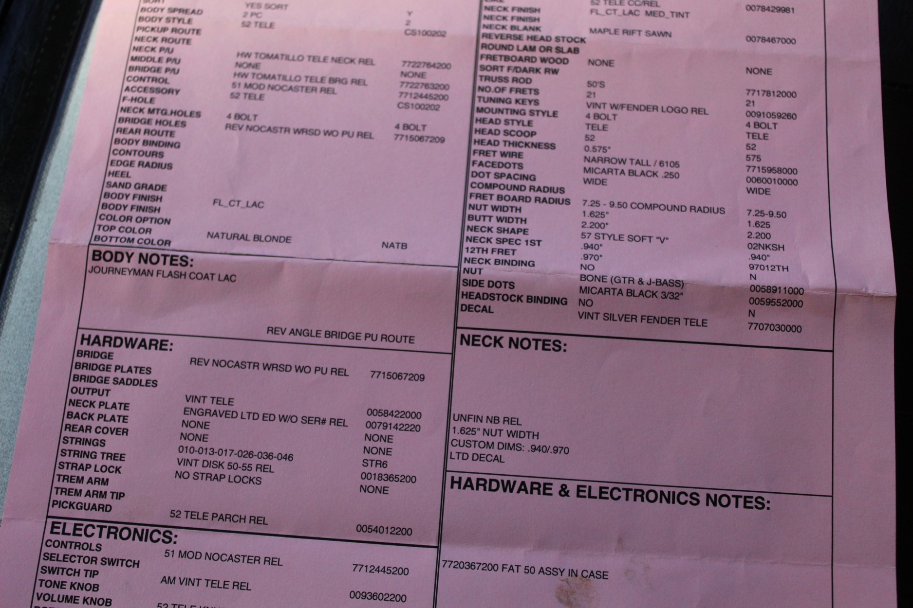 SEE FLOOR SHOP PHOTOS FOR FULL SPEC, thanks Color Natural blonde Country of origin Us Orientation Right-hand Series Limited edition Fingerboard material 1-piece maple Fingerboard radius 7.25" to 9.5" vintage compound radius (184 mm to 241 mm) Neck finish Nitrocellulose lacquer Neck material 1-piece rift sawn maple Neck shape 1957 soft "v"