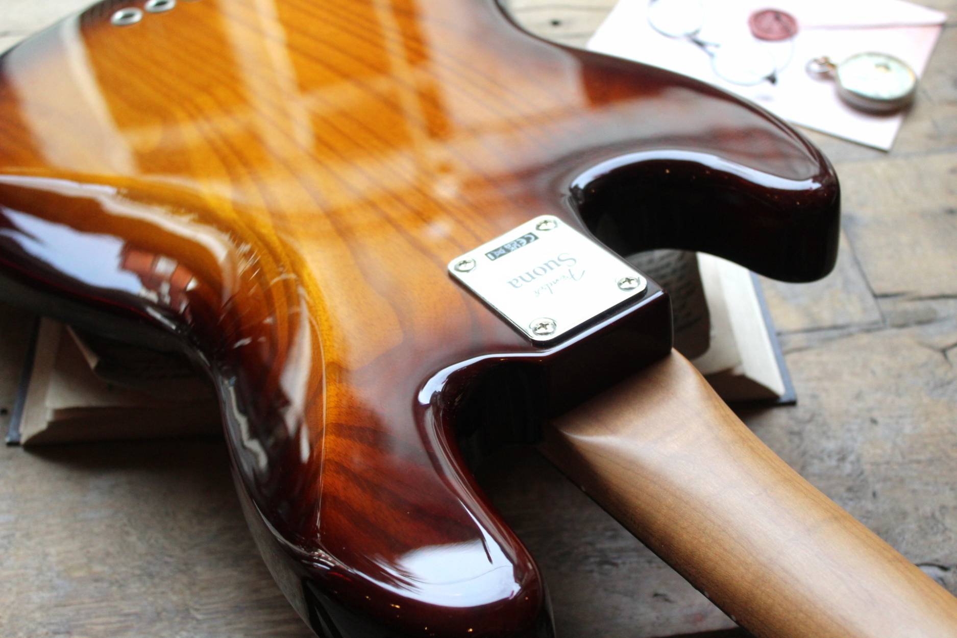 Designed to inspire and captivate, The Suona Jazz Bass® Thinline sings with a refined elegance that echoes the masterful work of a legendary artisan. A stunning adaptation of traditional Fender design, its warm, resonant tones and unmatched beauty are a testament to the dedication and artistry poured into every detail. Crafted with a semi-hollow ash body and a bound Italian alpine spruce top, this instrument boasts exceptional clarity, lively resonance and a warmth unique to Thinline models. The roasted flame maple modern "C" neck and 7.25"-9.5" compound-radius ebony fingerboard offer luxurious comfort and limitless playability, while the HiMass™ Vintage bridge adds sustain, resonance and punch. Custom-designed Suona Jazz Bass® pickups produce dynamic and distinct tones with rich harmonics and remarkable depth, while the premium Nitrocellulose Lacquer Violin Burst finish with matching painted headstock complete this timeless instrument. Experience the perfect blend of tradition and innovation and lose yourself in the luscious tones of the Suona Jazz Bass® Thinline. FEATURES Semi-Hollow Ash Body with Bound Italian Alpine Spruce Top Nitrocellulose Lacquer Violin Burst Finish with Matching Painted Headstock Custom-Designed Suona Jazz Bass® Pickups Roasted Flame Maple Modern "C" Neck 7.25"-9.5" Compound-Radius Ebony Fingerboard HiMass™ Vintage 4-Saddle Bridge Model #: 0170291830