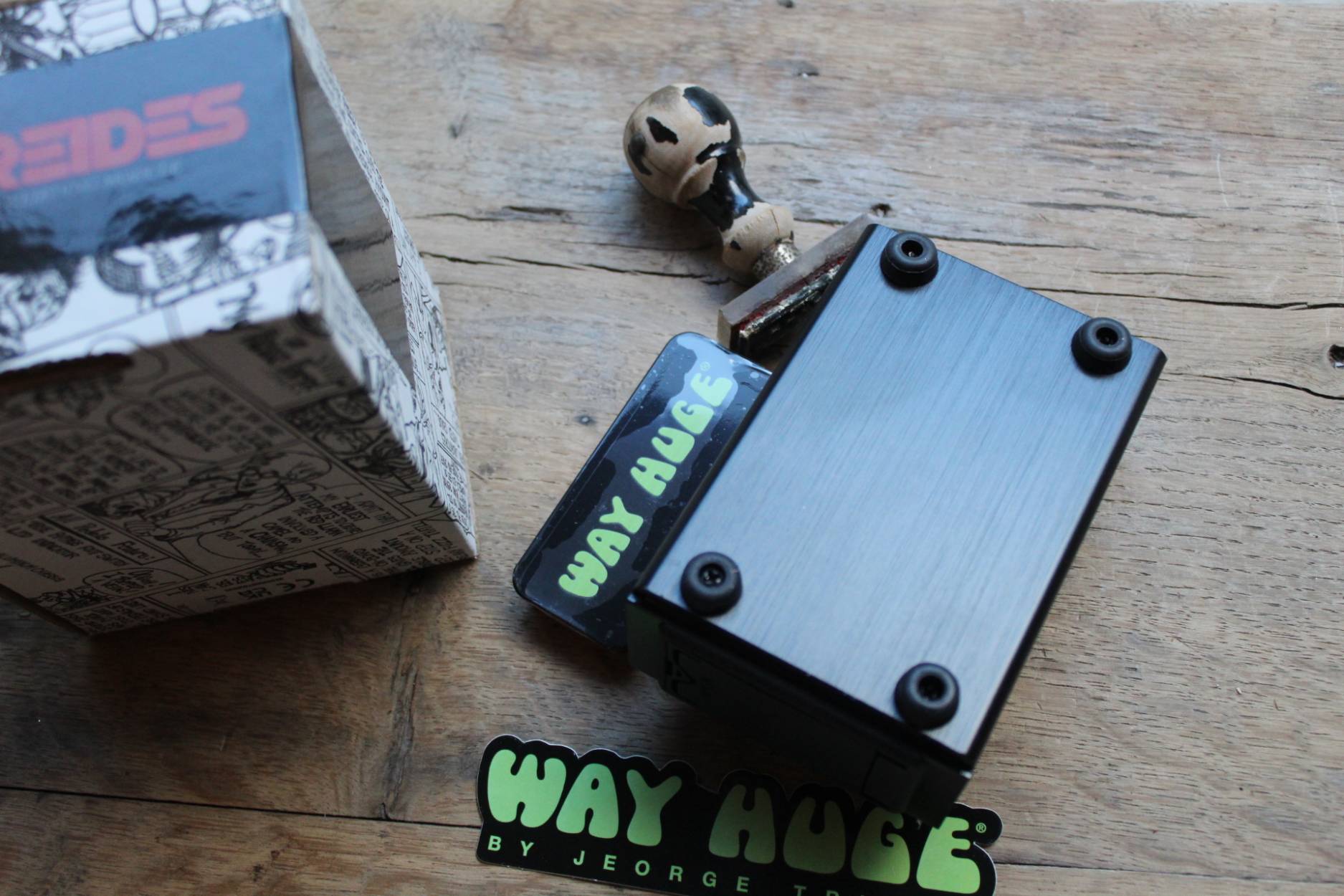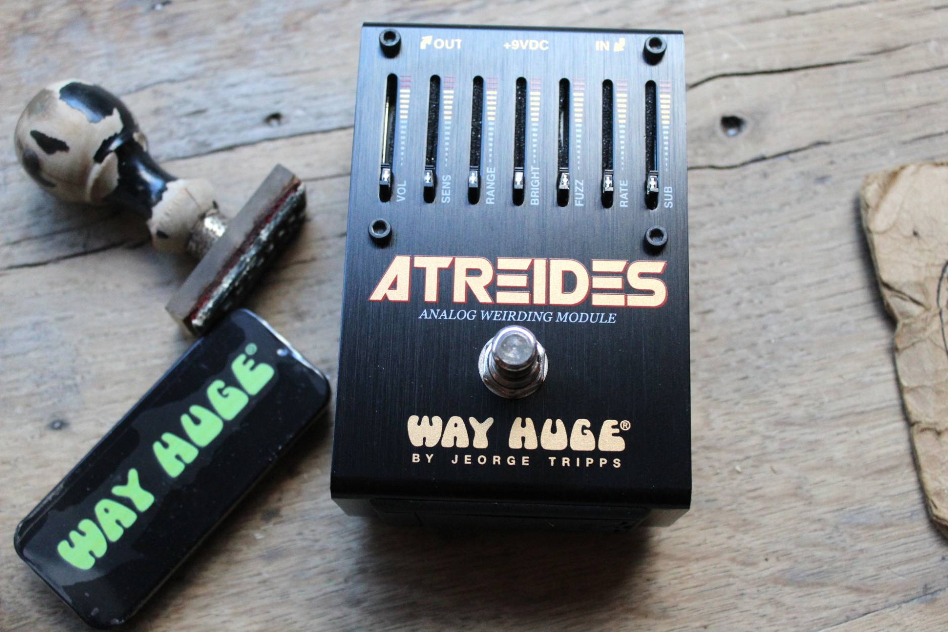 THE LONG STORY A beginning is the time for taking the most delicate care—that the balances are correct. Fear is the TONE killer! You are about to enter a world where the unexpected, the unknown, and the unbelievable meet. Take a spectacular journey through the wonders of space and the mysteries of time. From the boundaries of the incredible to the borders of the implausible. The Sleeper has awakened! The Way Huge Atreides Analog Weirding Module offers a kaleidoscope of organic synth-like tones. Inspired by a vintage 1980 mini synthesizer, this consciousness-awakening device produces a monophonic effect with many layers that can be manipulated as needed through dynamic playing technique and adjustment of each of its several sliders. Kicking the footswitch generates an explosion of growly sub-octave, expressive vocal envelope, swooshing phase, and gnarly fuzz sounds. Ascend the high dune and gaze upon an expanding world of musical delights full of pure imagination.