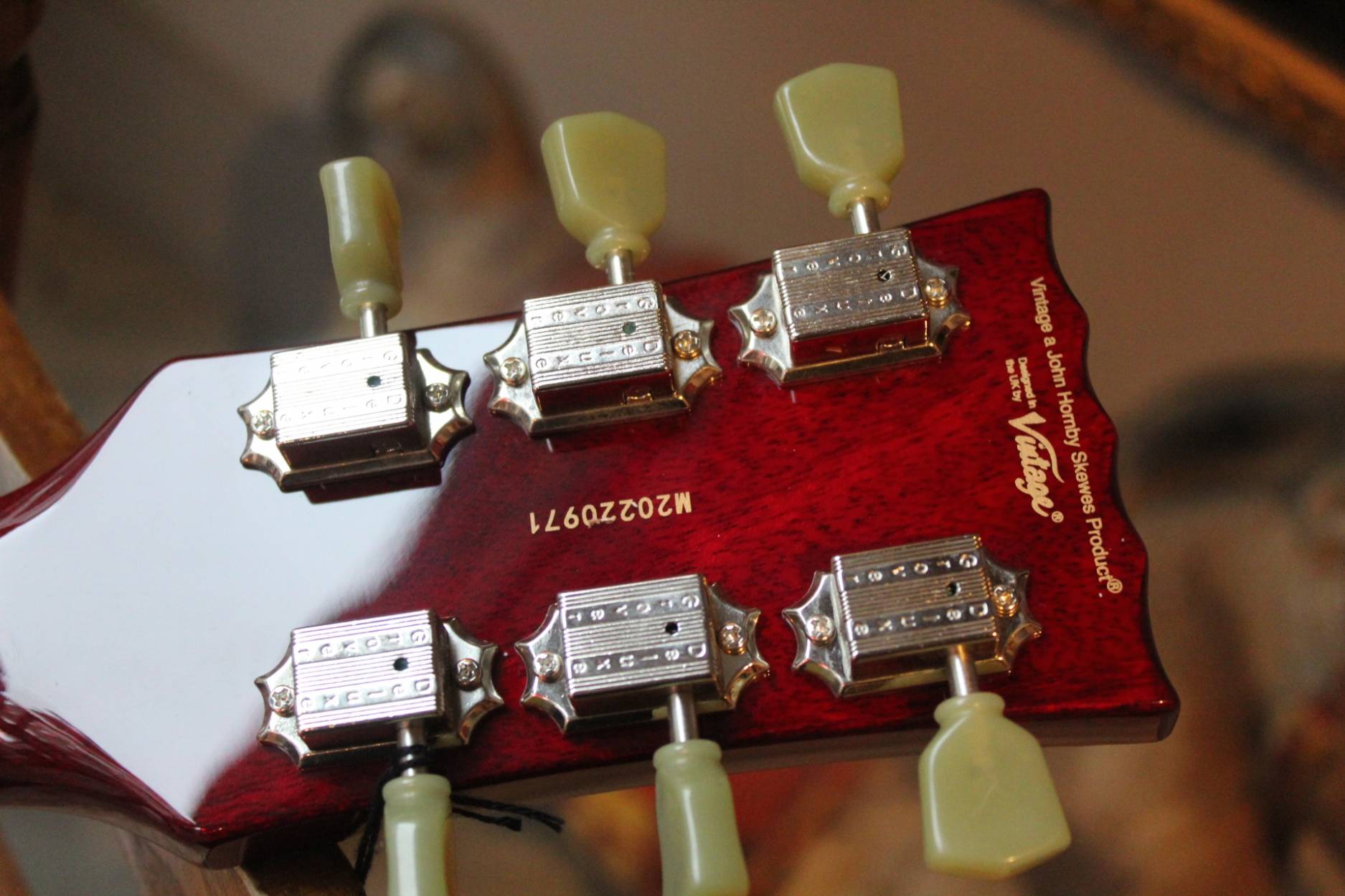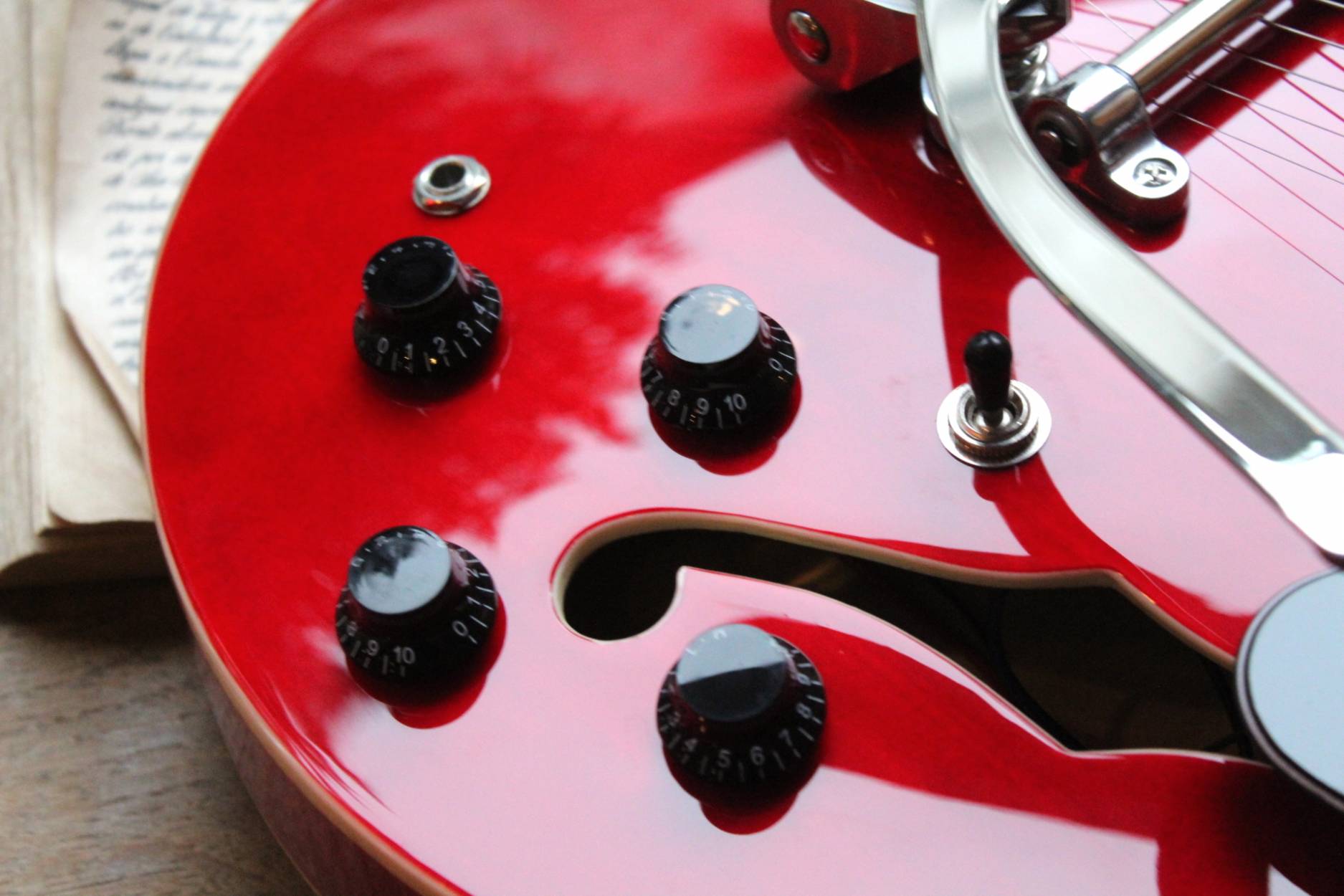 For many years, the Vintage® ReIssued™ Series VSA500 semi-acoustic guitar with a maple body and mahogany neck, has been a firm favourite amongst rock, jazz and blues players around the world, for its ability to effortlessly deliver acoustic properties of archtop guitars at louder volumes with reduced feedback. Available in a gorgeous gloss Boulevard Black finish offset with cream binding, 3 ply black scratchplate and chrome hardware, this highly professional Vintage ReIssued VSA500B semi-acoustic guitar is also fitted with a Bigsby® licensed vibrato as standard. Beautiful warm, thick, powerful rich tones via a pair of Wilkinson vintage voiced WOCHB double coil pickups are delivered with exceptional clarity, whilst additional high-end hardware includes, chrome Grover tulip machine heads, a GraphTech nut, Wilkinson T.O.M bridge and the chrome Bigsby B70 vibrato tailpiece for sensitive vibrato duties and increased sustain. Vintage's unique, offset double cutaway evolutionary body shape, ingeniously-designed offset heel and enhanced treble side cutaway, improves playability and access the full length of the 22 fret fingerboard. VSA500B Specifications. Body: Maple body with maple top provides resonance, tone and 'correct weight' comfort. The VSA500B features Vintage's unique, offset double cutaway evolutionary body shape, ingeniously-designed offset heel and enhanced treble side cutaway to improve upper fret access and playability. Bridge: Wilkinson T.O.M. bridge provides superb tuning stability along with adjustable intonation for each string. Vibrato: Chrome Bigsby® licensed B70. Pickups: Two Wilkinson® vintage voiced WOCHB double coils provide thick and rich tones. Controls: Dual master Volume and Tone controls with three position pickup selector switch. Machine heads: Grover® tulip machine heads provide simple, effective action for superb tuning stability. Neck: One piece Mahogany with classic Vintage 'soft C' profile for instant comfort, speed, accuracy and great feel. Fingerboard: 12" radius fingerboard provides positive feel and superior playability. Scale Length: 24.75" / 628mm. Frets: 22 Medium Jumbo profile frets add to comfort, accuracy and overall positive feel of the VSA500B. Nut: 43mm GraphTech for smooth and friction-free string bending and tuning. Headstock: Classic Vintage headstock design for balance and visual appeal. The VSA500B™ is an original Vintage® ReIssued Series guitar designed in the UK by the Vintage® design team.