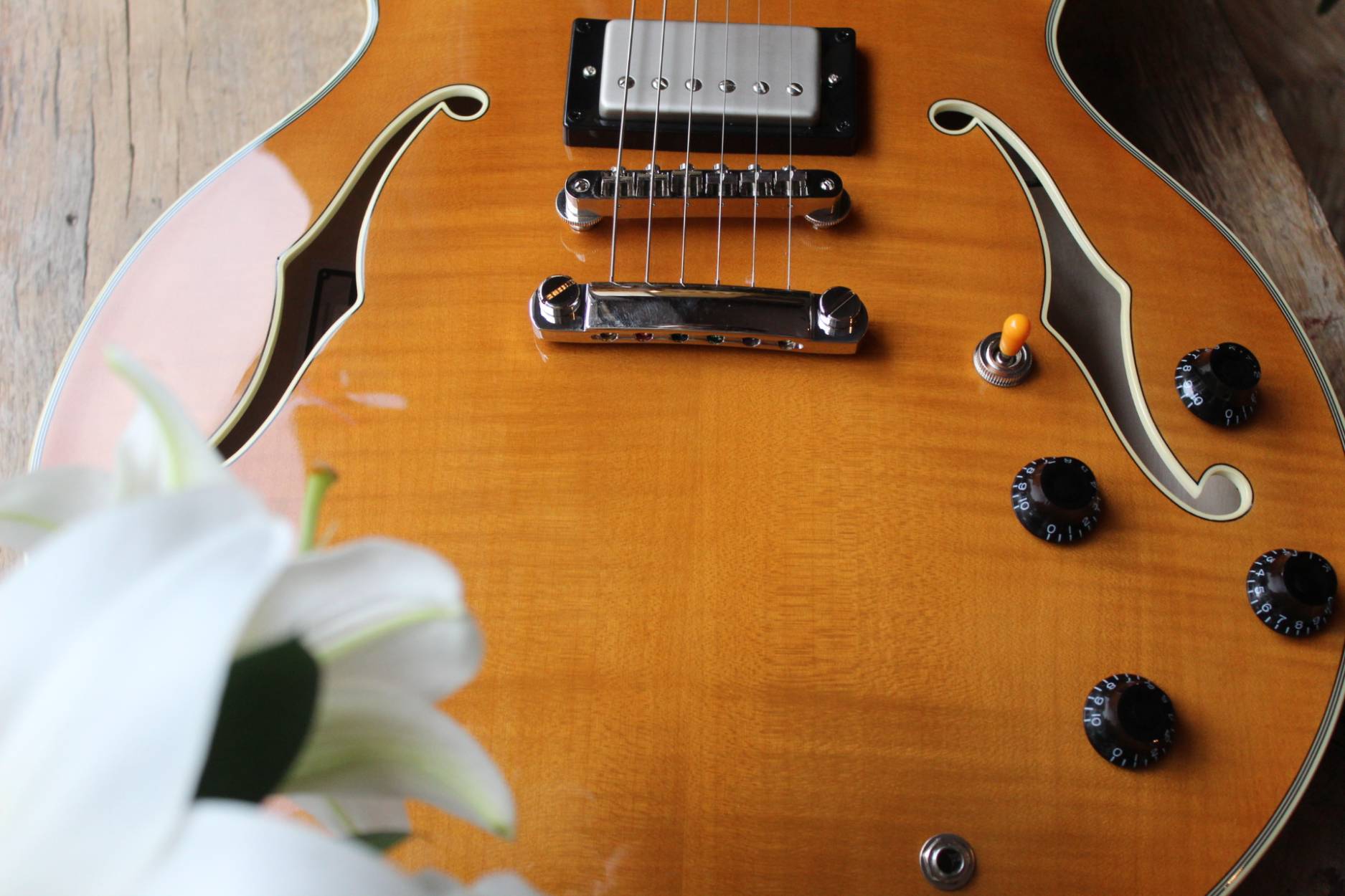 Stanford’s Thinline is a classic and a tribute to one of the most famous electric guitar models of all the time. The interior of this guitar model is defined by a sustain block, which provides the characteristic sound of the Crossroad Thinline 35. The combination of a Tune-o-matic Bridge, an Alu Stoptailpiece and two Stanford Classic 59 humbuckers with nickel-plated caps, delivers the full range of sounds expected from this Double Cutaway Thinline. A fine and wafer-thin applied nitrocellulose finish makes the guitar swing very well, ensures a fast response and perfect sound. Larry Carlton, B.B. King, Eric Clapton, Alvin Lee, to name just a few famous names, loved and play this icon even today in their concerts. The Stanford Crossroad Thinline 35 will be delivered with a case. SPECIFICATIONS Body double cutaway thinline Top maple Ribs/Bottom maple Neck maple Fretboard ebony Finish NC Antique Blonde Scale Width 43 mm Cutaway Cutaway Extras incl. case