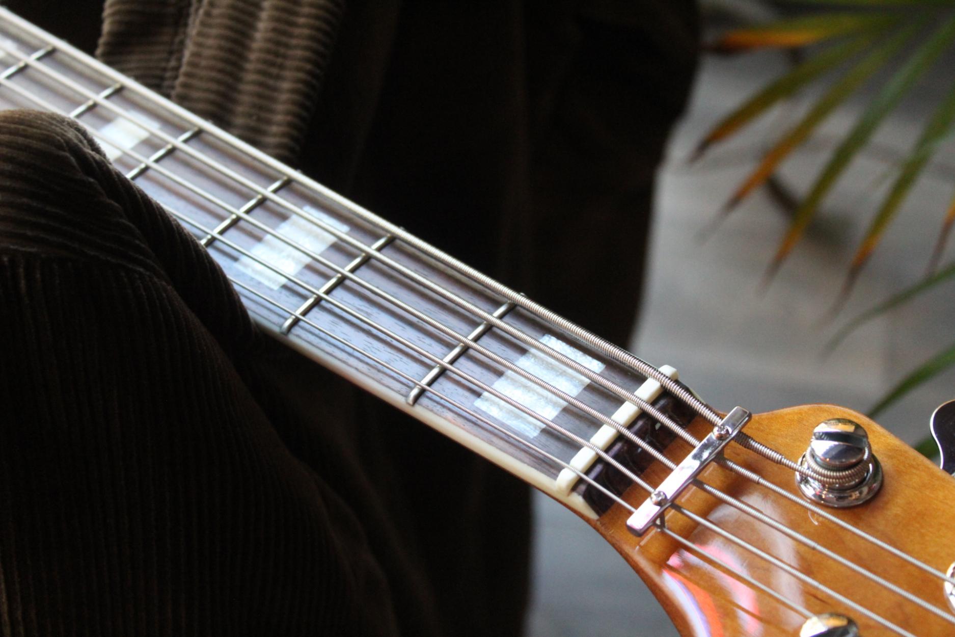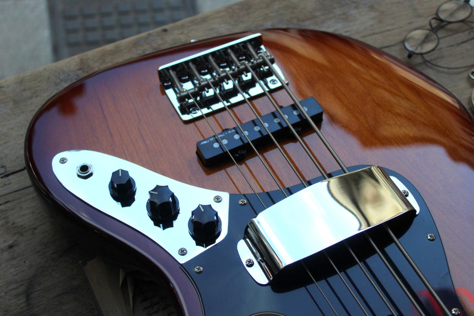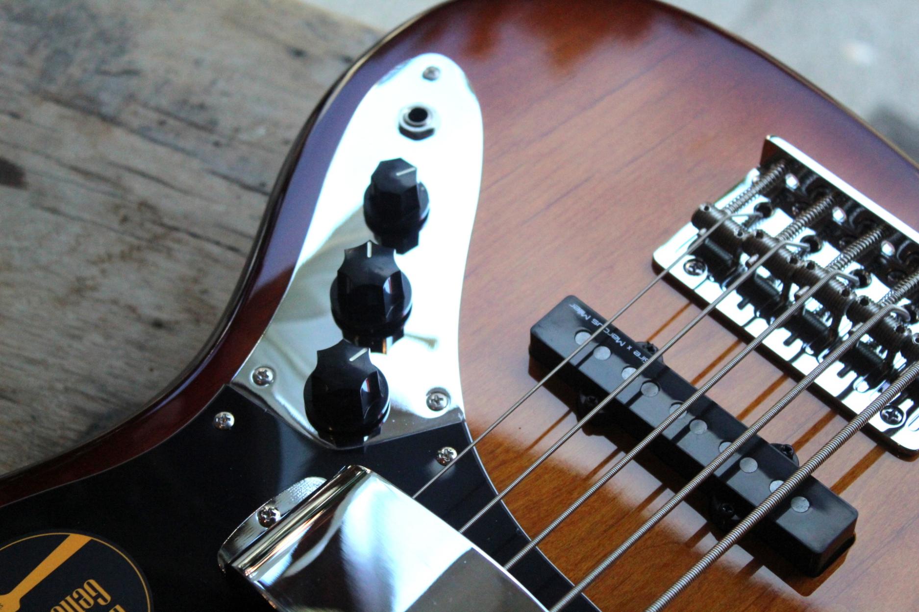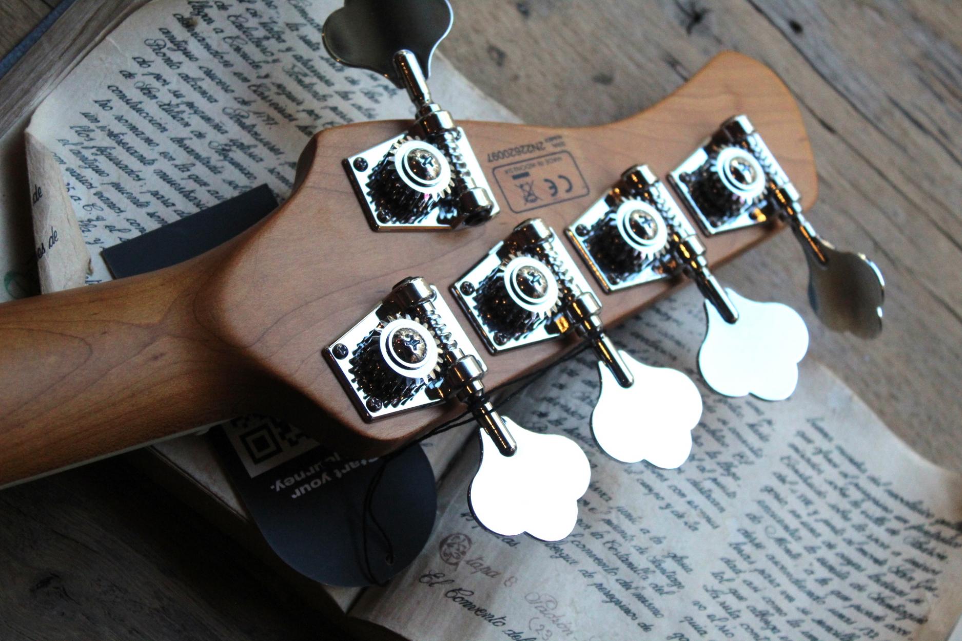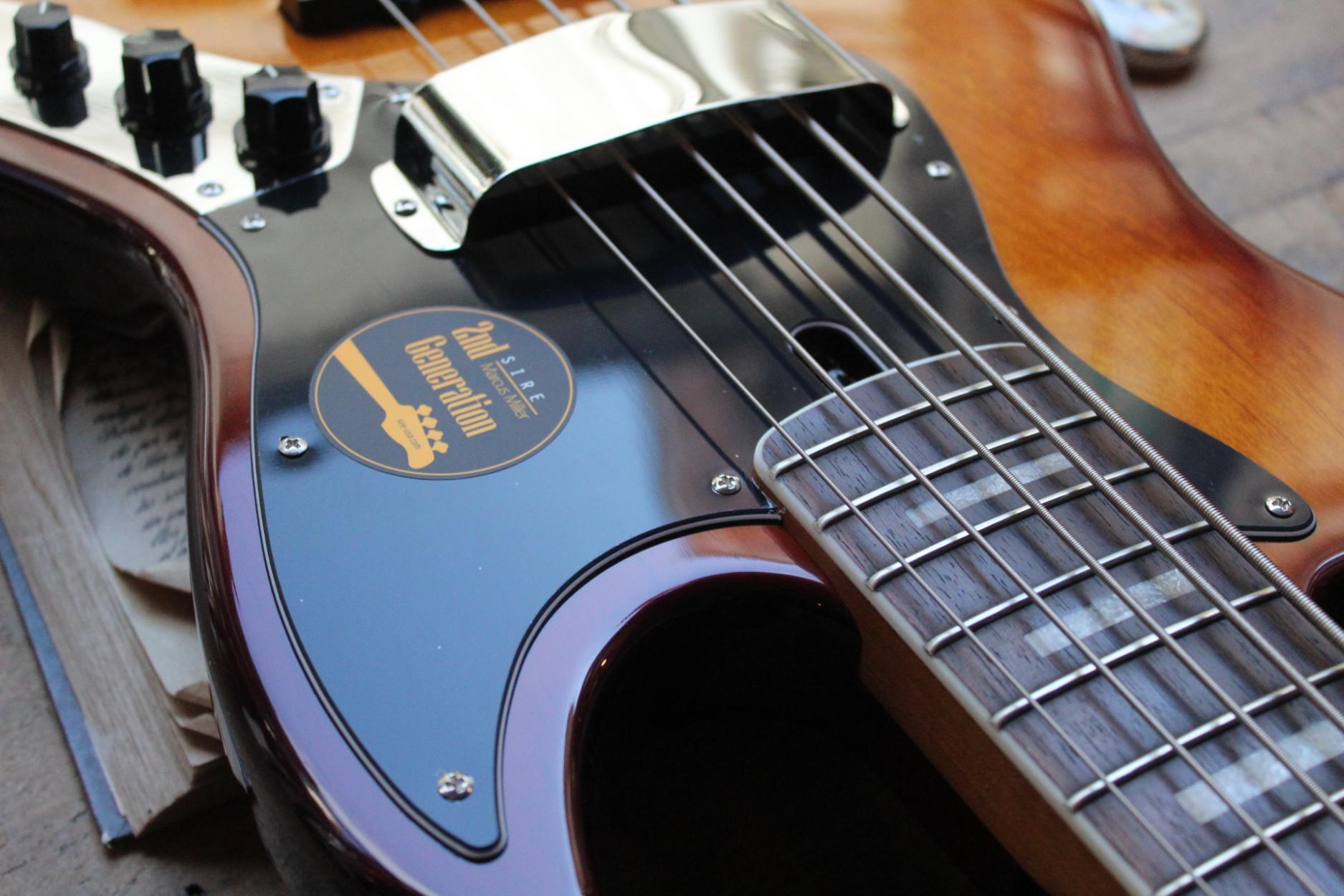 Marcus Miller Bass. 2nd Gen. Five Strings. Body Material : North American Alder. Body Shape : New Marcus Miller Jazz Type. Neck Material : 1 Piece Hard Maple(Satin Finish). Neck Shape : C-Shape. Scale : 34â. Fingerboard (Rolled Edges) : Ebony. Fingerboard Radius : 9.5?. Frets : 2.4 medium. String Nut : 5 String â Natural Bone 46mm width. Binding : 1 ply Ivory. Inlay : WH Pearloid Block. Neck Joint : 4 Bolt Steel Square Plate. Pickups : Marcus Super-J Revolution Set. Electronics : Marcus Heritage-3 with Middle Frequency Control. Controls : Volume / Tone(Dual Pot) Pickup Blender Treble Middle / Middle Frequency (Dual Pot) Bass, Mini Toggle(Active / Passive). Knobs : Plastic Jazz Type in Black. Bridge : Marcus Miller Heavy Mass Standard. Tuning Gear : Premium Open-Gear. Hardware Finish : Chrome. Pick guard : Tortoise. Acabado Tobacco Sunburst.