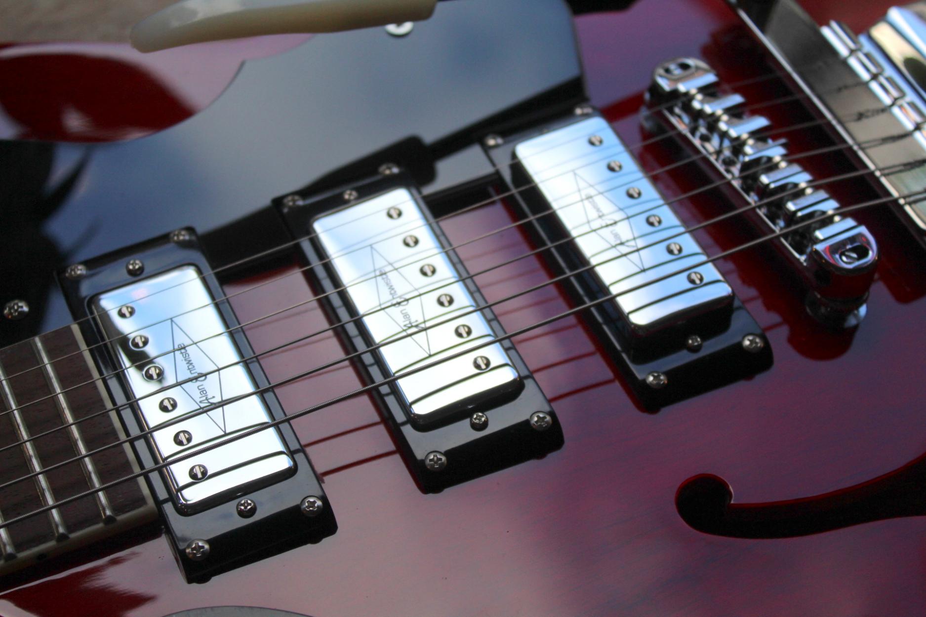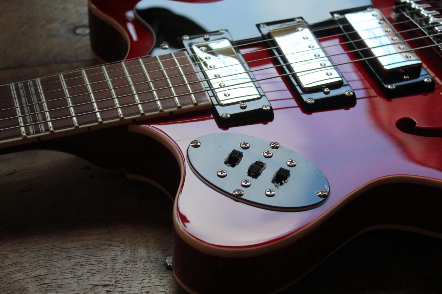 3, 57 KG Fans of big bodied semi-acoustic electric guitars from the 60s, will adore the new Revo Series Superthin with its double bound body, mahogany set neck, 22 fret bound jatoba fingerboard with distinctive patterned inlays and retro vibrato design. Classic style visuals are intensified with a 3-ply scratchplate, Volume, Tone and Bass-Cut switch control panel and individual on/off slide switch panel for the three Entwistle HFS63 mini 'diamond' double coils. With Wilkinson tulip-button machine heads, a precision-cut GraphTech nut and roller bridge, the Revo Supreme has all the class of a 60s semi-acoustic guitar but with a modern approach to playability and sonic versatility. Body: Okoume Semi-Acoustic - Multiple binding top, single binding back. Neck: Mahogany Set Neck Fingerboard: Jatoba Frets: 22 Medium Jumbo Scale Length: 24.75" / 628mm Tuners: Wilkinson® WJ44 Bridge: Roller Vibrato: Vintage Style Pickups: 3 Alan Entwistle HFS63 mini 'diamond' double coils Controls: Volume, Tone 1, Tone 2 Mid Control. 3 On/OFF pickup slide switches, Bass Cut slide switch Top Nut: GraphTech®