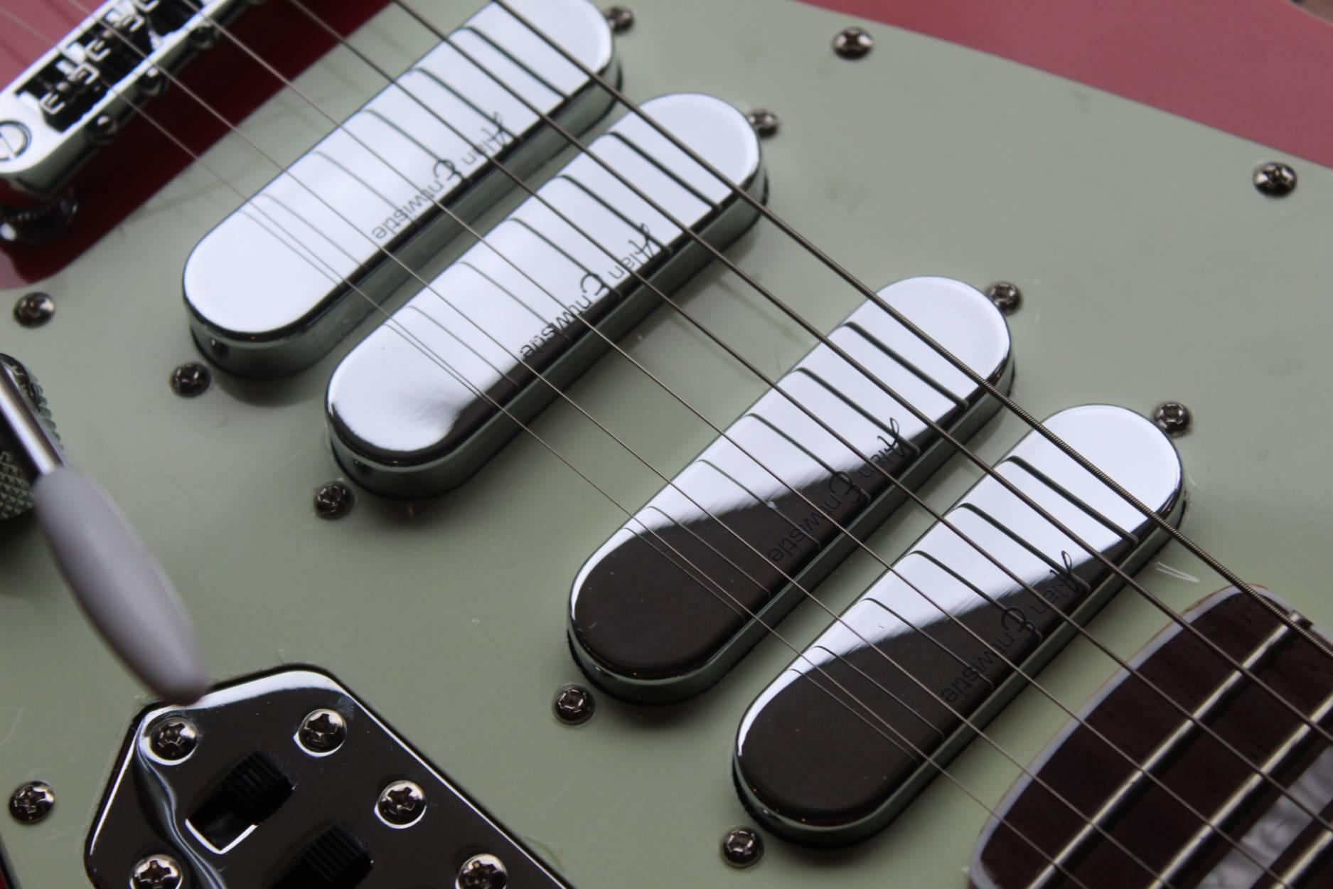 The Vintage Revo semi-hollow Surfmaster Quad replicate the unending appeal of the offset solid bodied guitars, feature stunning visuals and highly individual electronics. With a quartet of Entwistle RTS3 Astrosonic pickups each with individual on/off switches, the Surfmaster Quad available in Black, Metallic White and Firenza Red, offers an incredible 15 pickup combinations and, when combined with the ATN Variator system total a staggering 75 possible tonal options from one guitar, whilst the Surfmaster Twin, with a pair of Entwistle low-noise double coils also looks stunning finished in Boulevard Black or Metallic White. Body: Okoume – Thinline Offset Neck: Maple – Bolt On Fingerboard: Bound Jatoba, Block inlays Frets: 22 Medium Jumbo with Zero Fret Scale Length: 24.75" / 628mm Tuners: Wilkinson® E-Z-Lok™ Bridge: Roller Vibrato: Vintage Offset Pickups: 4 Alan Entwistle ETS3 Astrosonics Controls: Volume/Tone with 4 slide switches and ATN5 Variator Top Nut: GraphTech® The 'Surfmaster™' is an original Vintage® REVO Series™ guitar, designed and created by the UK Vintage design team and Alan Entwistle.