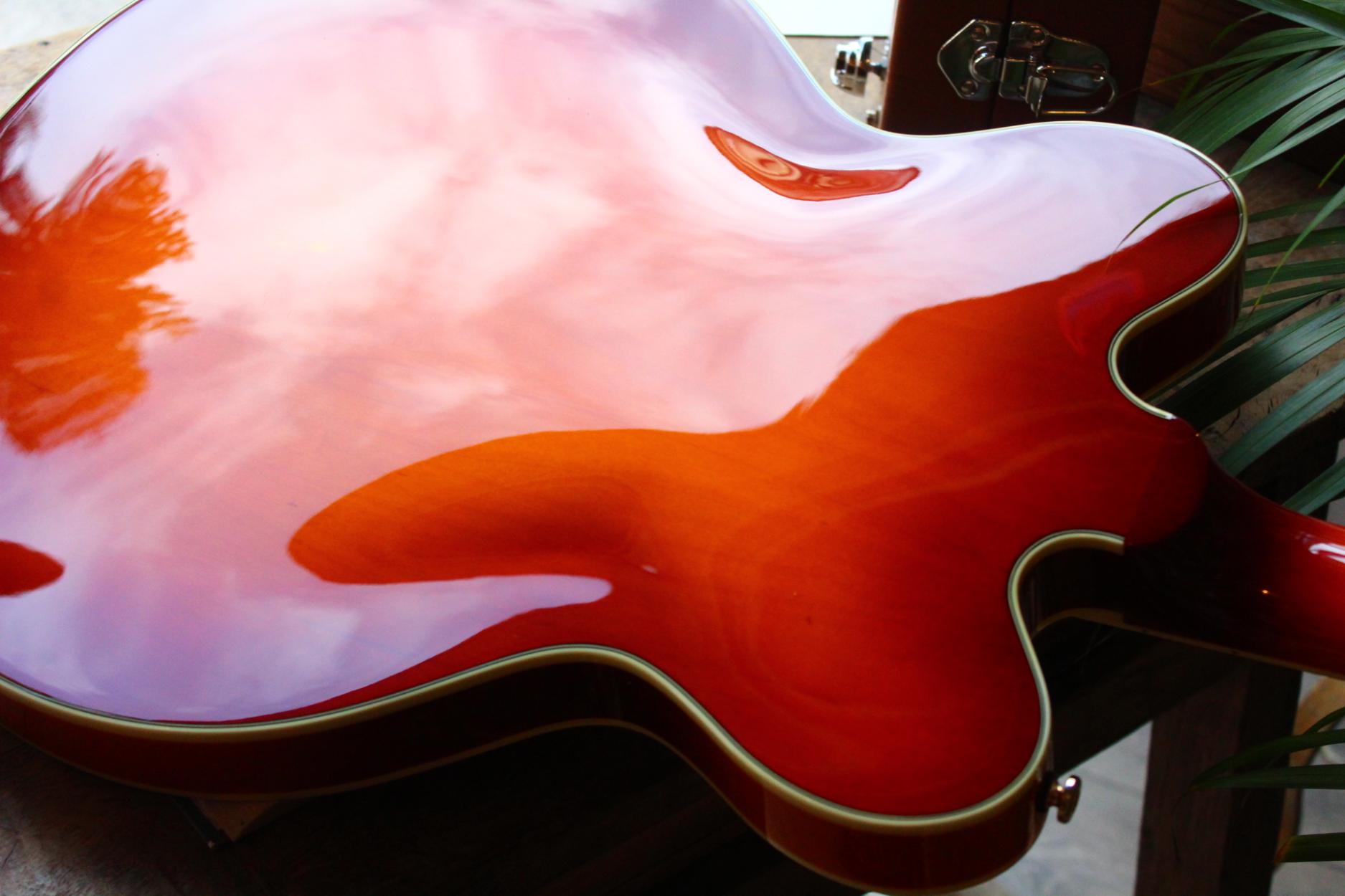 The Gretsch FSR Streamliner Center Block Cat-Eye in Abbey Ale combines classic Gretsch style and tone with modern elements to produce a versatile instrument designed for performance. This Gretsch FSR Streamliner is equipped with triple Broad'Tron BT35 humbuckers for a clear, fully articulated and deep sound. With a smooth "C" neck profile, Laurel tuning, medium jumbo frets, chambered center block frame, Bigsby bridge, and a beautiful bright Maple Abbey Ale, the FSR Streamliner has many features.