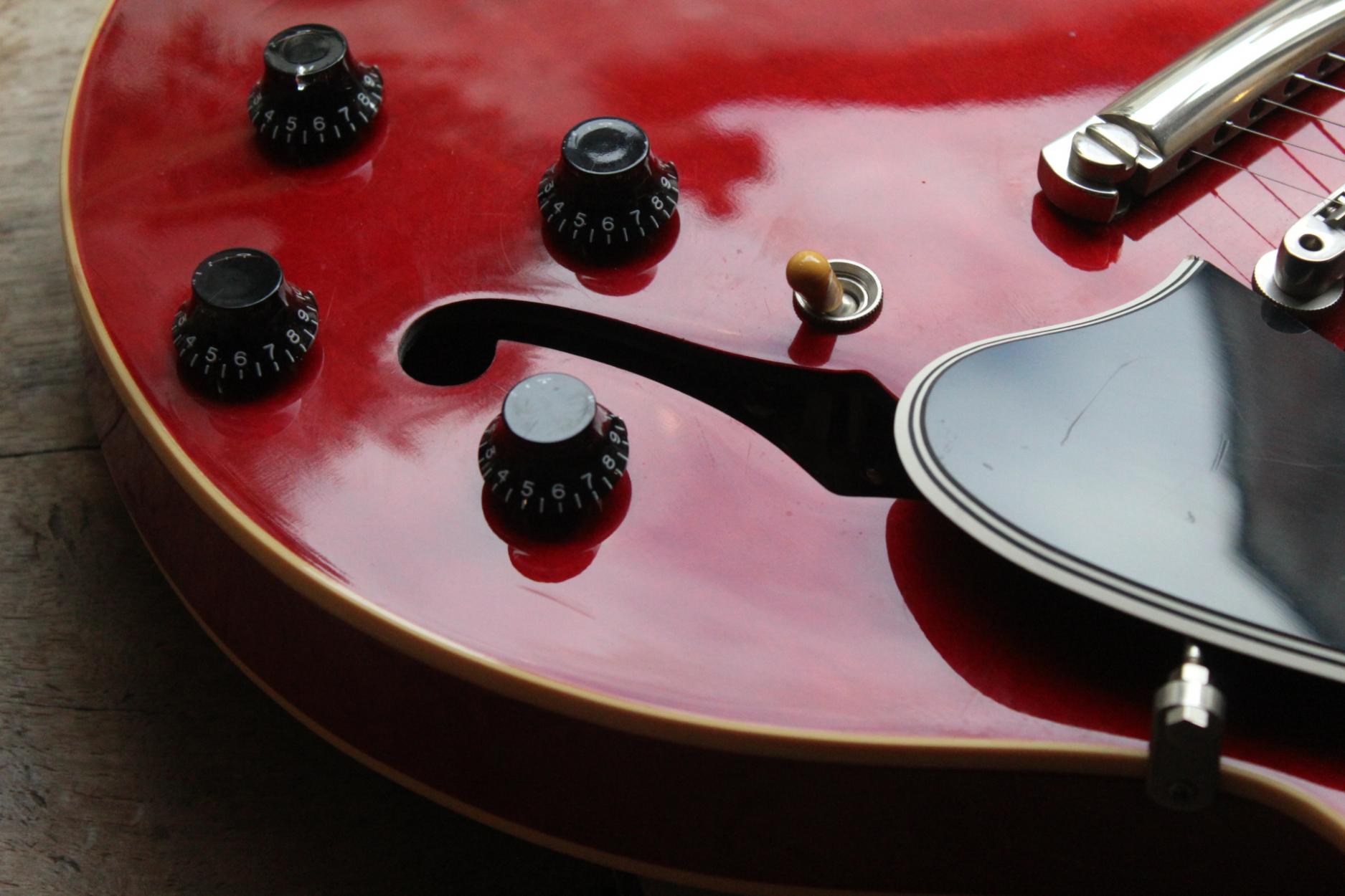 3, 87 KG The Gibson ES-335 is a semi-hollow body semi-acoustic guitar introduced by the Gibson Guitar Corporation as part of its ES (Electric Spanish) series in 1958. It has a solid maple wood block running through the center of its body with hollow upper bouts and two violin-style f-holes cut into the top over the hollow chambers.[1] Gibson has released numerous variations and models based on the ES-335. The ES-335 is manufactured at the Gibson Nashville facility, as of 2024. It was also produced at Gibson Memphis from 2000 until the facility closed in 2019.[2][3] History[edit] Until 1952, Gibson produced only hollow-body guitars, which are prone to feedback when amplified loudly. That year saw the introduction of their first solid-body, the Gibson Les Paul, a significantly different instrument from Les Paul's early electric guitar experiment, "The Log", which consisted of a center block with detachable chambers on both sides,[4][5] a neck, hardware, and a pickup attached. By 1958, Gibson was making a few solid-body models that had much lower feedback and better sustain but lacked the darker, warmer tone and unamplified volume of hollow bodies. The ES-335 was an attempt to find a middle ground: a warmer tone than a solid body produced with almost as little feedback. Though semi-hollow-bodies like the ES-335 are essentially a compromise of earlier designs, they are for this reason extremely flexible, as shown by the ES-335's popularity in a wide range of music, including blues, jazz, and rock. Initially offered at a basic price of $267.50, it quickly became a best-seller, and has been in continuous production since 1958.
