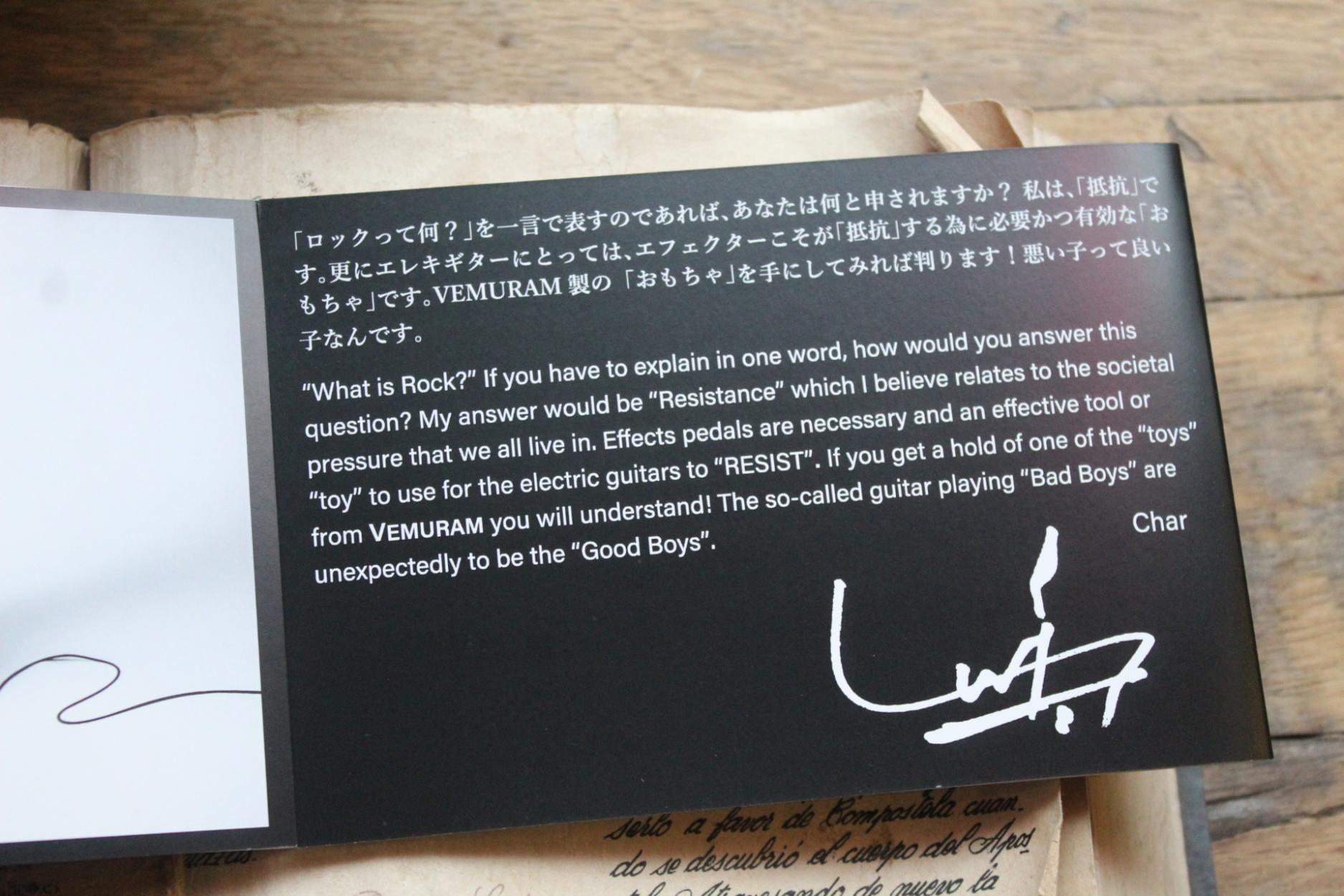 The Signature Overdrive Pedal of Japanese Guitar Legend Char Product Description Experience the ultimate evolution in overdrive with the Spiritone, a collaboration between Vemuram and one of the finest guitar players in Japan - Char! Elevate your sound with this meticulously designed masterpiece. The Spiritone delivers anything from warm vintage tones all the way to aggressive punchy overdrive. Inspired by iconic pedals such as the legendary Klon Centaur and Char’s signature sound gear, this expressive medium-gain overdrive boasts dual-channel versatility, fine-tuned tone controls, and stunning levels of craftsmanship. Key Features Dual Sound Channels - Switch between vintage warmth and bright, punchy tones with independent Level controls for ultimate flexibility. Customisable Controls - Fine-tune your tone with Treble, Bass, Gain and buffer toggle for maximum adaptability. Premium Components - Features N.O.S. components, custom switches, and exclusive Bakelite knobs for unparalleled quality and style. Who is Char? Hisato Takenaka, known professionally as "Char", is a Japanese musician, singer-songwriter and record producer. He is considered one of Japan's greatest guitar players! Here's what Vemuram say:Two Sound Tunings Intergrated Into One Pedal Of the many prototypes created during the year-long development process, there were two prototypes which Char was particularly focusing. The circuits of these two are slightly different but almost similar. However, due to the differences in tuning/tweaking of the components and constants used, the “tone” and “nuances” were very different. Char himself could not decide which prototype was better until the very end. He wanted both sounds in his actual live and gigging situation; as a result, we decided to integrate two sounds/tone into one luxurious unit. The first sound/tone has a vintage tone and feel, while the second channel, the B-channel (bright channel), is brighter, aggressive, and powerful with a punchier attack. Each has its own LEVEL (volume) controls and allows you to go back and forth between the two with the foot switch controls. Fine-Tune Your Sound Besides the main controls of the SPIRITONE, the SAT (saturation) trimmer function allows fine-tuning of the saturation-like sound generated by the power tubes of the tube amplifiers. An ON/OFF toggle switch for the input buffer circuit. The SAT (saturation) can be finely adjusted according to the combination of the equipment/gear used and adapting to the live venue. Specifications Transistors: Custom-designed circuitry Controls: LEVEL, TREBLE, BASS, GAIN, LEVEL B-ch, SAT (Saturation) Trimmer Switches: ON/OFF, B-ch toggle, BUFFER ON/OFF Power: 9V battery or regulated AC/DC adapter (centre negative) Size: 157(W) x 103(D) x 53(H) mm Weight: 815g Current Draw: 28 mA