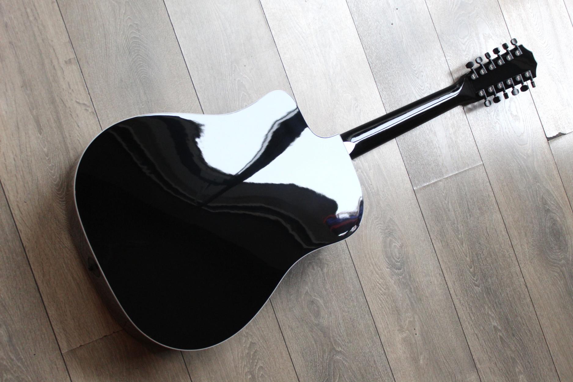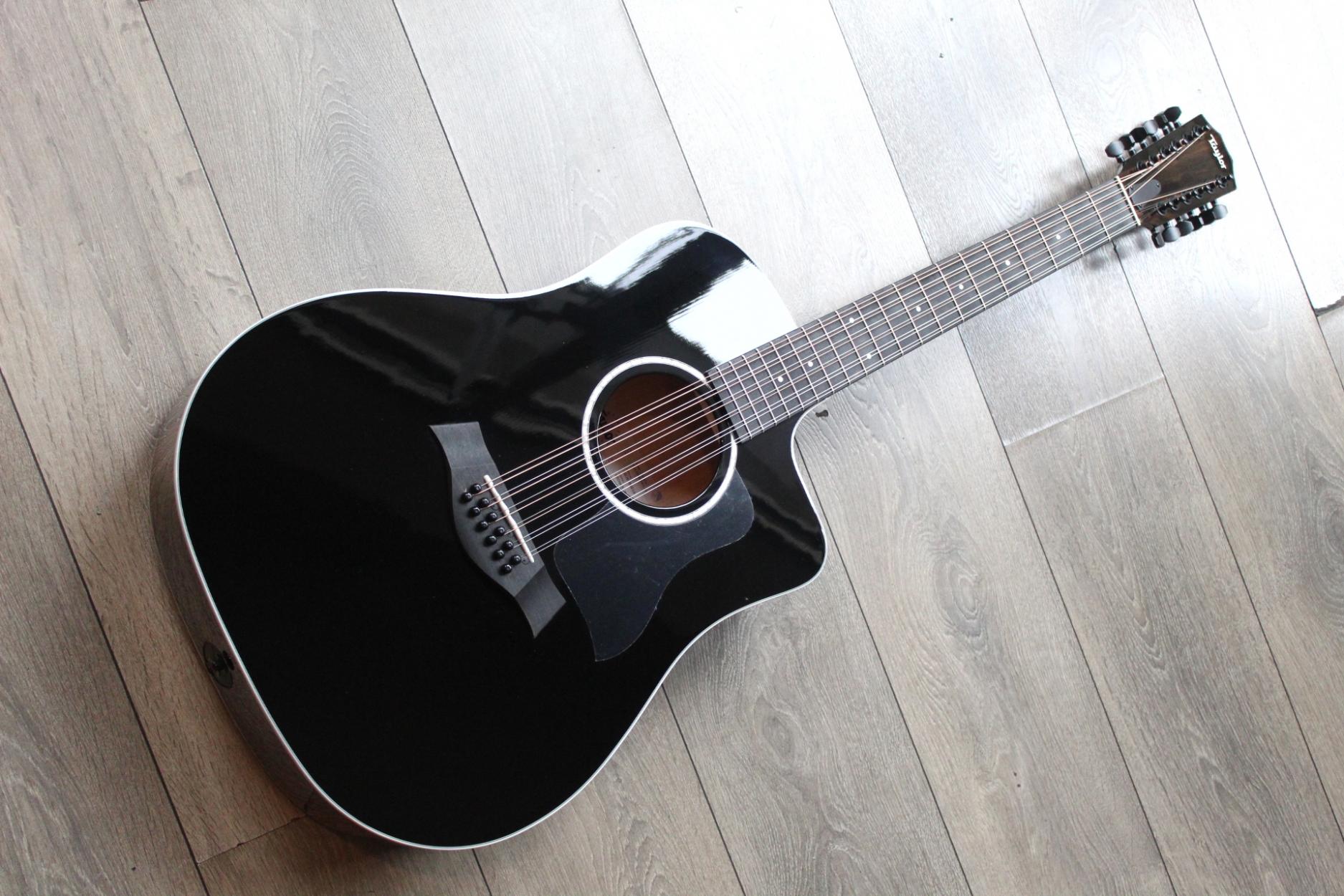 250ce-BLK Plus The acoustic-electric 12-string 250ce-BLK Plus offers an alternative sonic flavor for players seeking a new addition to their repertoire, as well as a stylish aesthetic to capture the spotlight. Made with layered maple back and sides, this Dreadnought 12-string features a solid Lutz spruce top, which generates strong projection and a rich octave shimmer. Newer players or those with smaller hands have nothing to fear thanks to the slim Taylor Neck, which makes it easier to hold notes and chords. Striking appointments include a full-body glossy black finish, crisp white binding and satin black tuning machines. The 250ce-BLK Plus ships with built-in ES2 electronics and a deluxe hardshell case.