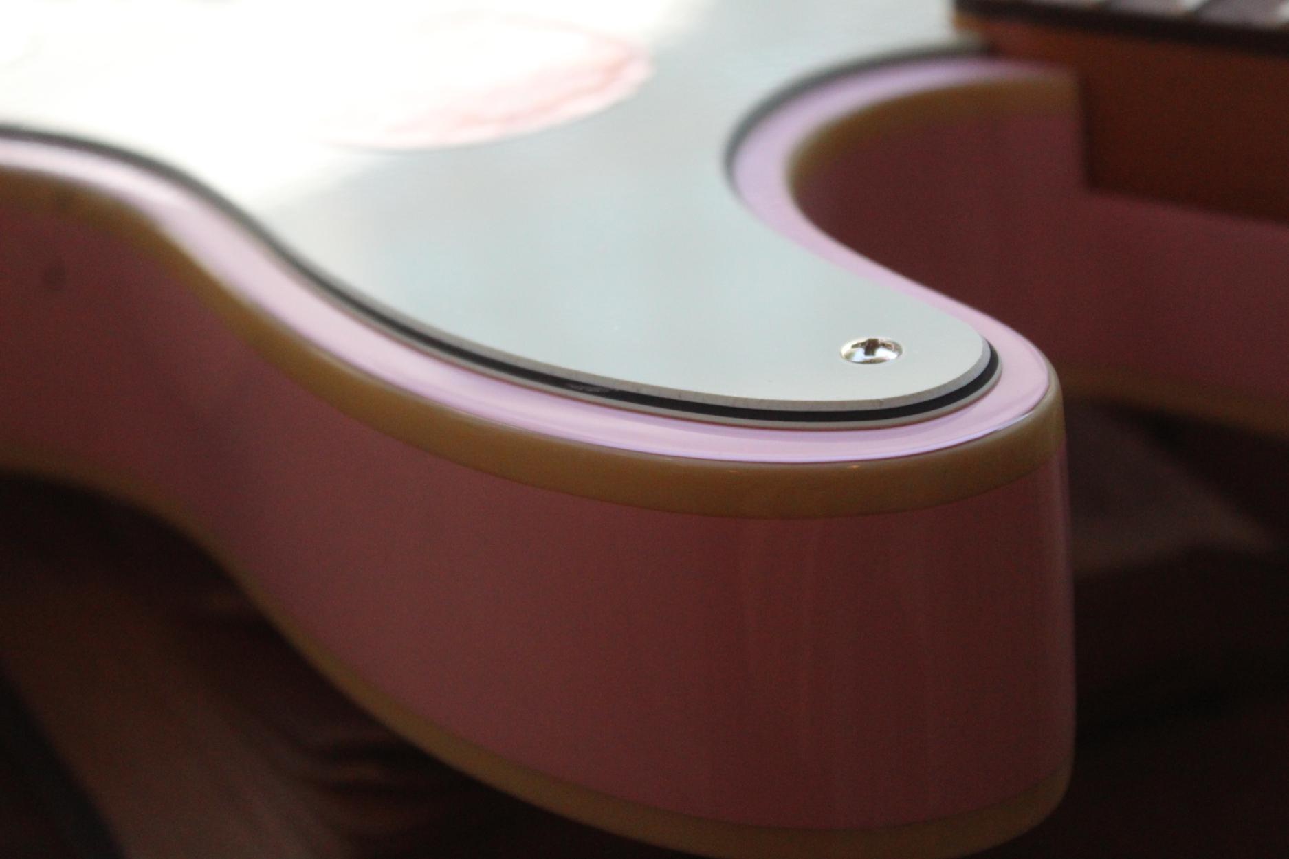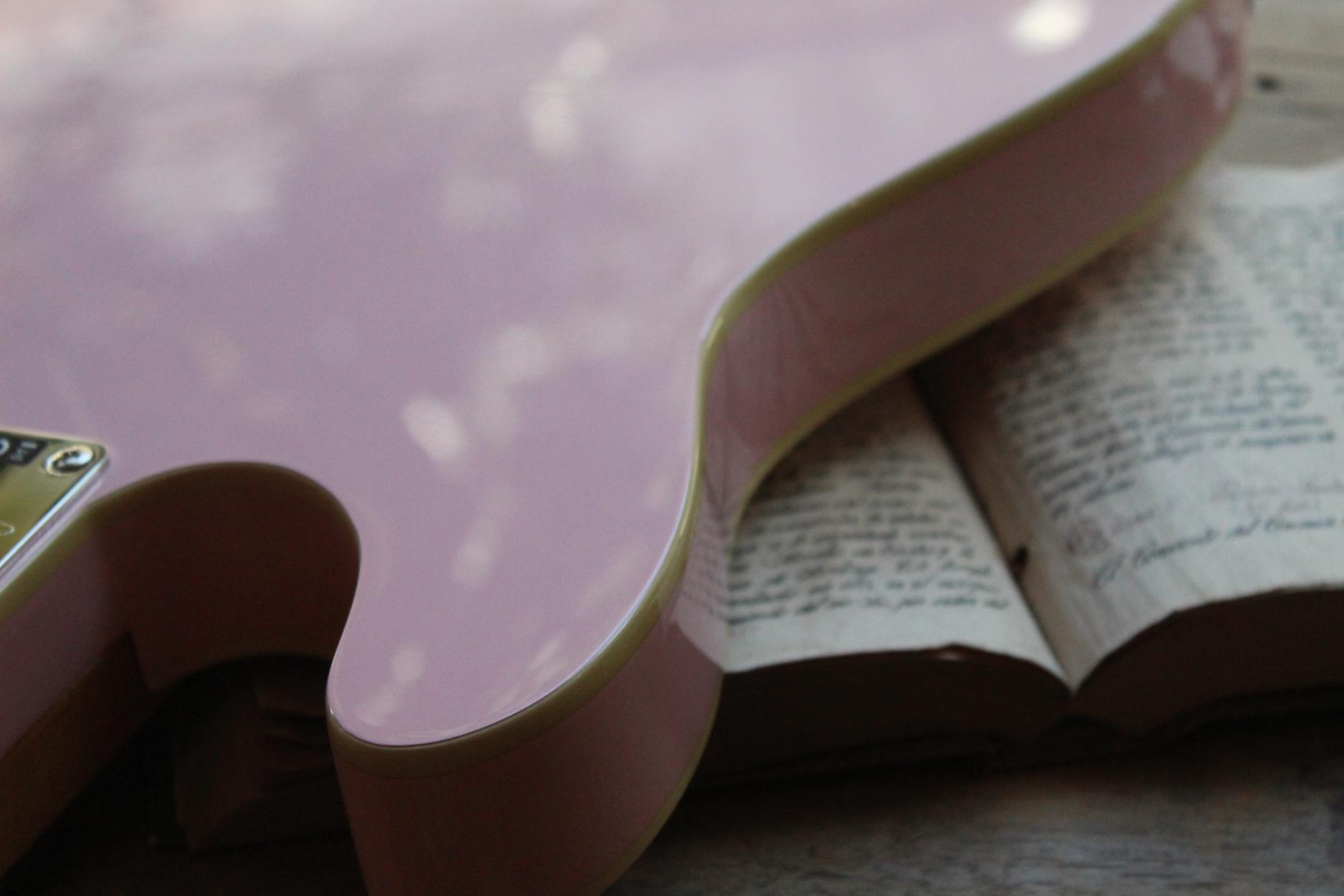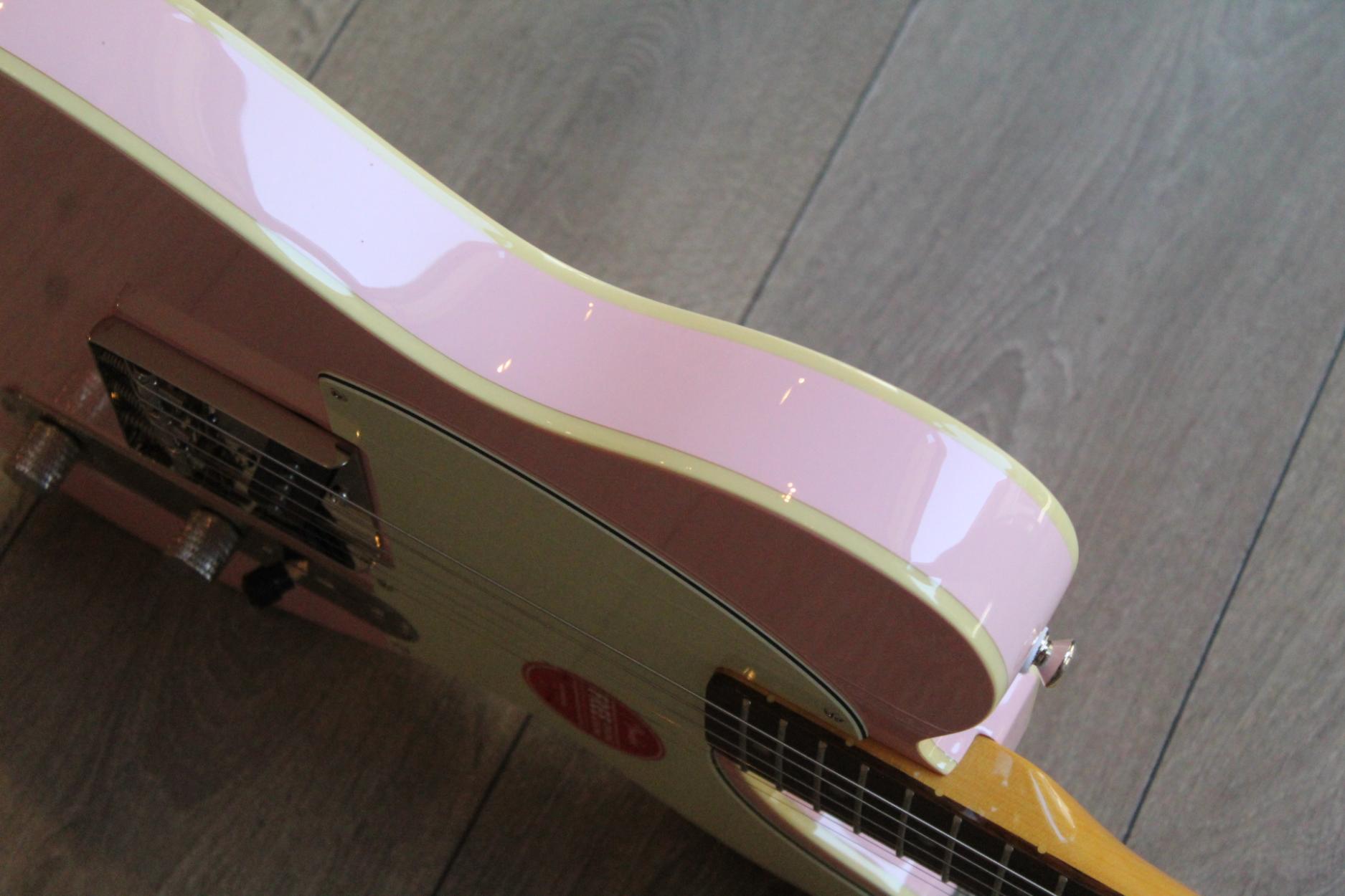 Body: Poplar Bolt-on neck: Maple Fingerboard: Laurel White dot fingerboard inlays Fingerboard radius: 241 mm (9.5") Scale: 648 mm (25.5") Nut width: 42 mm (1.650") Bone nut Neck profile: C 21 Narrow tall frets Pickups: Fender Designed Alnico Single Coil (bridge) Master volume knob, master tone knob 3-Way switch 3-Ply mint green pickguard 3-Saddle vintage-style Tele bridge with strings-through-body and chrome-platedd barrel saddles Vintage style machine heads Nickel hardware Strings: Nickel Plated Steel .009 - .042 Colour: Shell pink