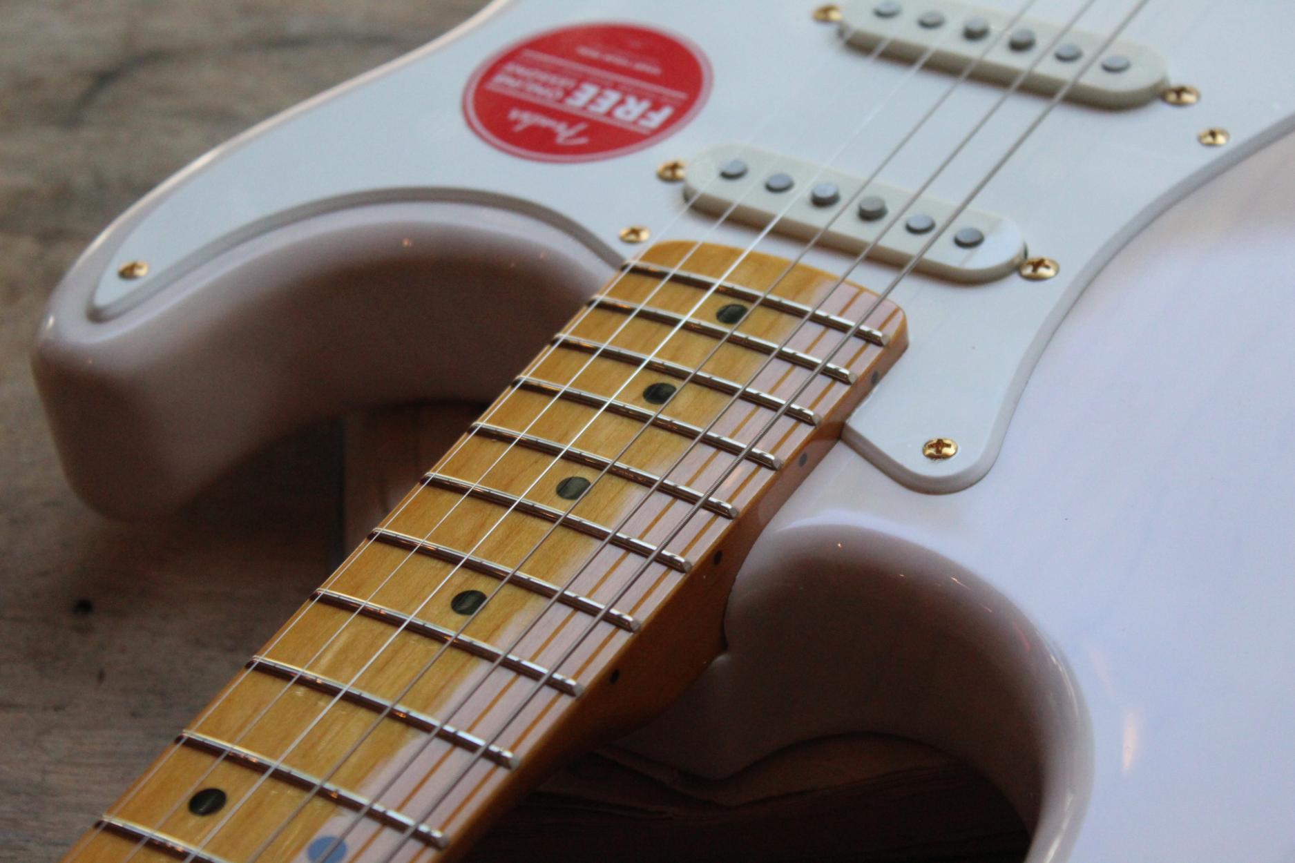 The Classic Vibe Stratocaster '50s provides unmistakable '50s-era Fender vibe and tone. The vintage-tint gloss-maple neck has a maple Fingerboard with 21 medium-jumbo frets and a modern 9.5" radius. That long-familiar tone comes from a custom set of alnico III single-coil pickups, clear and bright, with terrific sustain even in crunch mode. Custom staggered polepieces provide improved string-to-string balance. SPECIFICATIONS: BODY Body Material: Alder Body Finish: Gloss Polyester Body Shape: Stratocaster NECK Neck Material: Maple Neck Finish: Gloss Polyester Neck Shape: Modern "C" Scale Length: 25.5" (648 mm) Fingerboard Radius: 9.5" (241 mm) Number of Frets: 21 Fret Size: Medium Jumbo Nut Material: Synthetic Bone Nut Width: 1.650" (42 mm) Position Inlays: Black Dot ELECTRONICS Neck Pickup: Custom Vintage Style Single-Coil Strat Middle Pickup: Custom Vintage-Style Single-Coil Strat Bridge Pickup: Custom Vintage-Style Single-Coil Strat Pickup Switching: 5-Position Blade: Position 1. Bridge Pickup, Position 2. Bridge and Middle Pickup, Position 3. Middle Pickup, Position 4. Middle and Neck Pickup, Position 5. Neck Pickup Pickup Configuration: S/S/S Controls: Master Volume, Tone 1. (Neck Pickup), Tone 2. (Middle Pickup) HARDWARE Hardware Finish: Gold Bridge: 6-Saddle Vintage-Style Synchronized Tremolo Tremolo Arm: Vintage-Style Tremolo Arm Tuning Machines: Vintage-Style Switch Tips: Aged White Pickguard: 1-Ply White , Gold Anodized Aluminum Control Knobs: Aged White Plastic Neck Plate: 4-Bolt Standard MISCELLANEOUS Strings: Fender USA Super 250L, NPS (.009-.042 Gauges) Other Features: Aged White Knobs, Pickup Covers and Switch Tip, Black Dot Position Inlays, Vintage Styling, Synthetic Bone Nut