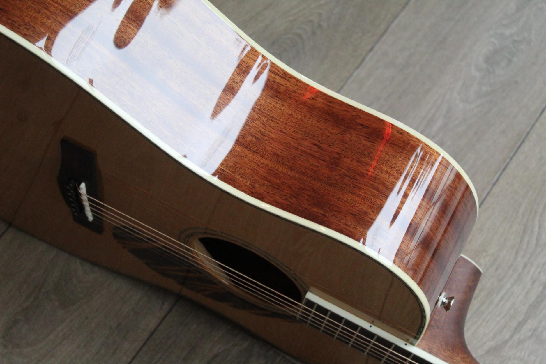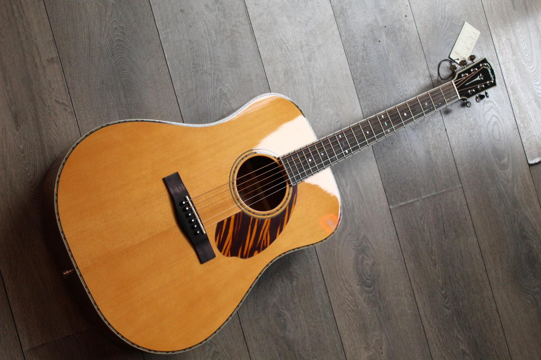 La Paramount PD-220E combina artesanía de vanguardia con detalles de inspiración vintage, ofreciendo lo mejor de ambos mundos. Construida con la elección de una tapa de abeto macizo o caoba maciza combinada con aros y fondo de caoba maciza, la PD -220E cuenta con un patrón de refuerzo de varillas internas compensado en X que ha sido cuidadosamente refinado para optimizar la resonancia y el tono Una nueva pastilla Sonitone Plus diseñada por Fender y Fishman amplifica el tono completo y equilibrado de la forma del cuerpo Dreadnought de la PD-220E, mientras que los controles montados en la boca conservan la estética vintage. Debajo de la tapa harmónica, una pastilla sensible mejora las vibraciones de la caja de resonancia que se puede combinar con la pastilla Sonicore debajo del puente. Los detalles cosméticos actualizados incluyen incrustaciones de perla en forma de copo de nieve en el diapasón, filetes de plumas, rosetas y tiras traseras, y un golpeador Black o Tiger Stripe. La PD-220E también cuenta con un puente y diapasón de ovangkol, mástil de caoba delgado, cejilla y selleta de hueso, y viene con un estuche rígido. Características Patrón de refuerzo interno actualizado Tapa maciza de abeto o caoba; aros y fondo de caoba maciza New Fender/Fishman® Sonitone Plus pickup with piezo and transducer Nueva pastilla Fender/Fishman Sonitone Plus con piezo y transductor Incrustaciones de copos de nieve. Golpeador negro o Tiger Stripe Incluye estuche rígido.