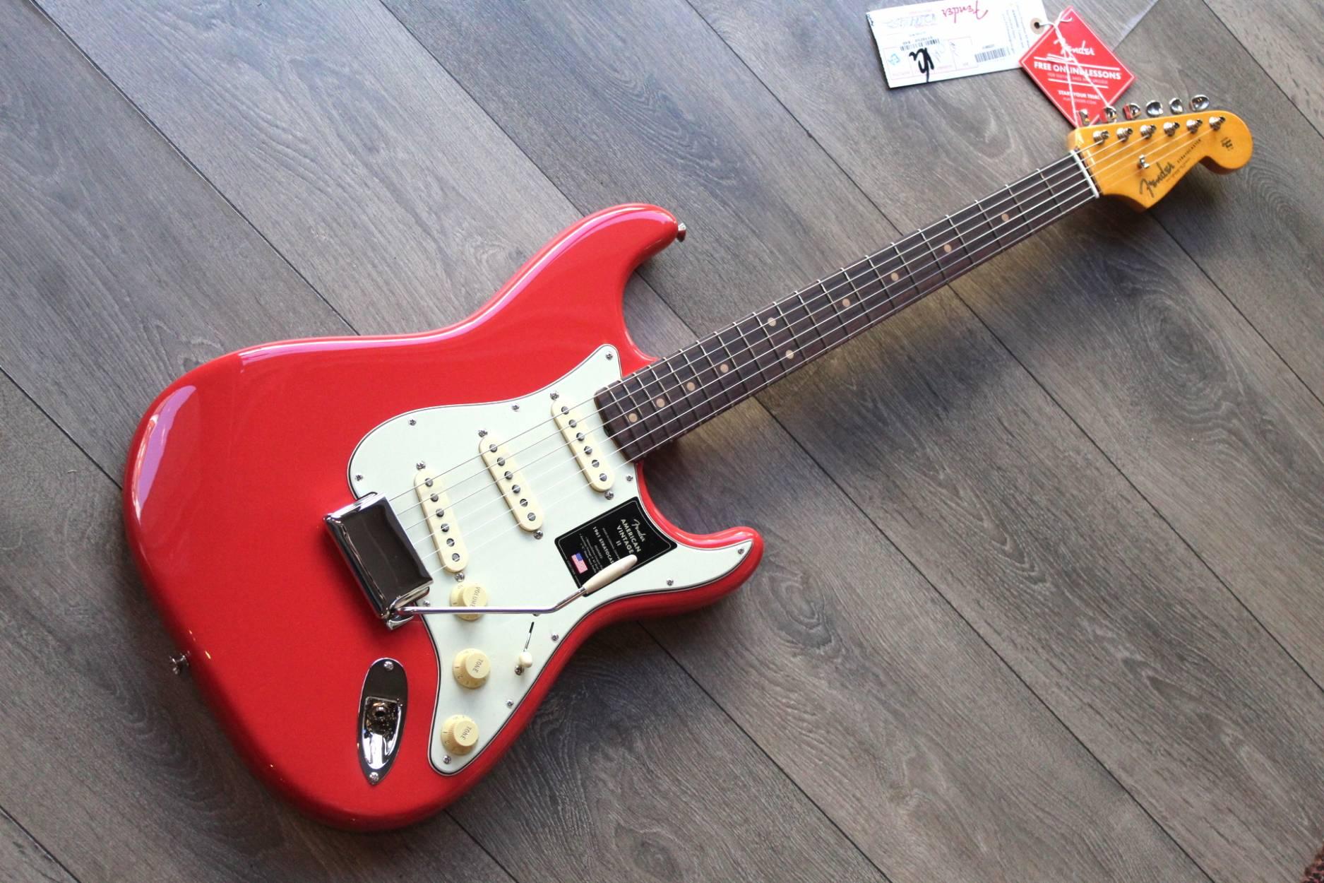The Fender® American Vintage II series presents a remarkably accurate take on the revolutionary designs that altered the course of musical history. Built with period-accurate bodies, necks and hardware, premium finishes and meticulously voiced, year-specific pickups, each instrument captures the essence of authentic Fender craftsmanship and tone. During the late '50s and early '60s, the popularity of Fender musical instruments flourished, and although the Fender assortment had expanded to include many great new instruments, the Stratocaster® reigned supreme. By 1961, the Stratocaster had taken on a more refined aesthetic, with a 3-Color Sunburst reformulated with a more vibrant red and bolder black edge, topped with a 3-ply pickguard accenting the Strat's signature curves. Featuring a premium alder body, a trio of Pure Vintage 1961 Stratocaster pickups and a medium "C"-Shaped maple neck mated with a 7.25" radius slab rosewood fingerboard, the American Vintage II 1961 Stratocaster reproduces the quintessential tone and feel of the original. Other appointments include a vintage-accurate synchronized tremolo with cold rolled steel block and bent steel saddles, single-line "Fender Deluxe" tuners and 3-ply pickguard. The instruments in the American Vintage II series are direct descendants of the original Fenders: designed for players with a fine appreciation for vintage Fender tone and feel and built with unmatched quality, down to the last screw. These are Fender electrics in their purest form: Fender American Vintage II, the stuff of legends. FEATURES Alder Body Gloss Nitrocellulose Lacquer Finish Pure Vintage '61 Single-Coil Strat® pickups "C"-Shaped Neck Profile Slab Rosewood Fingerboard Pure Vintage Synchronized Tremolo with Bent Steel Saddles