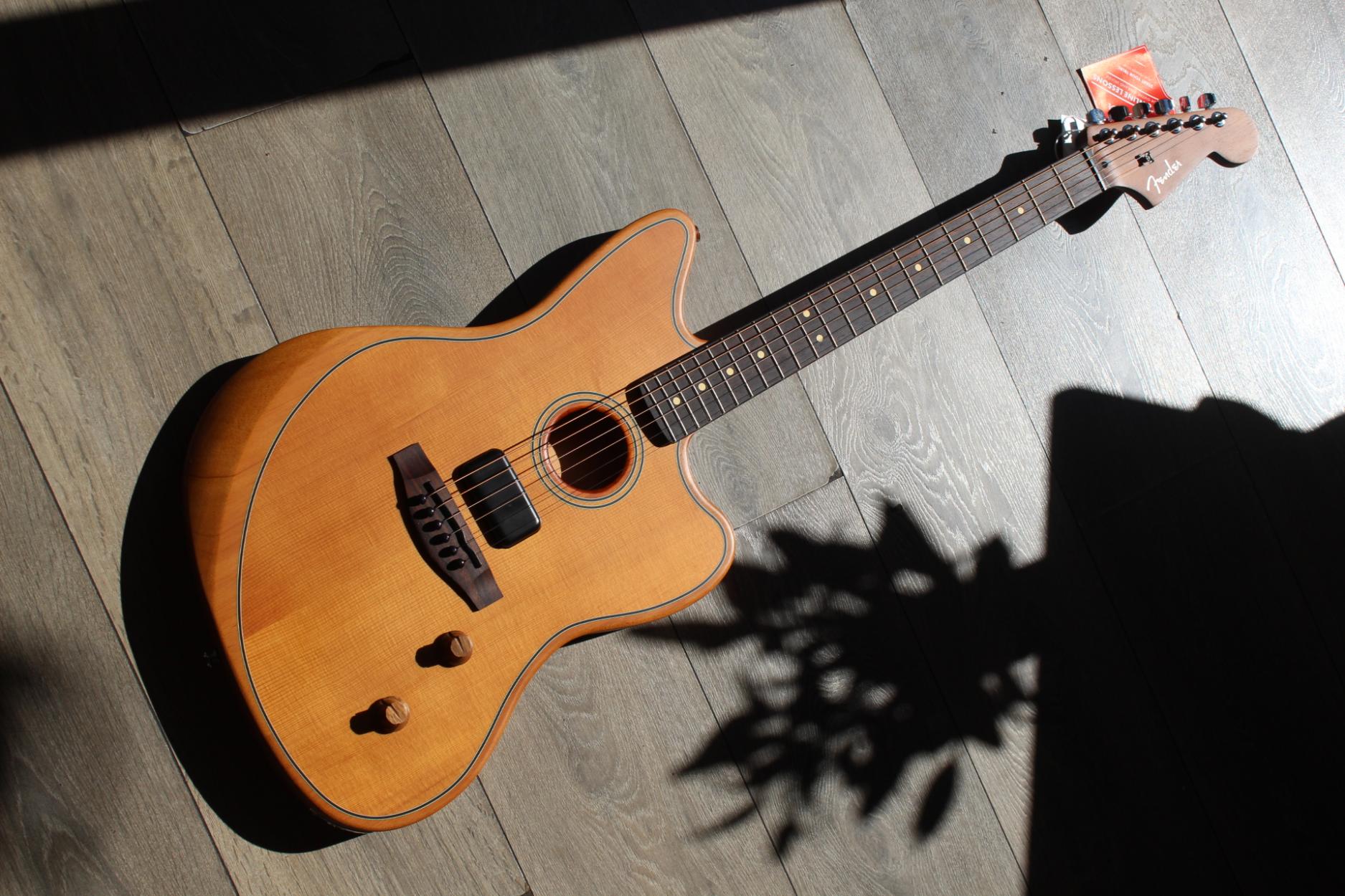 Combining revolutionary acoustic architecture, state-of-the art electronics and legendary Fender® electric guitar designs, the Acoustasonic® family of instruments embodies the spirit of purposeful innovation that Fender was built on. The dual personality of the Acoustasonic Standard Jazzmaster® equips players with a versatile spectrum of acoustic and electric tones in a single creative tool. With a braced solid Sitka spruce top, fully chambered body, inventive Fender and Fishman®-designed analog electronics with volume and blend control, and the familiar playing feel of a Fender icon, this Jazzmaster® truly sets the standard for the Acoustasonic experience. Features Two pickup systems: Fender Acoustasonic Shawbucker™; Fishman® Under-Saddle Transducer Master volume and blend control Integrated forearm and back contours Solid Sitka spruce top, nyatoh body and neck Rosewood fingerboard and bridge