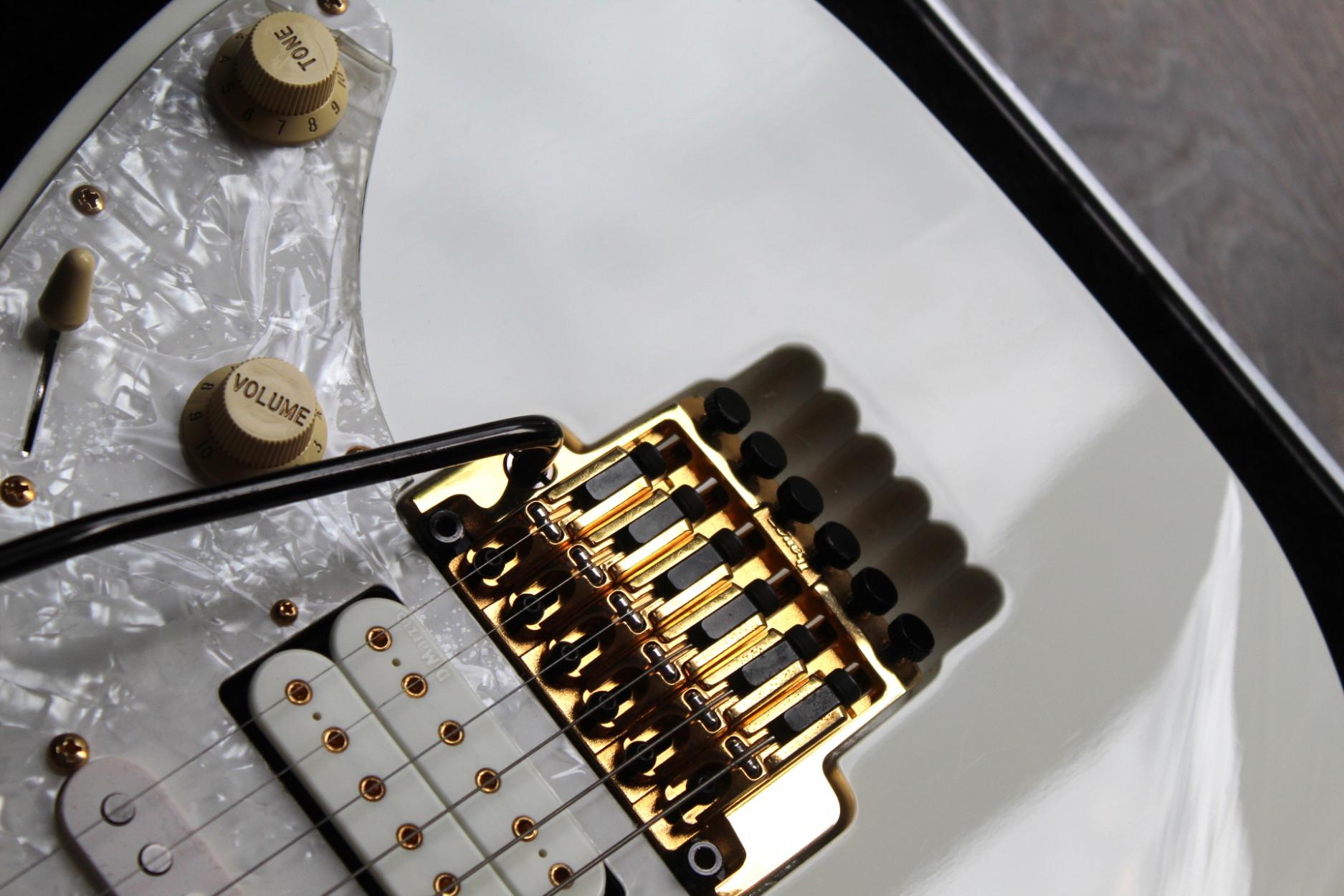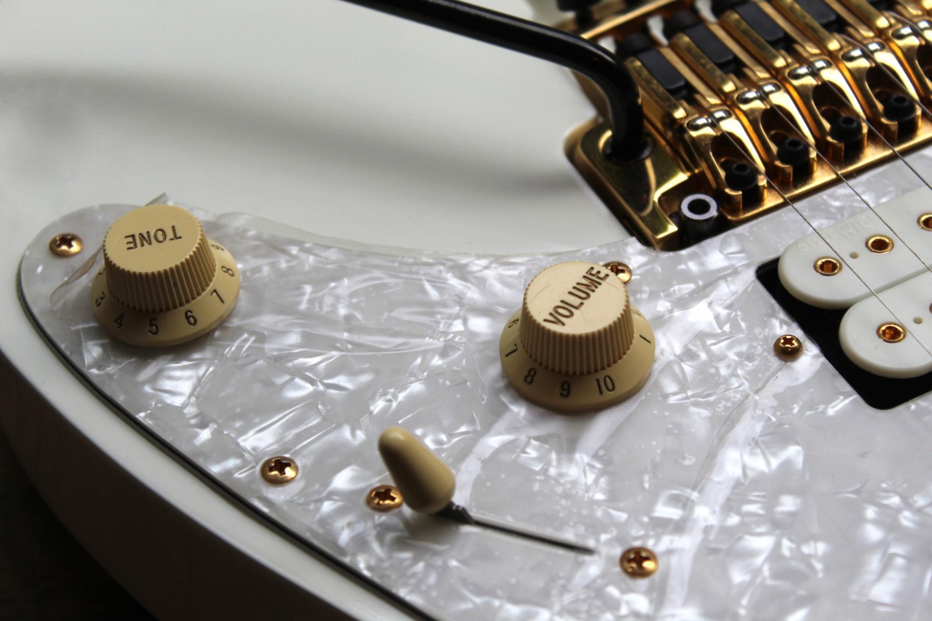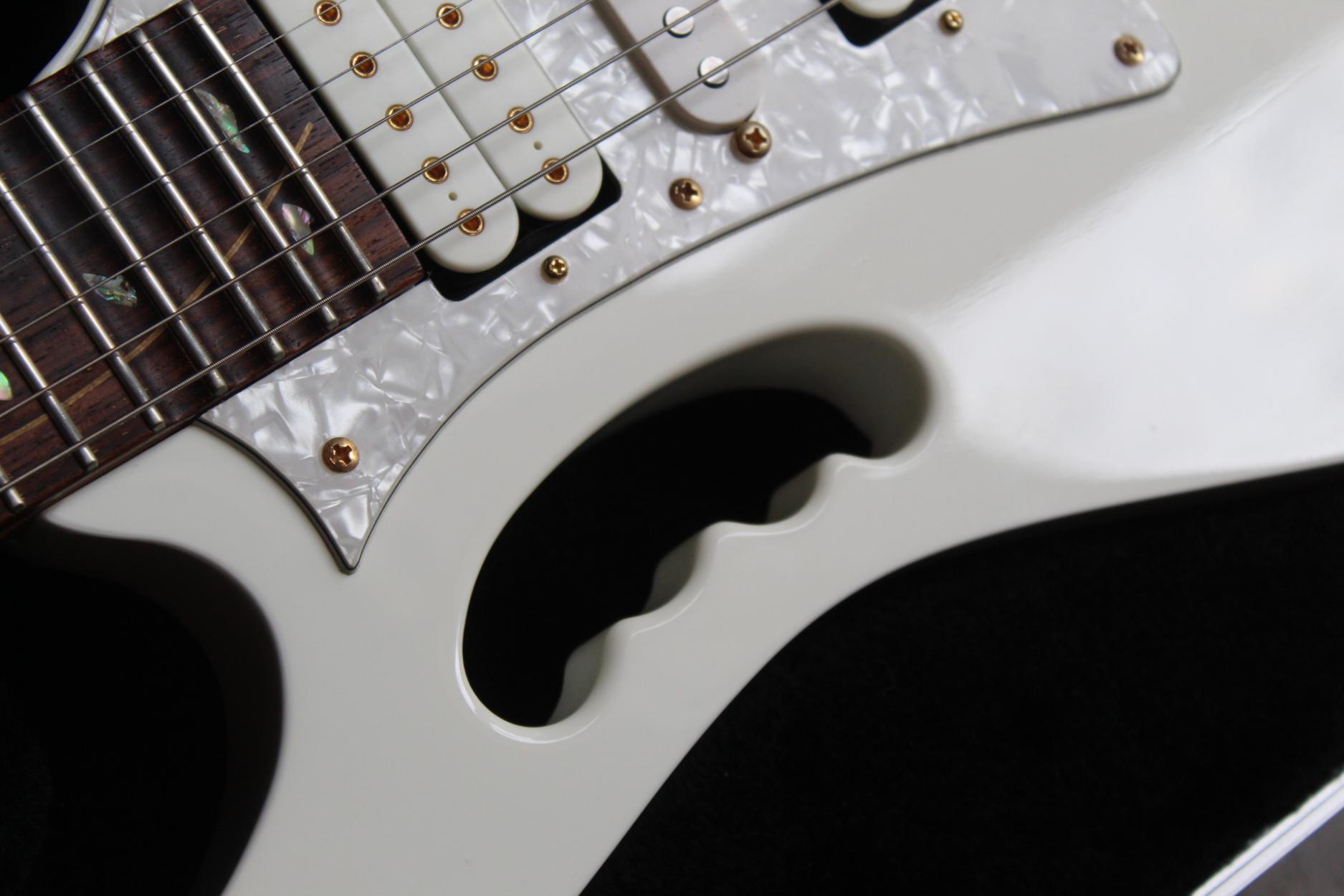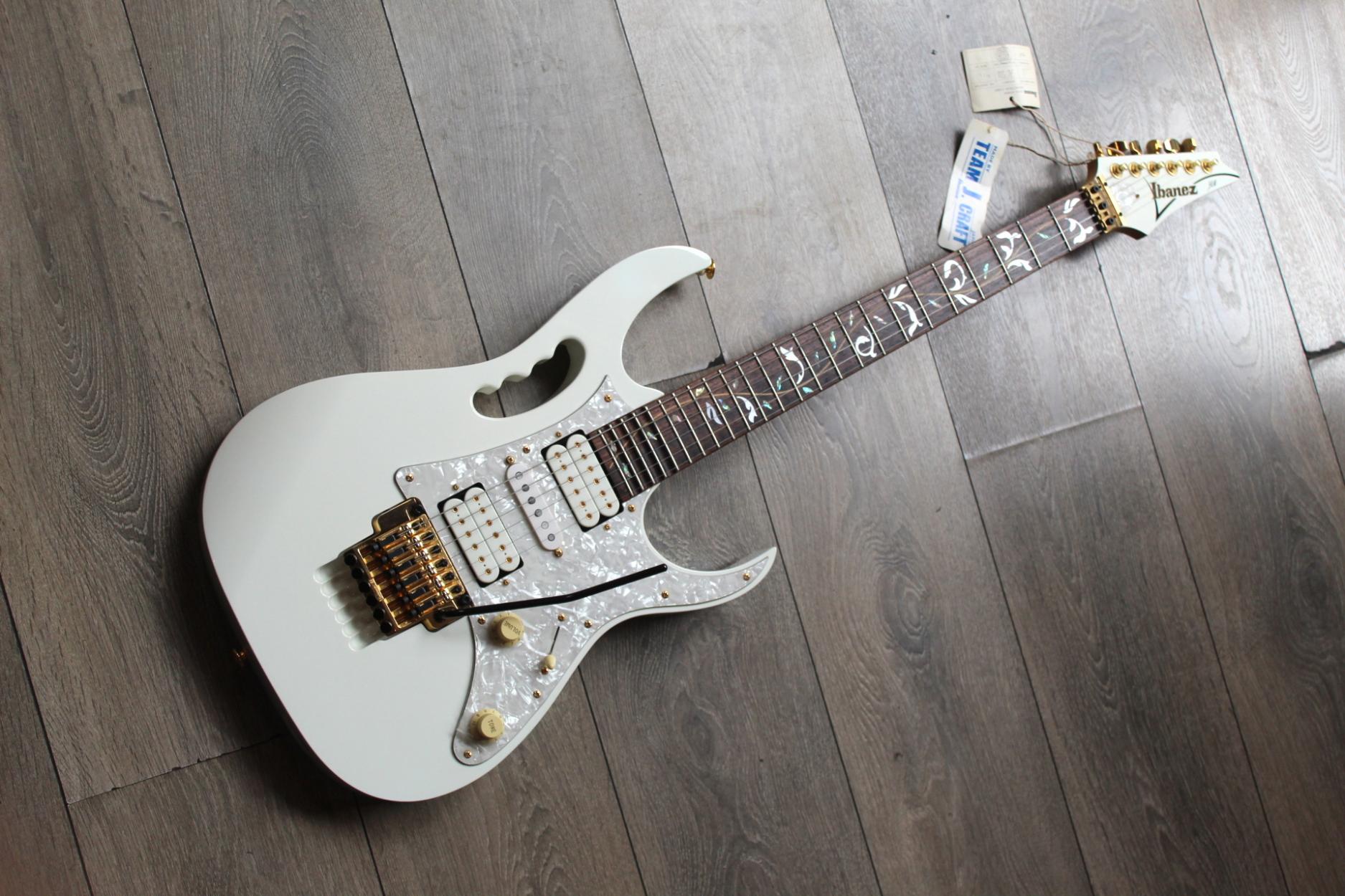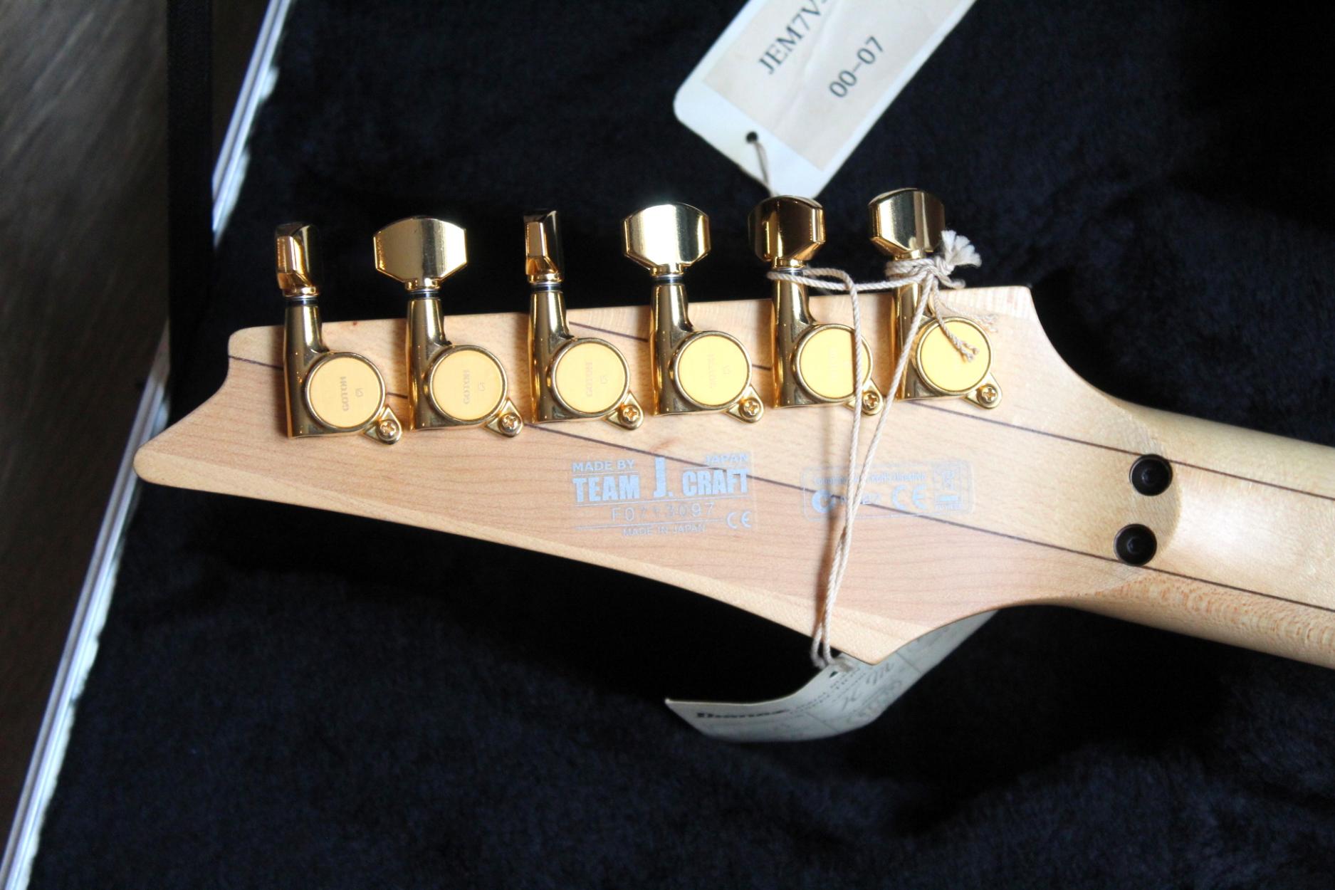 (F0713097) The JEM7V, also known as the JEM7V WH (white), is a JEM series solid body electric guitar, It is a signature model of American guitarist Steve Vai. It was produced in Japan by FujiGen. The first builds were made in 1992 solely to Steve Vai himself, and was introduced by Ibanez in 1993. The JEM7V features an alder body bolted to a maple and walnut (originally one-piece maple) neck with a 24-fret fingerboard with pearl and abalone Tree of Life vine inlays. Components include DiMarzio Evolution pickups with a pair of humbuckers flanking a single-coil, a double locking tremolo bridge and Gotoh tuning machines. A thin basswood veneer is applied to the top and back of the body to prevent the finish from soaking into the alder and preventing the alder grain from appearing through the finish. The fingerboard is scalloped at the last four frets. The JEM7V has gone through several specification changes: the Lo-Pro Edge tremolo was replaced with the new Edge Pro in 2003; the Edge Pro was in turn replaced with the original Edge tremolo in 2010. In 2004 the ebony fingerboard was replaced with rosewood. For 2005 the JEM7V got a five-ply neck like most Japanese-made Ibanez guitars. Starting in 2013 the carbon fiber Ultralite tremolo arm was included. From 2002 until 2004 the JEM7V was also available with a sparkle blue finish as the JEM7V SBL. A seven-string version, the JEM7V7, was introduced in 2013 and discontinued in 2016. The JEM7VP is a very similar Indonesian made Premium series model which was introduced in 2019. The JEM7V was discontinued after 2019. Specifications for JEM7VModel name: JEM7VYear(s) offered: 1993–2019Sold in: WorldwideMade in: JapanPrice: MSRP: JP¥ 200,000 (1993-1996) / JP¥ 205,000 (1997-1998) / JP¥ 215,000 (1999-2000) / JP¥ 225,000 (2001) / JP¥ 240,000 (2002) / JP¥ 245,000 (2003) / JP¥ 273,000 (2005-2006) / JP¥ 294,000 (2007-2008) / JP¥ 315,000 (2009-2011) / JP¥ 336,000 (2012) / JP¥ 341,250 (2013) / JP¥ 340,000 (2014) / JP¥ 360,000 (2015-2019)Finish(es): White (WH)BodyBody type: Solid bodyBody material: Alder w/ basswood veneersNeck joint: AANJBridge: 1993–2002: Lo-Pro Edge tremolo 2003–2009: Edge Pro tremolo 2010–2012: Edge tremolo 2013–2019: Edge tremolo w/ Ultralite tremolo arm (10.8mm string spacing)Pickguard: White pearloidKnob style: Plastic top hat (white)Hardware color: GoldNeckNeck type: JEM PrestigeNeck material: 1993–2004: 1-piece maple 2005–2006 (EU market): 3-piece maple 2005–2019: 5-piece maple/ walnutScale length: 648mm/ 25½"Fingerboard material: 1993–2003: Ebony 2004–2019: Rosewood Frets 21–24 scallopedFingerboard inlays: Pearl/ abalone Tree of LifeFrets: 24 / W/6105 (Prestige edge treatment)Nut: Top-Lok III (43mm)Machine heads: Gotoh SG381 (non-locking)Electronics/ StringsPickup configuration: HSHBridge pickup: DiMarzio Evolution bridge (H)Middle pickup: DiMarzio Evolution Single mid (S)Neck pickup: DiMarzio Evolution neck (H)Controls: Master volume / master tone / 5-way lever pickup selectorString gauge (factory): .009/.011/.016/.024/.032/.042Factory tuning: 1E,2B,3G,4D,5A,6E (E Std.)