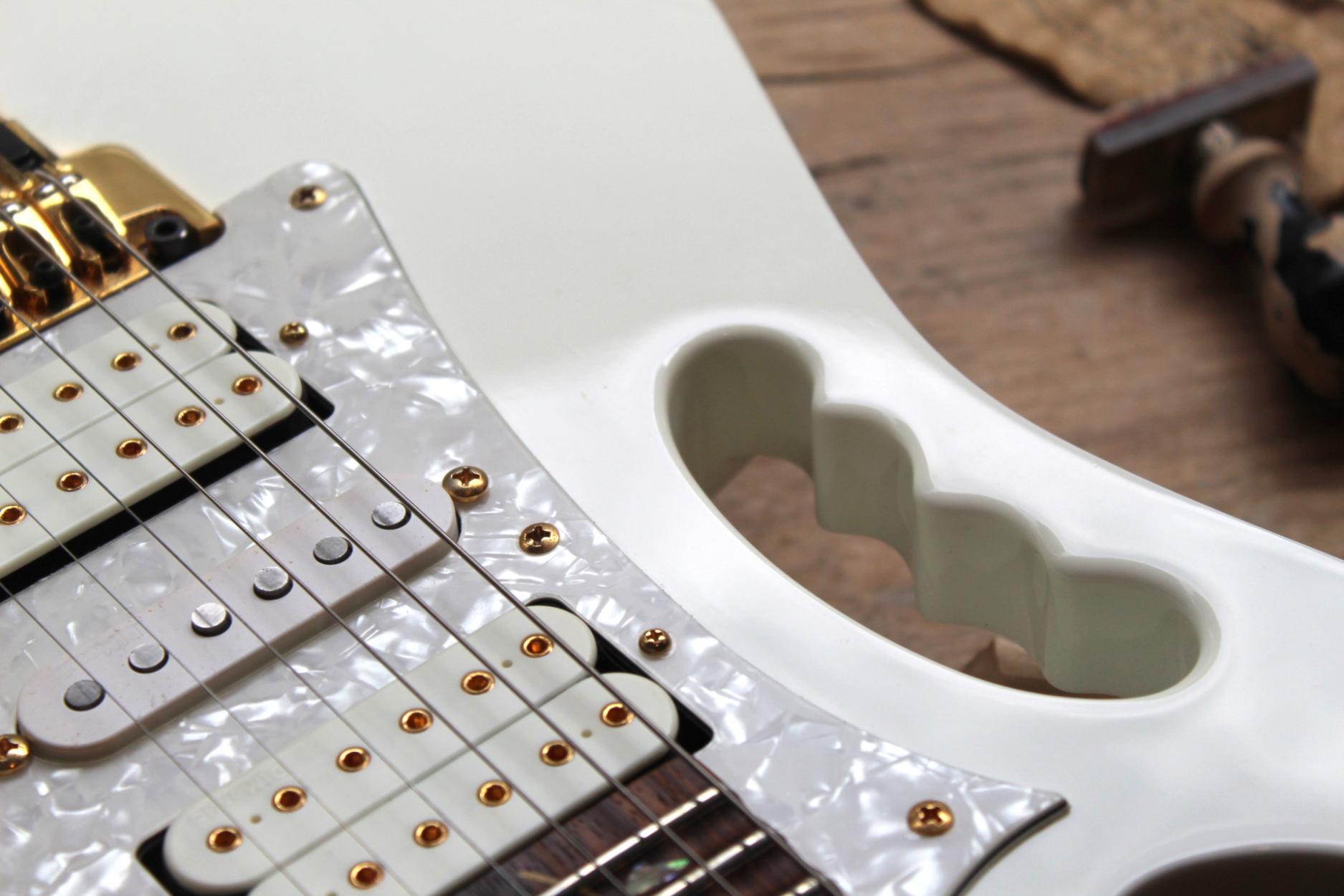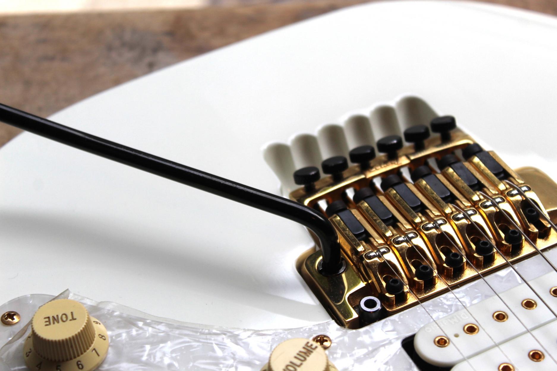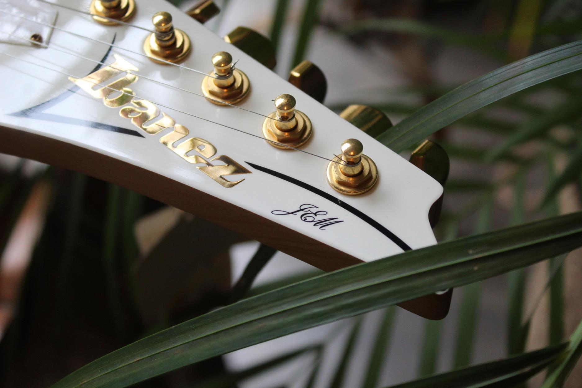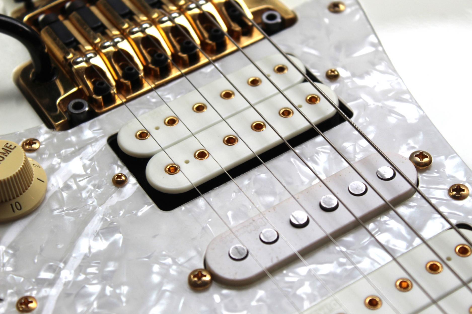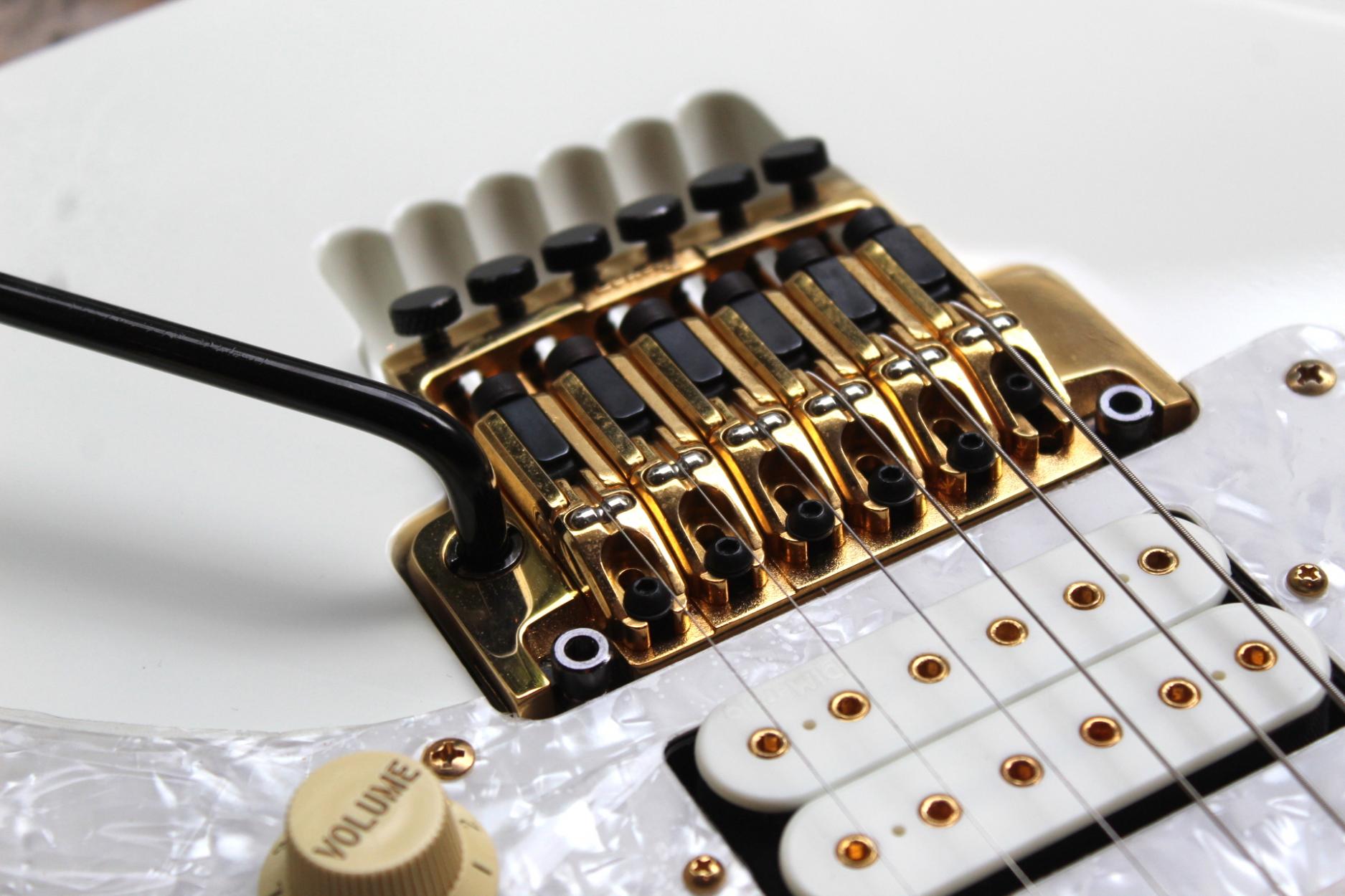 (F0713097) The JEM7V, also known as the JEM7V WH (white), is a JEM series solid body electric guitar, It is a signature model of American guitarist Steve Vai. It was produced in Japan by FujiGen. The first builds were made in 1992 solely to Steve Vai himself, and was introduced by Ibanez in 1993. The JEM7V features an alder body bolted to a maple and walnut (originally one-piece maple) neck with a 24-fret fingerboard with pearl and abalone Tree of Life vine inlays. Components include DiMarzio Evolution pickups with a pair of humbuckers flanking a single-coil, a double locking tremolo bridge and Gotoh tuning machines. A thin basswood veneer is applied to the top and back of the body to prevent the finish from soaking into the alder and preventing the alder grain from appearing through the finish. The fingerboard is scalloped at the last four frets. The JEM7V has gone through several specification changes: the Lo-Pro Edge tremolo was replaced with the new Edge Pro in 2003; the Edge Pro was in turn replaced with the original Edge tremolo in 2010. In 2004 the ebony fingerboard was replaced with rosewood. For 2005 the JEM7V got a five-ply neck like most Japanese-made Ibanez guitars. Starting in 2013 the carbon fiber Ultralite tremolo arm was included. From 2002 until 2004 the JEM7V was also available with a sparkle blue finish as the JEM7V SBL. A seven-string version, the JEM7V7, was introduced in 2013 and discontinued in 2016. The JEM7VP is a very similar Indonesian made Premium series model which was introduced in 2019. The JEM7V was discontinued after 2019. Specifications for JEM7VModel name: JEM7VYear(s) offered: 1993–2019Sold in: WorldwideMade in: JapanPrice: MSRP: JP¥ 200,000 (1993-1996) / JP¥ 205,000 (1997-1998) / JP¥ 215,000 (1999-2000) / JP¥ 225,000 (2001) / JP¥ 240,000 (2002) / JP¥ 245,000 (2003) / JP¥ 273,000 (2005-2006) / JP¥ 294,000 (2007-2008) / JP¥ 315,000 (2009-2011) / JP¥ 336,000 (2012) / JP¥ 341,250 (2013) / JP¥ 340,000 (2014) / JP¥ 360,000 (2015-2019)Finish(es): White (WH)BodyBody type: Solid bodyBody material: Alder w/ basswood veneersNeck joint: AANJBridge: 1993–2002: Lo-Pro Edge tremolo 2003–2009: Edge Pro tremolo 2010–2012: Edge tremolo 2013–2019: Edge tremolo w/ Ultralite tremolo arm (10.8mm string spacing)Pickguard: White pearloidKnob style: Plastic top hat (white)Hardware color: GoldNeckNeck type: JEM PrestigeNeck material: 1993–2004: 1-piece maple 2005–2006 (EU market): 3-piece maple 2005–2019: 5-piece maple/ walnutScale length: 648mm/ 25½"Fingerboard material: 1993–2003: Ebony 2004–2019: Rosewood Frets 21–24 scallopedFingerboard inlays: Pearl/ abalone Tree of LifeFrets: 24 / W/6105 (Prestige edge treatment)Nut: Top-Lok III (43mm)Machine heads: Gotoh SG381 (non-locking)Electronics/ StringsPickup configuration: HSHBridge pickup: DiMarzio Evolution bridge (H)Middle pickup: DiMarzio Evolution Single mid (S)Neck pickup: DiMarzio Evolution neck (H)Controls: Master volume / master tone / 5-way lever pickup selectorString gauge (factory): .009/.011/.016/.024/.032/.042Factory tuning: 1E,2B,3G,4D,5A,6E (E Std.)