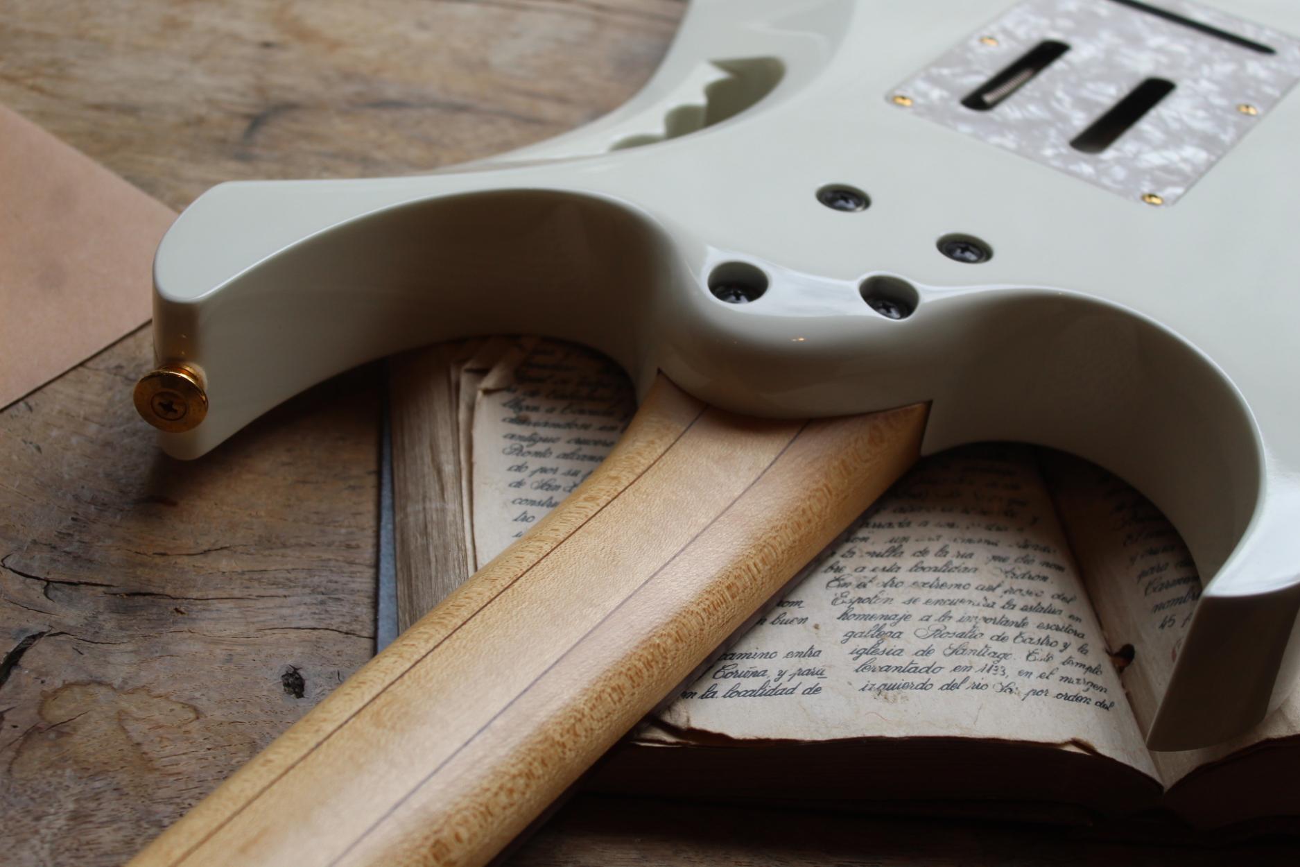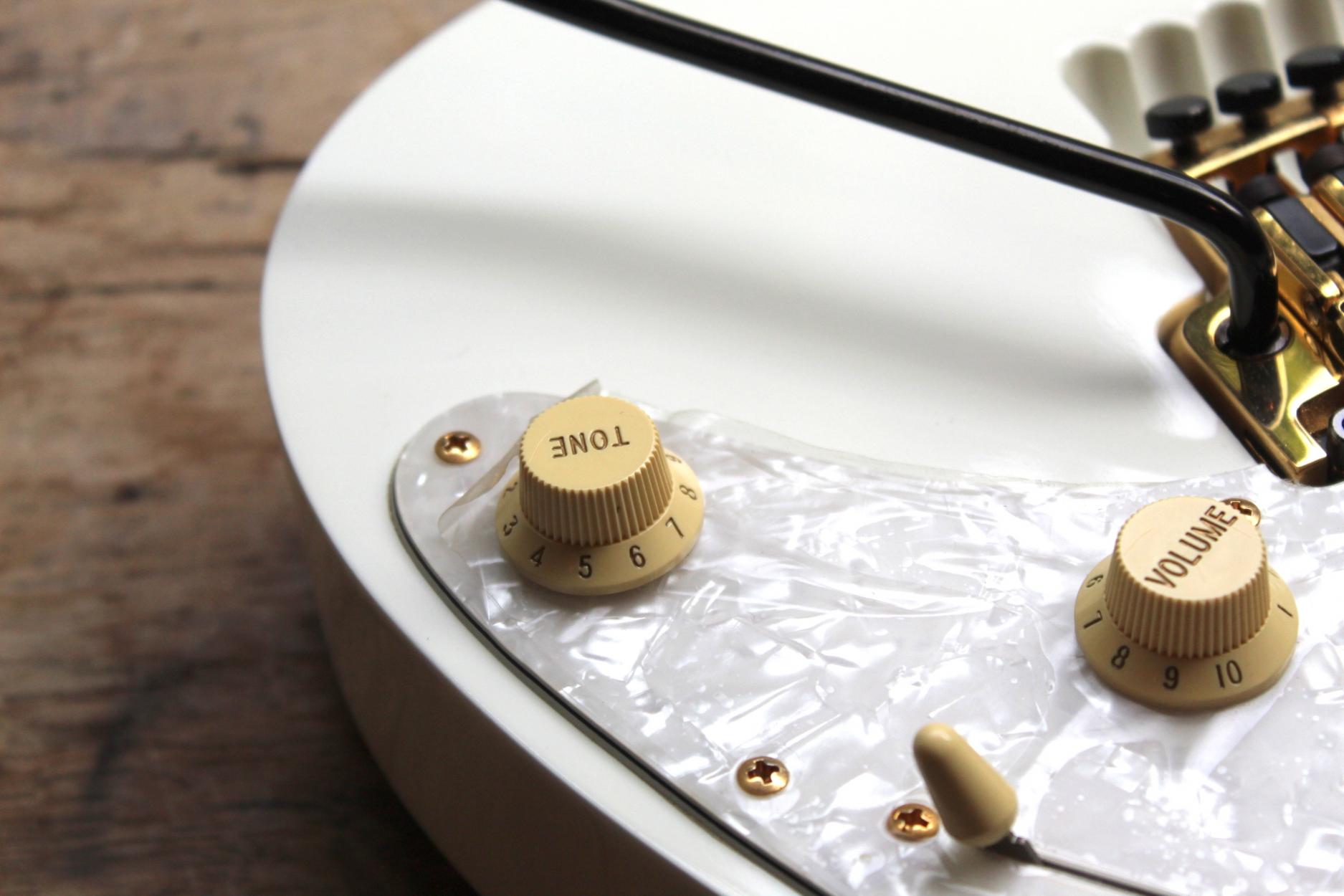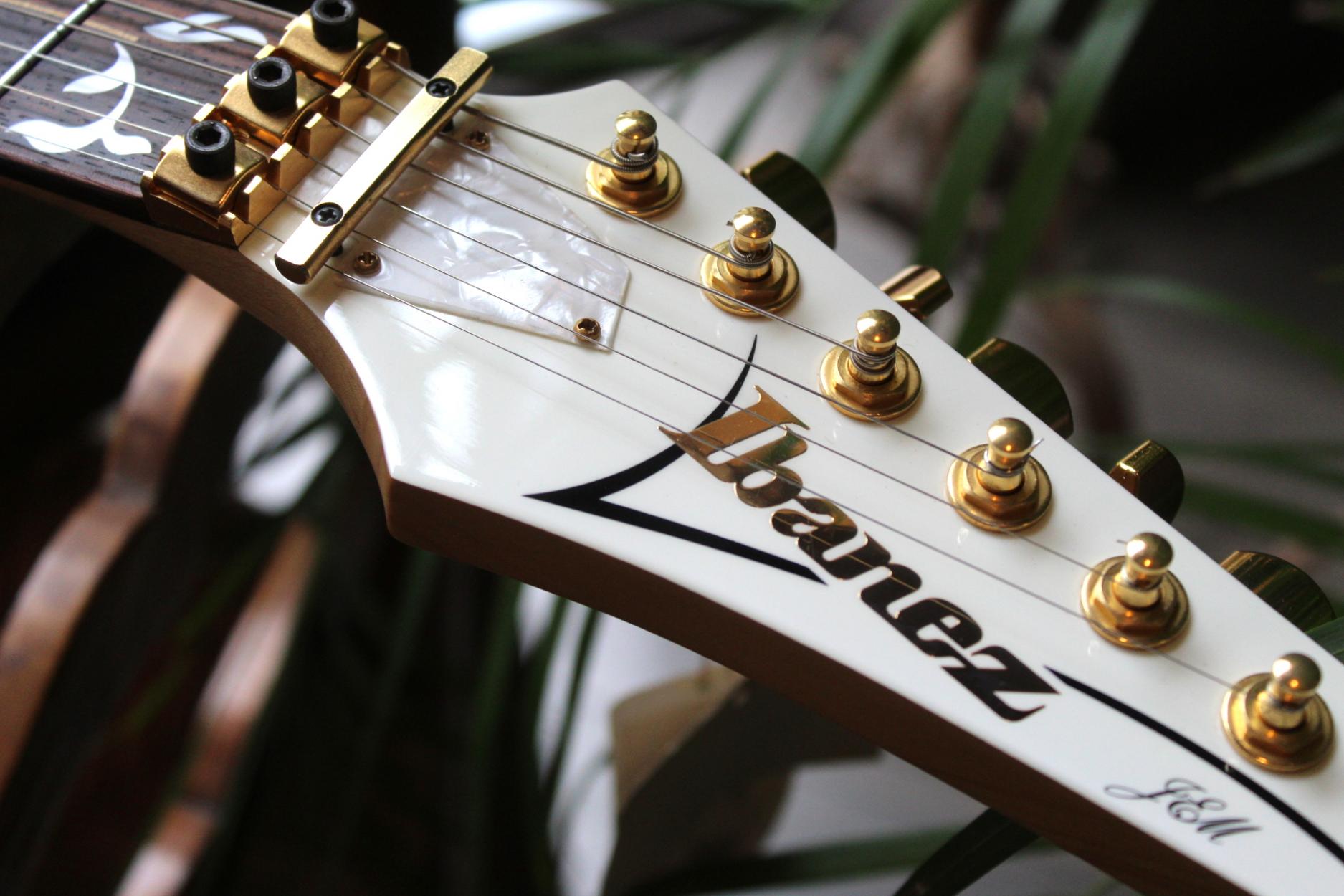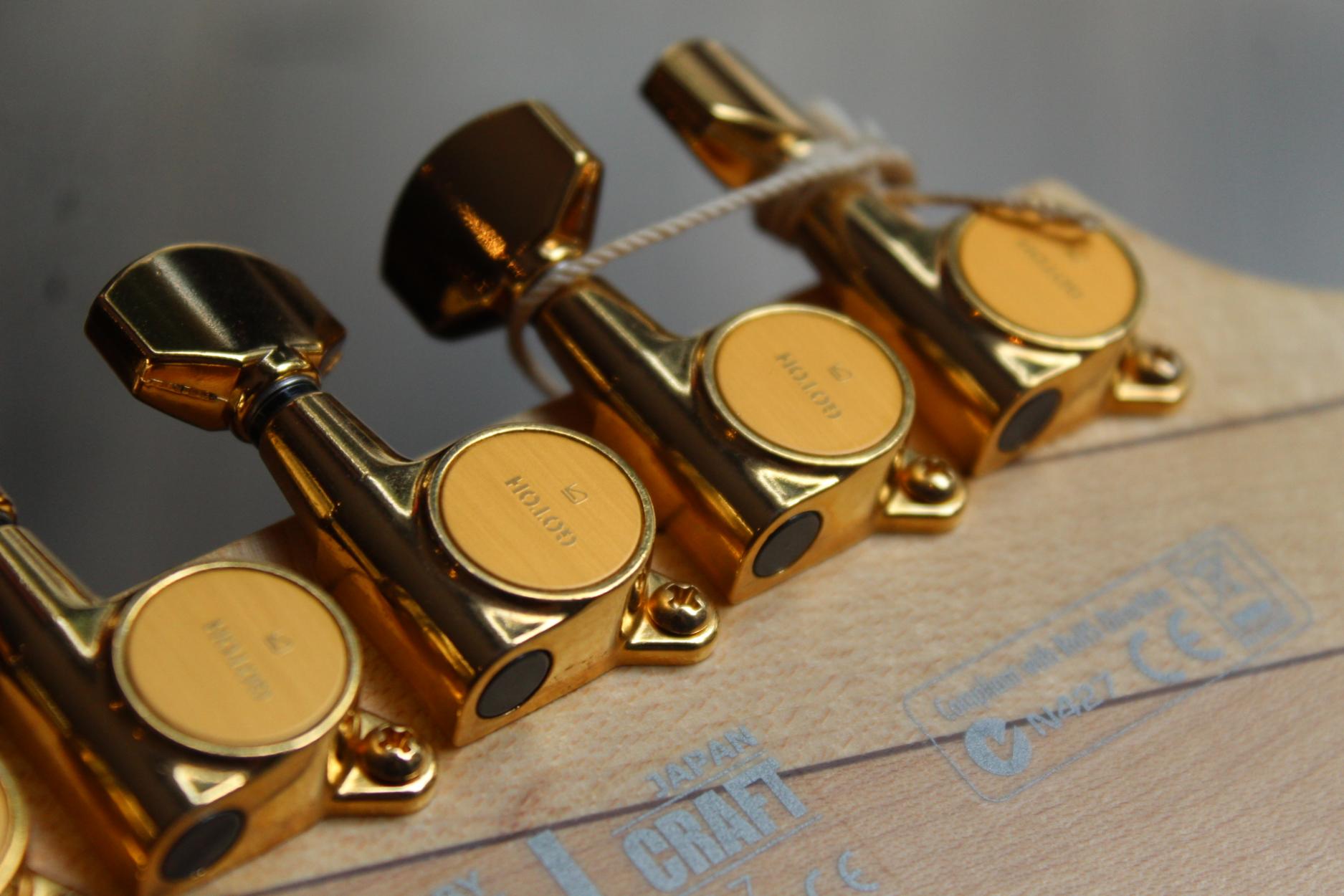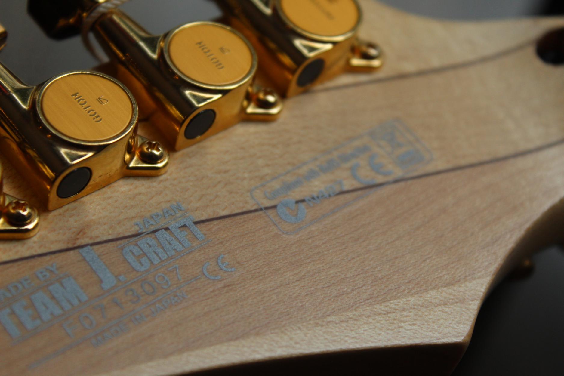 (F0713097) The JEM7V, also known as the JEM7V WH (white), is a JEM series solid body electric guitar, It is a signature model of American guitarist Steve Vai. It was produced in Japan by FujiGen. The first builds were made in 1992 solely to Steve Vai himself, and was introduced by Ibanez in 1993. The JEM7V features an alder body bolted to a maple and walnut (originally one-piece maple) neck with a 24-fret fingerboard with pearl and abalone Tree of Life vine inlays. Components include DiMarzio Evolution pickups with a pair of humbuckers flanking a single-coil, a double locking tremolo bridge and Gotoh tuning machines. A thin basswood veneer is applied to the top and back of the body to prevent the finish from soaking into the alder and preventing the alder grain from appearing through the finish. The fingerboard is scalloped at the last four frets. The JEM7V has gone through several specification changes: the Lo-Pro Edge tremolo was replaced with the new Edge Pro in 2003; the Edge Pro was in turn replaced with the original Edge tremolo in 2010. In 2004 the ebony fingerboard was replaced with rosewood. For 2005 the JEM7V got a five-ply neck like most Japanese-made Ibanez guitars. Starting in 2013 the carbon fiber Ultralite tremolo arm was included. From 2002 until 2004 the JEM7V was also available with a sparkle blue finish as the JEM7V SBL. A seven-string version, the JEM7V7, was introduced in 2013 and discontinued in 2016. The JEM7VP is a very similar Indonesian made Premium series model which was introduced in 2019. The JEM7V was discontinued after 2019. Specifications for JEM7VModel name: JEM7VYear(s) offered: 1993–2019Sold in: WorldwideMade in: JapanPrice: MSRP: JP¥ 200,000 (1993-1996) / JP¥ 205,000 (1997-1998) / JP¥ 215,000 (1999-2000) / JP¥ 225,000 (2001) / JP¥ 240,000 (2002) / JP¥ 245,000 (2003) / JP¥ 273,000 (2005-2006) / JP¥ 294,000 (2007-2008) / JP¥ 315,000 (2009-2011) / JP¥ 336,000 (2012) / JP¥ 341,250 (2013) / JP¥ 340,000 (2014) / JP¥ 360,000 (2015-2019)Finish(es): White (WH)BodyBody type: Solid bodyBody material: Alder w/ basswood veneersNeck joint: AANJBridge: 1993–2002: Lo-Pro Edge tremolo 2003–2009: Edge Pro tremolo 2010–2012: Edge tremolo 2013–2019: Edge tremolo w/ Ultralite tremolo arm (10.8mm string spacing)Pickguard: White pearloidKnob style: Plastic top hat (white)Hardware color: GoldNeckNeck type: JEM PrestigeNeck material: 1993–2004: 1-piece maple 2005–2006 (EU market): 3-piece maple 2005–2019: 5-piece maple/ walnutScale length: 648mm/ 25½"Fingerboard material: 1993–2003: Ebony 2004–2019: Rosewood Frets 21–24 scallopedFingerboard inlays: Pearl/ abalone Tree of LifeFrets: 24 / W/6105 (Prestige edge treatment)Nut: Top-Lok III (43mm)Machine heads: Gotoh SG381 (non-locking)Electronics/ StringsPickup configuration: HSHBridge pickup: DiMarzio Evolution bridge (H)Middle pickup: DiMarzio Evolution Single mid (S)Neck pickup: DiMarzio Evolution neck (H)Controls: Master volume / master tone / 5-way lever pickup selectorString gauge (factory): .009/.011/.016/.024/.032/.042Factory tuning: 1E,2B,3G,4D,5A,6E (E Std.)