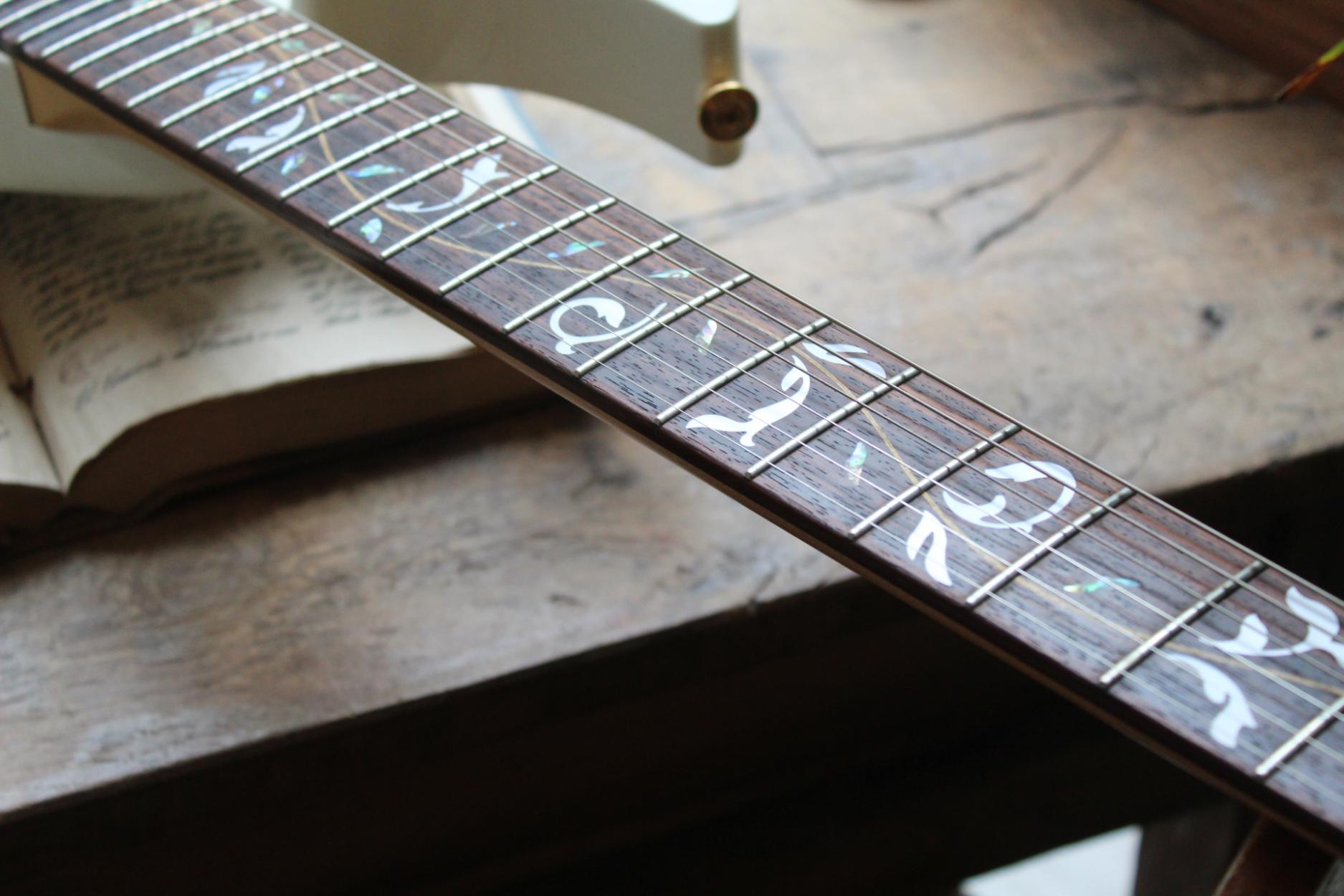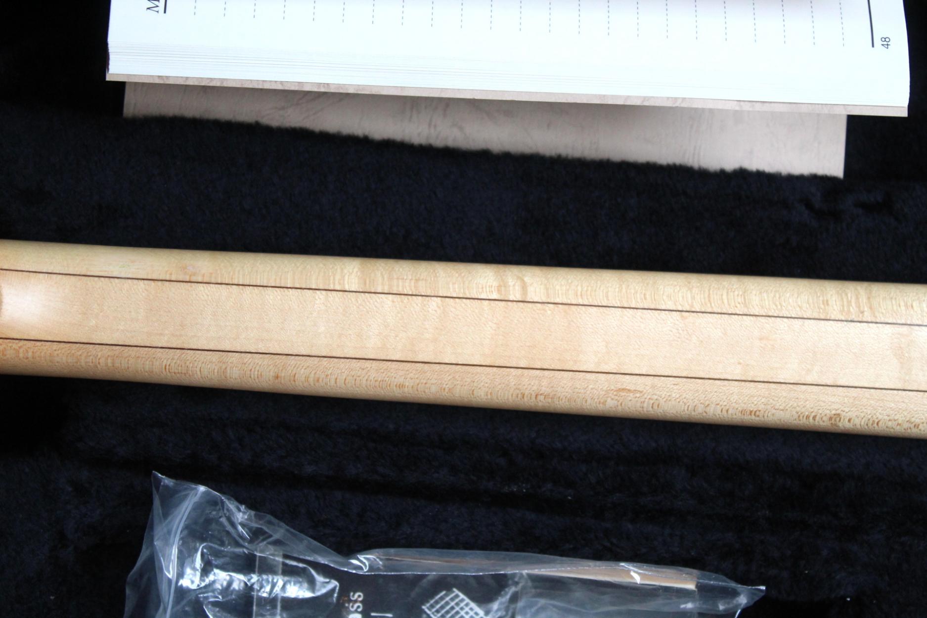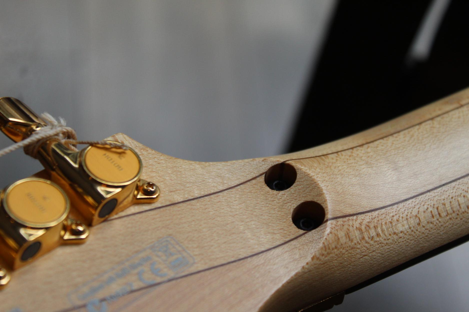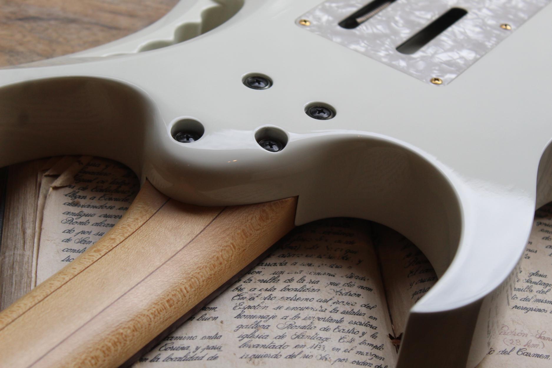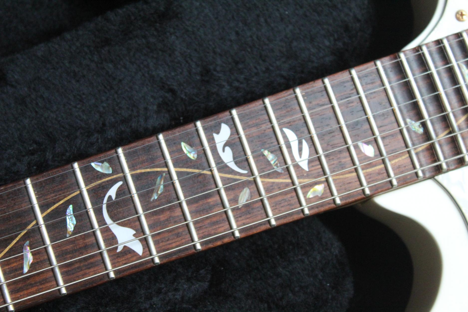 (F0713097) The JEM7V, also known as the JEM7V WH (white), is a JEM series solid body electric guitar, It is a signature model of American guitarist Steve Vai. It was produced in Japan by FujiGen. The first builds were made in 1992 solely to Steve Vai himself, and was introduced by Ibanez in 1993. The JEM7V features an alder body bolted to a maple and walnut (originally one-piece maple) neck with a 24-fret fingerboard with pearl and abalone Tree of Life vine inlays. Components include DiMarzio Evolution pickups with a pair of humbuckers flanking a single-coil, a double locking tremolo bridge and Gotoh tuning machines. A thin basswood veneer is applied to the top and back of the body to prevent the finish from soaking into the alder and preventing the alder grain from appearing through the finish. The fingerboard is scalloped at the last four frets. The JEM7V has gone through several specification changes: the Lo-Pro Edge tremolo was replaced with the new Edge Pro in 2003; the Edge Pro was in turn replaced with the original Edge tremolo in 2010. In 2004 the ebony fingerboard was replaced with rosewood. For 2005 the JEM7V got a five-ply neck like most Japanese-made Ibanez guitars. Starting in 2013 the carbon fiber Ultralite tremolo arm was included. From 2002 until 2004 the JEM7V was also available with a sparkle blue finish as the JEM7V SBL. A seven-string version, the JEM7V7, was introduced in 2013 and discontinued in 2016. The JEM7VP is a very similar Indonesian made Premium series model which was introduced in 2019. The JEM7V was discontinued after 2019. Specifications for JEM7VModel name: JEM7VYear(s) offered: 1993–2019Sold in: WorldwideMade in: JapanPrice: MSRP: JP¥ 200,000 (1993-1996) / JP¥ 205,000 (1997-1998) / JP¥ 215,000 (1999-2000) / JP¥ 225,000 (2001) / JP¥ 240,000 (2002) / JP¥ 245,000 (2003) / JP¥ 273,000 (2005-2006) / JP¥ 294,000 (2007-2008) / JP¥ 315,000 (2009-2011) / JP¥ 336,000 (2012) / JP¥ 341,250 (2013) / JP¥ 340,000 (2014) / JP¥ 360,000 (2015-2019)Finish(es): White (WH)BodyBody type: Solid bodyBody material: Alder w/ basswood veneersNeck joint: AANJBridge: 1993–2002: Lo-Pro Edge tremolo 2003–2009: Edge Pro tremolo 2010–2012: Edge tremolo 2013–2019: Edge tremolo w/ Ultralite tremolo arm (10.8mm string spacing)Pickguard: White pearloidKnob style: Plastic top hat (white)Hardware color: GoldNeckNeck type: JEM PrestigeNeck material: 1993–2004: 1-piece maple 2005–2006 (EU market): 3-piece maple 2005–2019: 5-piece maple/ walnutScale length: 648mm/ 25½"Fingerboard material: 1993–2003: Ebony 2004–2019: Rosewood Frets 21–24 scallopedFingerboard inlays: Pearl/ abalone Tree of LifeFrets: 24 / W/6105 (Prestige edge treatment)Nut: Top-Lok III (43mm)Machine heads: Gotoh SG381 (non-locking)Electronics/ StringsPickup configuration: HSHBridge pickup: DiMarzio Evolution bridge (H)Middle pickup: DiMarzio Evolution Single mid (S)Neck pickup: DiMarzio Evolution neck (H)Controls: Master volume / master tone / 5-way lever pickup selectorString gauge (factory): .009/.011/.016/.024/.032/.042Factory tuning: 1E,2B,3G,4D,5A,6E (E Std.)