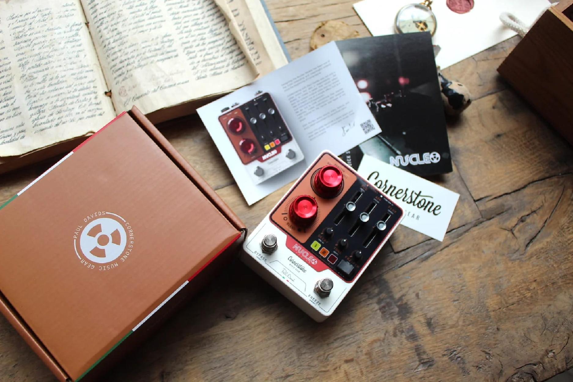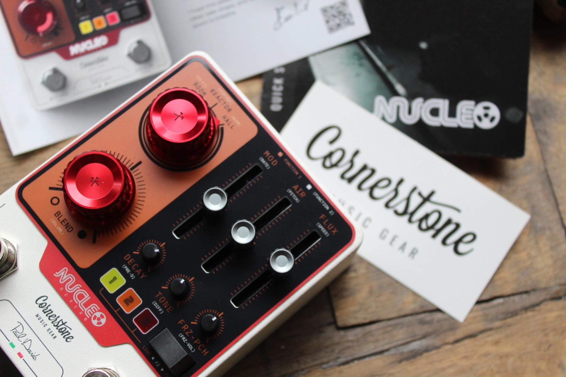 Cornerstone Nucleo Paul Davids Signature The Nucleo is the result of the collaboration between Paul Davids and Emilio Mazari, founder of Cornerstone. The idea began with Paul Davids' visit to a nuclear power plant in search of the world's most insanely beautiful reverb. There, he was inspired by the sound of the plant with all its unique reflections. At the same time, Emilio was researching the possibility of creating ambient reverb. He saw Paul's video and approached him asking if he would like to capture the sounds Paul had found in the nuclear power plant in a signature pedal. From then on, they invested a lot of time, energy and grey hairs to get all those complex and detailed reverb sounds into a pedal. The Nucleo is a digital reverb pedal with three presets: a room, hall, and of course ‘the Reactor’, whose intensity can be adjusted with the Blend knob. There are three intuitive sliders to control the modulation of the reverb, ‘air’ (a shimmer function), and ‘flux’, which adds random sounds to the reverb in beautiful and unexpected ways, giving you the feeling of being in a real reactor. Pressing the second foot pedal freezes the signal, so you can play over your own soundscapes, but with a modified signal. There is even a latch function that ensures smooth chord transitions. The three other potentiometers control the decay, the tone of the reverb, and the pitch of the frozen signal. Each knob controls a second parameter that can be adjusted very intuitively via the switch. Other features include full MIDI control, audio interface, stereo inputs and outputs, making this pedal a very complete and versatile effect.