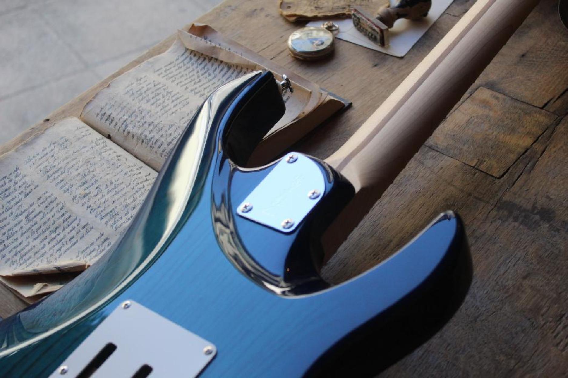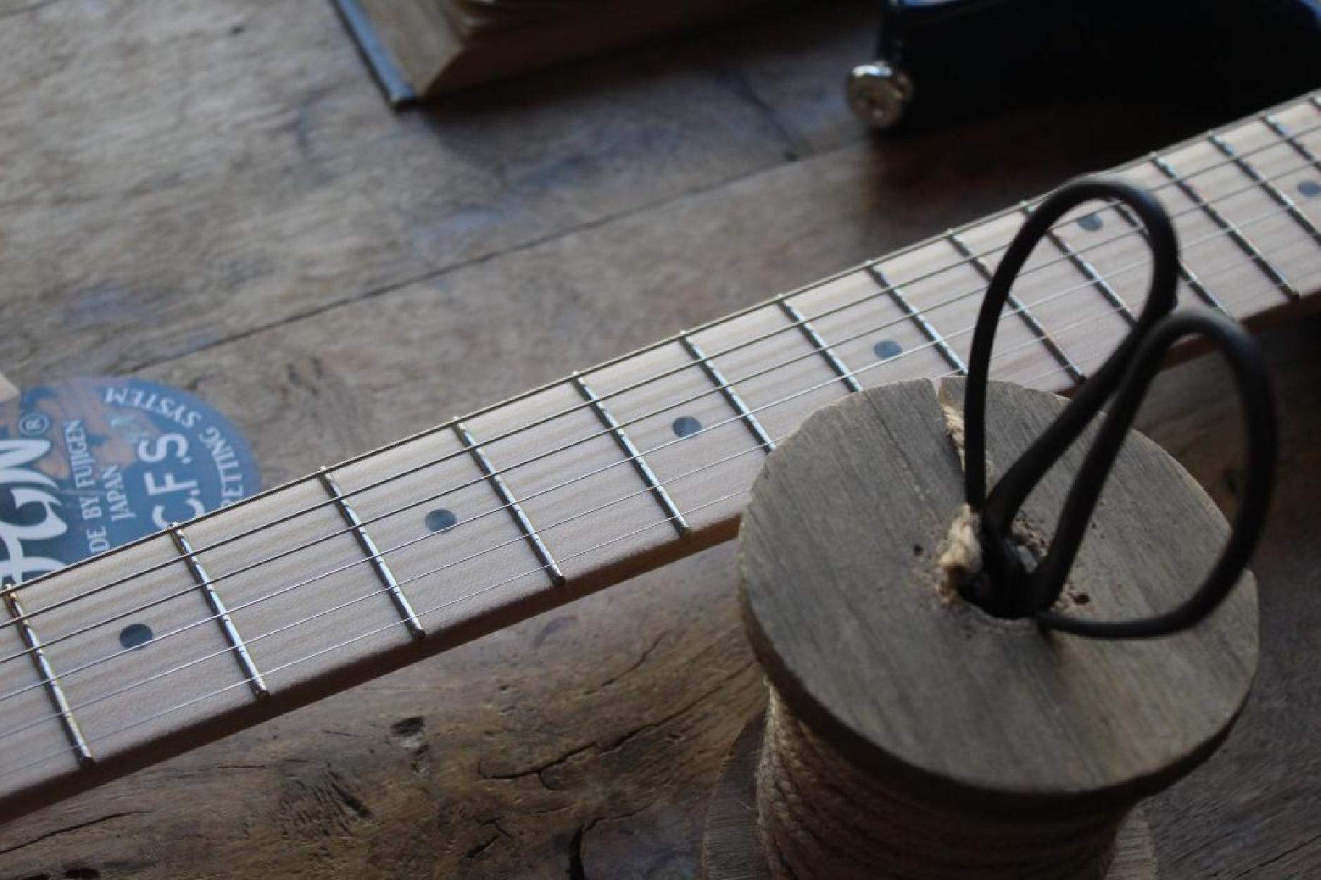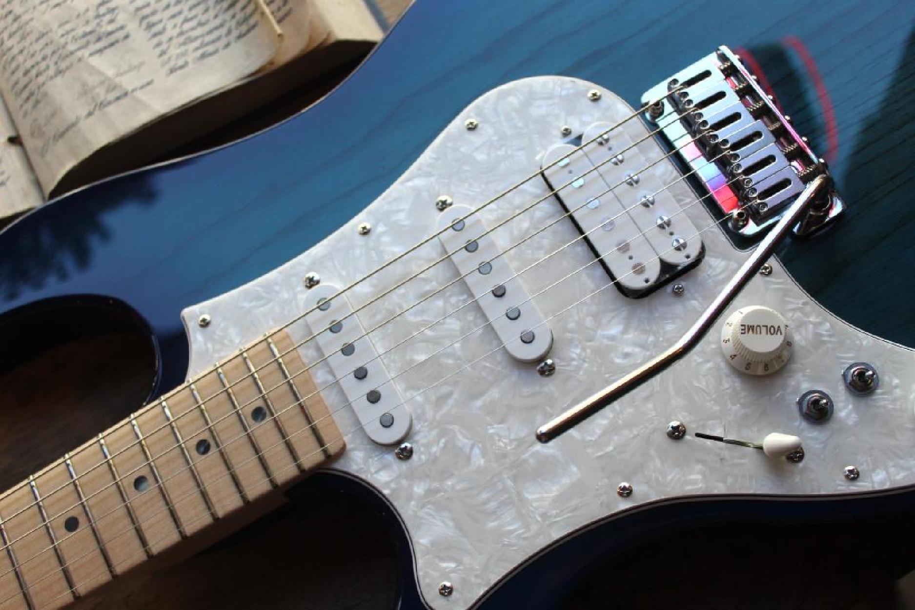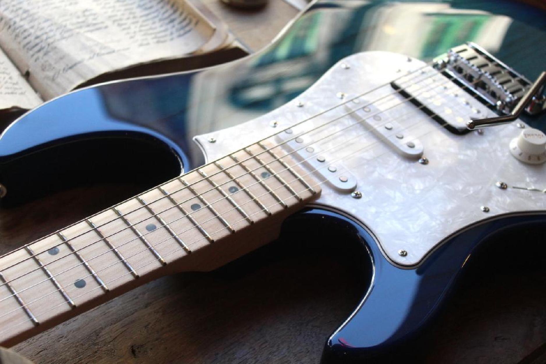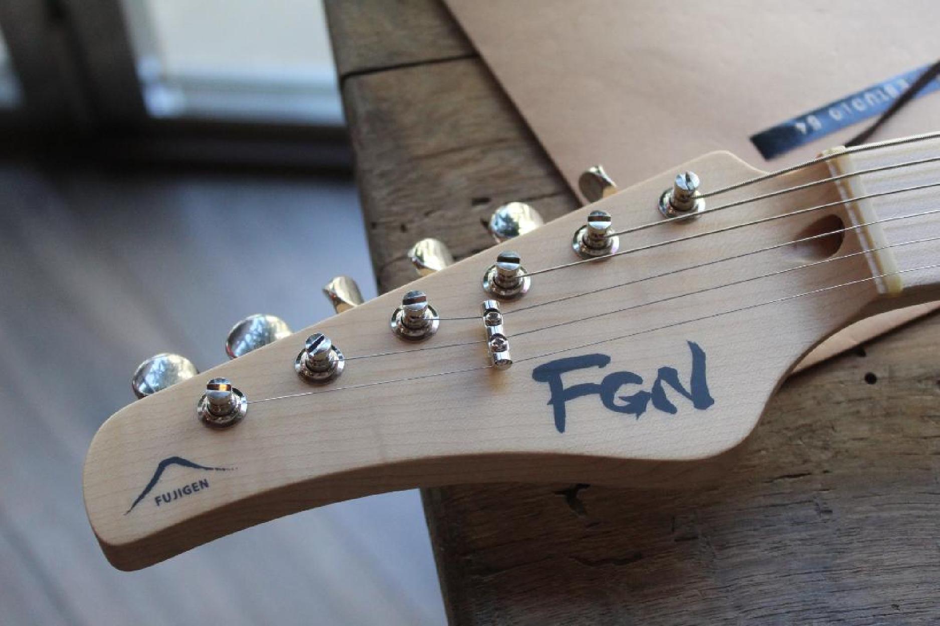 3, 54 KG All FGN guitars and basses feature a unique Circle Fretting System (CFS). It was created by FGN to offer better tone and articulation than conventional guitars and basses. All frets are mounted on the fretboard in a slightly curved shape, so that each string crosses all frets at 90 degrees, providing minimal string contact on a fret. This makes the scale length of each string even when it actually varies with conventional fretting. The CFS is a solution to fretting on a traditional guitar and bass and offers clearer articulation and tones that add dimension when you pick a string and also cut through the mix when you play single notes. Compound Radius Fretboard The compound radius fretboard has a smaller (rounder) radius toward the nut, while a larger (flatter) radius toward the neck end, similar to the shape of a cone in the upper registers. TECHNICAL SPECIFICATIONS Construction: Bolt-on neck Body: 2-piece ash Neck: U-sawn maple Fretboard: Maple Scale: 648 mm (25.5") Frets: 22F narrow tall by C.F.S. / Xpert fret edge treatment Tuners: GOTOH® SD91-05M MG Bridge: GOTOH® 510TS-FE1 String: Hardware color: Chrome and nickel Neck pickup: FGN OS-2n Middle pickup: FGN OS-2rw Bridge pickup: FGN XPERT-HF Controls: 1 volume, 1 tone, 5-way SW toggle, 2 Mini Tricky SW Body finish: Gloss Strings: D'Addario EXL110 (0.010-0.046) Accessories: Original hardshell case, fret guard Color: SBB (See-Thru Blue Burst)