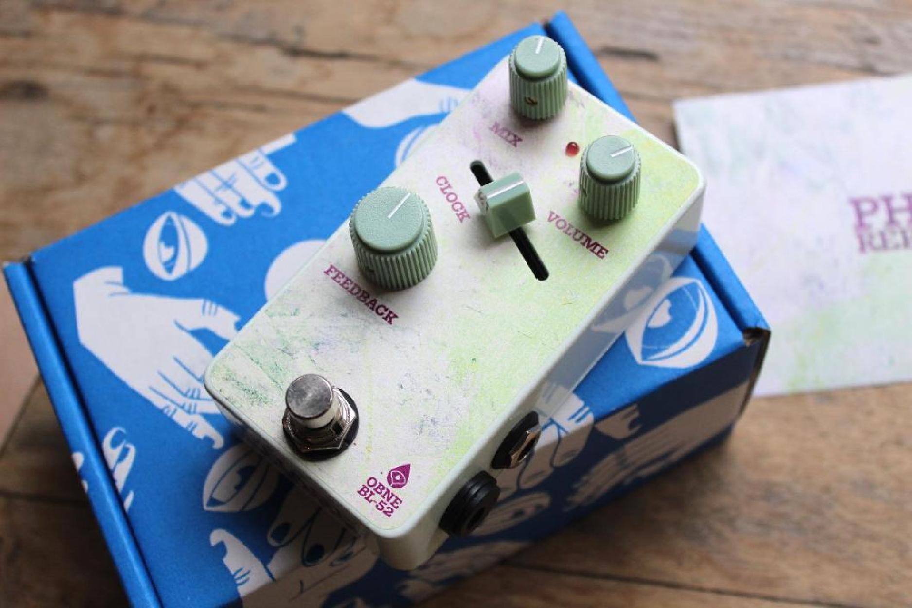 BL-52 is a phase repeater pedal within our BL line. Phase repetition is a unique effect to OBNE - it lives between phaser and reverb, sounding almost like a room constantly changing in size and materials, with a clear repeat one moment and a diffuse repeat the next. The Clock slider allows this sound to move quickly and with fidelity, or slowly and darkly, undulating underneath the player. Controls include: Clock to affect the timing of the entire system, moving from faster repeats and motion to long trailing diffuse delays. Feedback to lengthen the decay further. Mix to set effect blend from 100% dry to 100% wet Volume to set overall volume Soft-touch bypass footswitch for true bypass and minimal switch noise For more information, see the BL-52 manual available here. Requires 9V DC center negative 2.1mm jack power supply capable of 110mA (not included). The art of BL-52 is by Brandy M Patterson.