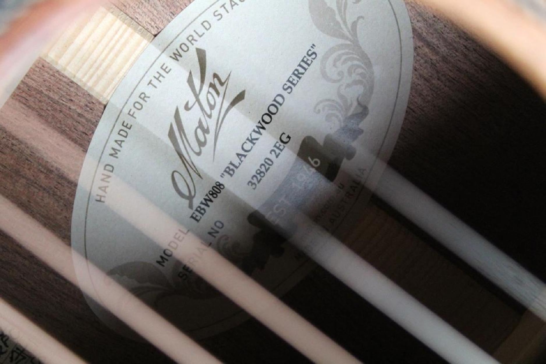 he Blackwood 808 Pure Blackwood tone – clear, bright trebles, strong mid range and full bass. The all Blackwood construction produces a unique compression, blending frequencies into a new, unique voice. A cutaway version of the new Maton EBW808 is also available, and our EBW808 can also be ordered as a left-handed guitar. EBW808Series Name:Blackwood SeriesProduct Code:EBW808Body Shape:808Face:BlackwoodBack And Sides:"A" BlackwoodSoundhole Diameter:95mmNeck:Queensland MapleFingerboard And Bridge:Streaky EbonyBracing:Scalloped Maton XFace Inlay Rosette:RopeBinding:Rope/Black ABSScale Length:25.5"Headstock Veneer:Blackwood Veneer - 2mmFretwire:Jescar FW43080Number Of Frets:21Fretboard Radius:12"Nut Width:1.736" - 1 47/64"14th Fret Width:2.165" - 2 11/65Fingerboard Inlays:6mm Pearl DotsBack And Sides Finish:Natural SatinTop Finish:Natural SatinBridge Pins:Ivory ABSMachine Heads:Chrome Grover RotomaticPickguard:Black with Gold MEnd Pin Strap:ChromeNut And Saddle:BoneGuitar Case:Standard Maton CasePickup:AP5-PROStrings:Elixir Nanoweb Phospher Bronze 12 - 53