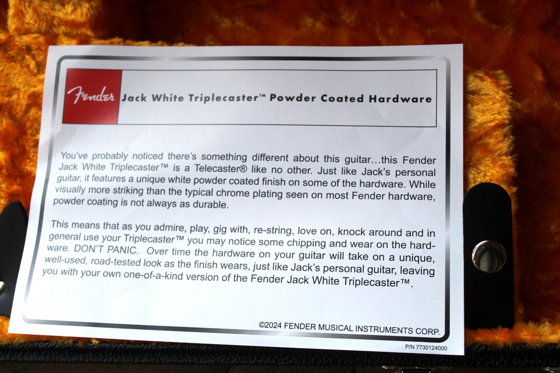 SECOND PIECE HERE IN ESTUDIO 54, AVAILABLE IN DECEMBER (final) 2024, ONLY ONE!! With his raw, gritty guitar tones and visionary approach to music, Jack White has solidified his status as one of the most influential guitarists of the modern era. Now, Fender honors White's storied career with the Jack White Triplecaster™ Telecaster®, an instrument as bold and unconventional as the artist himself. This groundbreaking guitar fuses classic Fender style with carefully selected modern appointments to support and inspire White's ever-shifting musical prerogatives. The Triplecaster’s chambered ash body provides punchy response and resonant tone. The maple neck has a comfortable soft "V" profile finished in sleek satin urethane with 22 medium jumbo frets set into the 12” radius maple fingerboard. The unique pickup configuration comprises a CuNiFe® Wide Range humbucker in the neck, JW-90 in the middle and a custom Jack White humbucker in the bridge, each voiced for maximum fidelity and character. Routed through Jack’s custom configured controls, this versatile trio delivers a wide palette of tones that can be throttled with the expressive arcade-style "Stutter" switch or transformed by the hidden-in-plain-view 3-way toggle that flicks up to mute the signal entirely or down to route your pickup selection “Direct-To-Jack” for even bigger bite. Other features include a 3-saddle bridge with compensated steel saddles, Bigsby® B5 Vibrato, Fender sealed tuners with a Hipshot Xtender™ drop D tuner and a distinctive white powder coat finish on the hardware. Extra custom touches include the classy white armrest and black dot inlays with unique 3-dot patterns at the 12th fret and no inlay at the 21st. The Triplecaster is without a doubt the jewel of Jack White's guitar collection, the key he and Fender crafted to unlock the next step in his artistry. Don't miss the chance to get your very own Triplecaster before they’re gone. Order yours today and unlock a new world of tones. Ver másFeatures Mástil en forma de Soft "V" de mediados de los 50 y diapasón de arce de radio de 12” (30,48 cm) con trastes medium jumbo Pastilla humbucker CuNiFe® Wide-Range de Jack White (mástil), pastilla de bobina simple JW-90 (medio) y pastilla humbucker custom Jack White (puente) Selector de pastillas de 3 posiciones, selector “Direct-To-Jack” de 3 posiciones, selector estilo arcade “Stutter” Puente Tele® “Cut-Off” personalizado con selletas de acero compensados y vibrato Bigsby® B5 Hardware en níquel/cromo con acabado en polvo blanco y placa de mástil asimétrica de 4 tornillos con un diseño custom exclusivo
