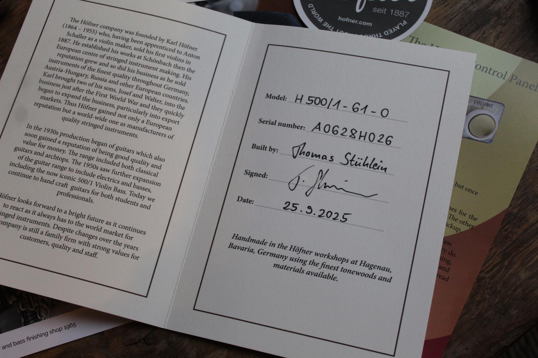 HOFNER "500/1 Vintage '61 Cavern Bass ,Sunburst" HARDCASE, PAPERS