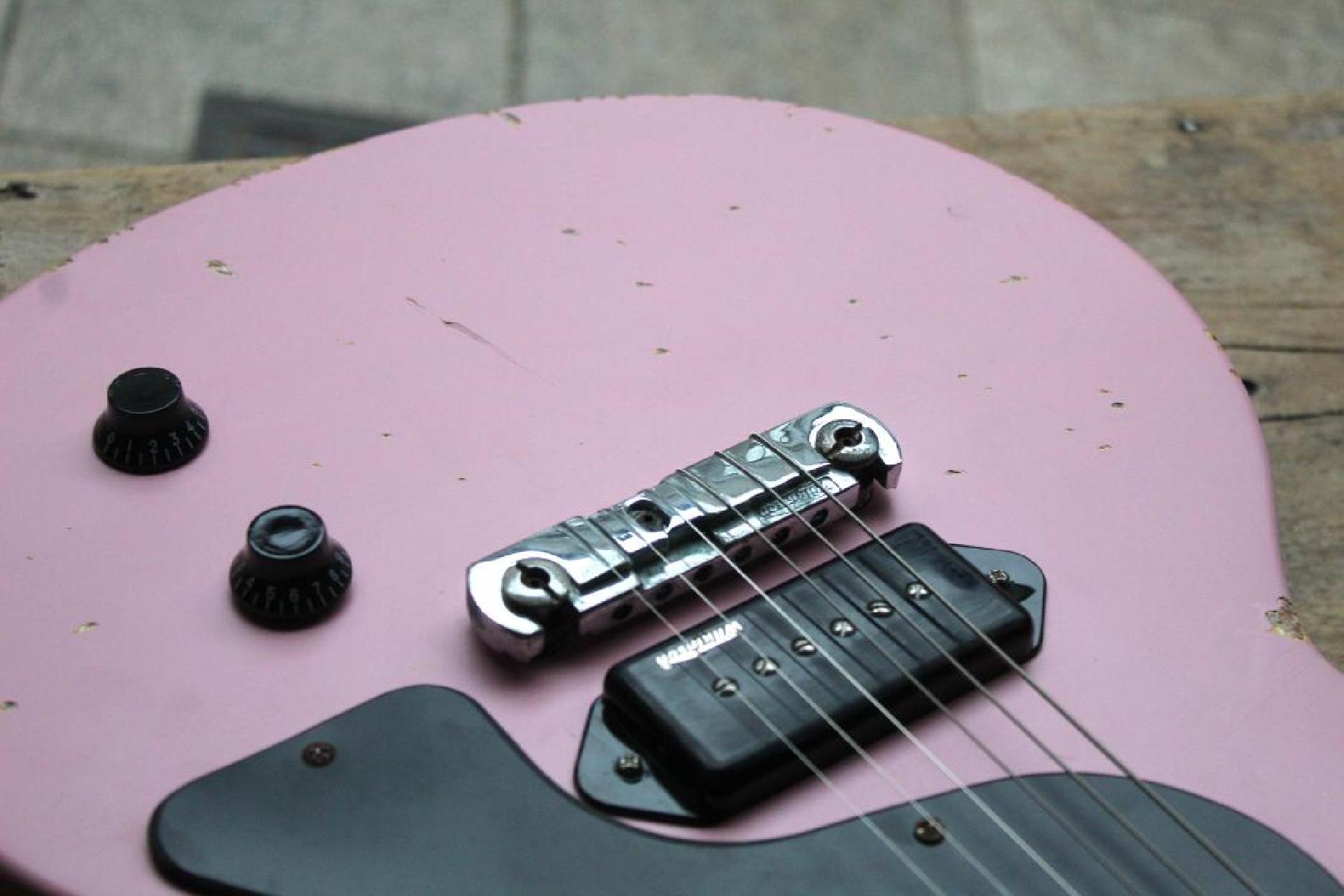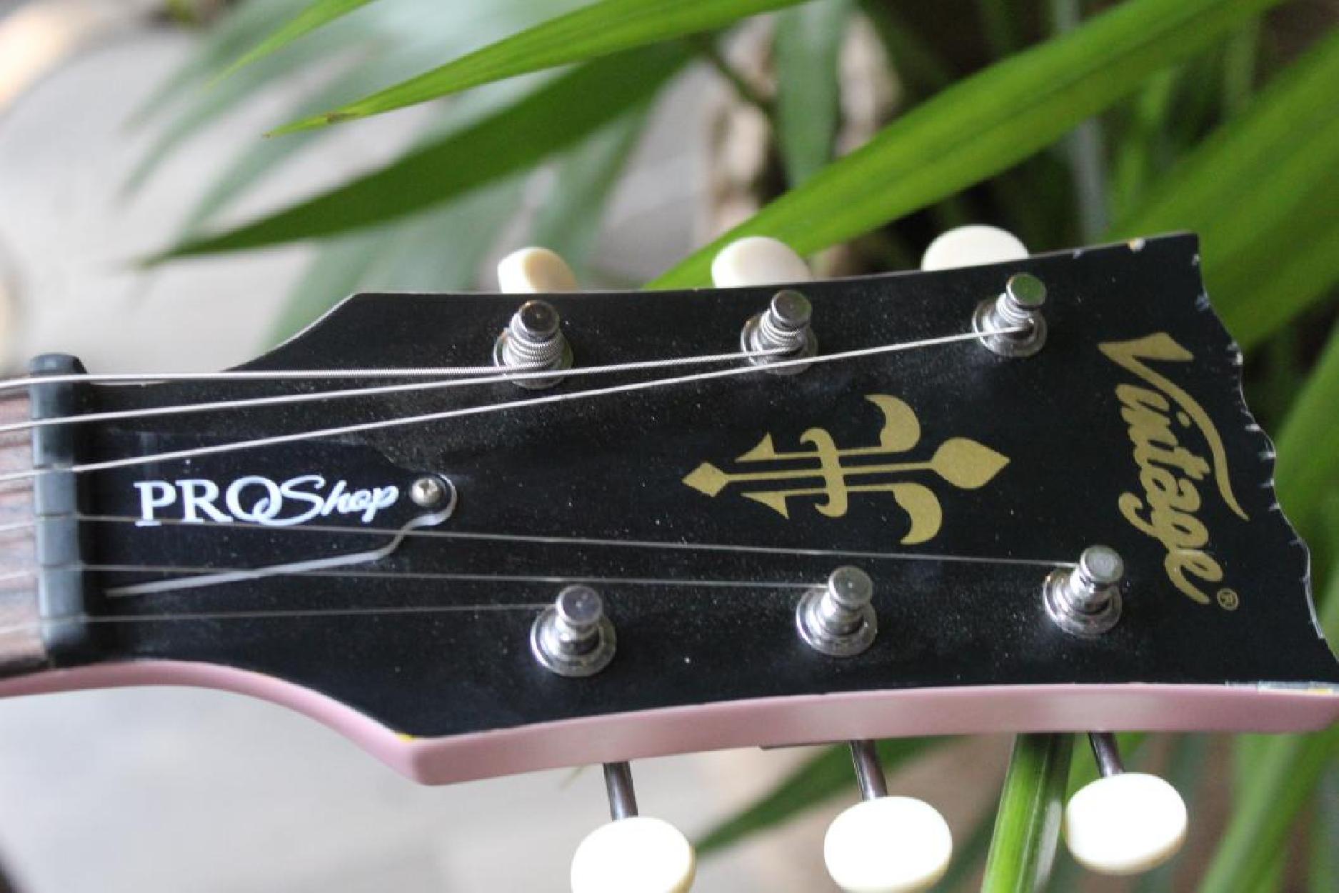 3, 3 KG The guitar has received a full Proshop set-up. Vintage ProShop Set-Up includes: • Fret-level, crown and polish. • Fingerboard dress and comfort treatment. • Truss rod adjustment and set. • Action height, radius, intonation and pickup height adjustment. • Nut slot regulation. V120PU2754 Features: Finish: Sell pink Distressed. Body: Mahogany body provides resonance, tone and ‘correct weight’ comfort. The Vintage V120 features a unique, evolutionary body shape, with a graceful descending bass side shoulder and an ingeniously-designed offset heel providing improved access to the upper reaches of the fretboard. Bridge: The Wilkinson T.O.M. provides ultimate fine-tuning of each string for superb intonation. Pickup: Wilkinson W90B Controls: Single master Volume and Tone pots. Machines: Wilkinson WJ15 Deluxe machine heads provide simple, effective action for maximum tuning stability. Neck: One piece Mahogany with classic Vintage ‘soft C’ profile for instant comfort, speed, accuracy and great feel. Fingerboard: Rosewood for outstanding tonal transfer, responsiveness and durability with a traditional 12” radius for superb playability and feel. Scale Length: 24.75" / 628mm. Frets: 22 Medium Jumbo profile frets add to comfort, accuracy and overall positive feel of the Vintage V120. Nut: 43mm Graphtech NuBone for smooth and friction-free string bending and tuning. Headstock: Classic Vintage headstock design for balance and visual appeal. The V100PU2754 is a Vintage® ProShop Unique guitar designed in the UK by the Vintage® ProShop design team.