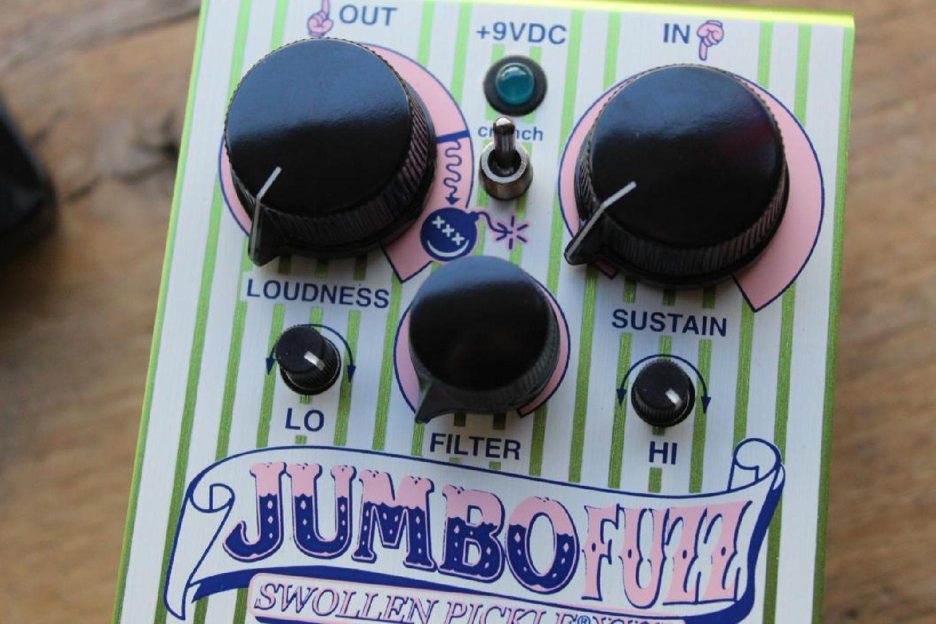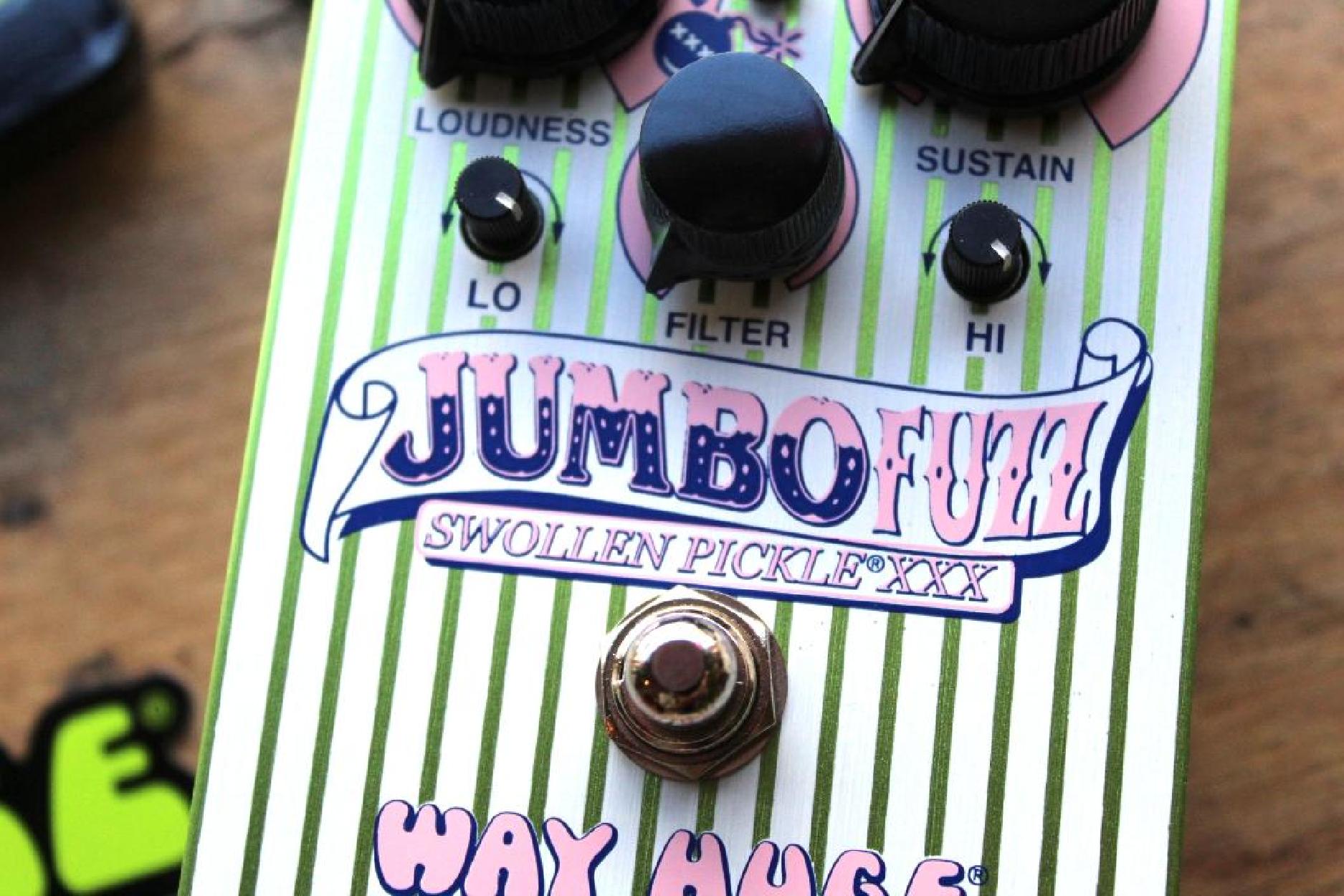 Celebrating its 30th spin around the sun, the Way Huge Jumbo Fuzz Swollen Pickle XXX seethes and simmers with high-gain saturation and fat, hairy lows, but the ever-madder mad scientist Mister Huge has made some ethically questionable but sonically enlightened tweaks to enhance your control over the pedal’s sound. The Long Story The most corpulent of fuzzes is celebrating its 30th spin around the sun with a sweet new take on its crushing and humongous tone. The Way Huge Jumbo Fuzz Swollen Pickle XXX seethes and simmers with high-gain saturation and fat, hairy lows, but the ever-madder mad scientist Mister Huge has made some ethically questionable but sonically enlightened tweaks to enhance your control over the pedal’s sound. First, he replaced the traditional transistor array with high-gain discrete transistors for even more HAIR. Next, he changed out the Crunch knob for a toggle switch to make compression tweaks lightning fast. Finally, Mister Huge massively overhauled the tone stack from top to bottom: new Hi and Lo knobs shape the high- and low-pass of the Filter control, while internal switches let players customize the sweep itself—from flat to ultra scooped or super bumped—giving you ever more intimate control over this surly cucumber’s voice. The Loudness and Sustain controls return to clobber your amp and set the fuzz intensity from mild crunch to end-of-days hellfire. Celebrate 30 years in the burliest and grimiest of brines with the Way Huge Jumbo Fuzz Swollen Pickle XXX. Available for a limited time only with fittingly wacky special edition artwork—get yours while supplies last!
