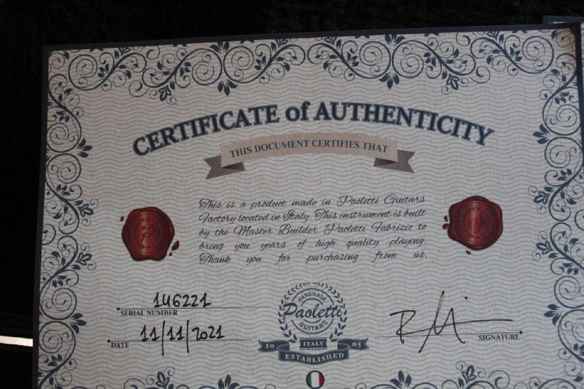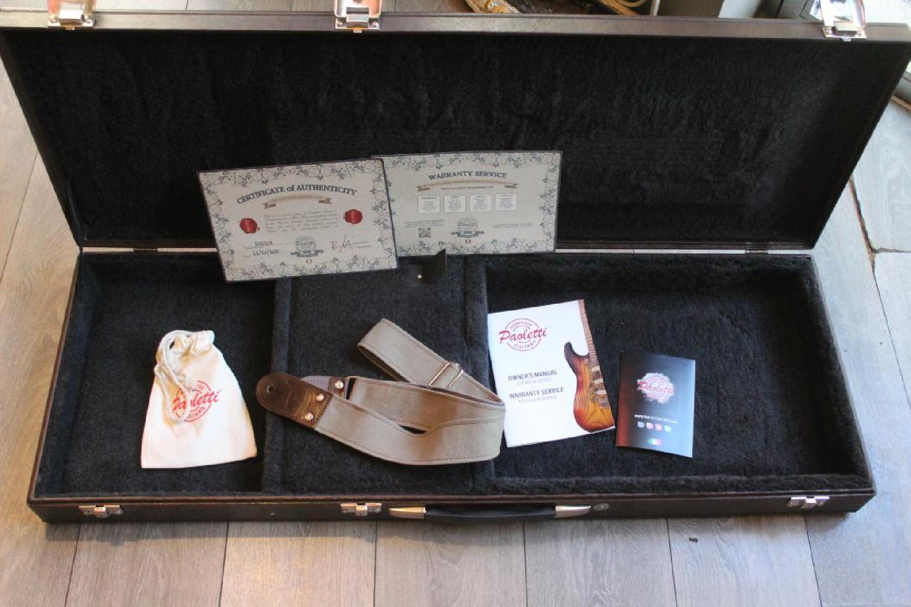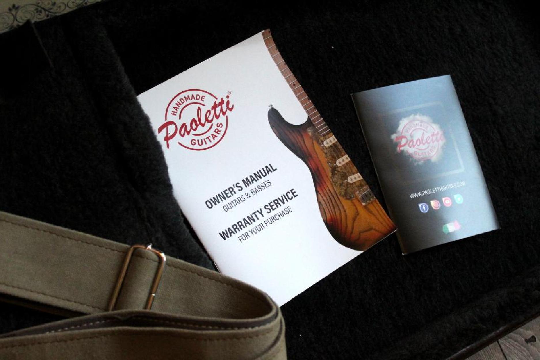 Custom Shop Guitars Made in Italy Welcome to Paoletti Guitars®, where craftsmanship meets creativity, and where every chord resonates with passion and precision. Amidst the enchanting beauty of the Tuscan hills, tradition meets innovation as centuries-old techniques are combined with modern precision to create instruments embodying the timeless beauty and elegance of Italy's artisanal legacy. Here, where Fabrizio Paoletti's family used to produce Chianti red wine, old barrels of reclaimed chestnut wood revealed their potential for carving instruments of exquisite sound and persistent taste – or sustain. Fabrizio's discovery and vision had chestnut wood become Paoletti Guitars®' trademark, as for over 15 years now we have kept using old wine barrels' chestnut wood, giving a whole new life to it. Each guitar we create is a labor of love, meticulously handcrafted by our skilled artisans who infuse every detail with care and expertise. Using only the finest materials, building and assembling each part of your guitar in-house, we ensure that every instrument is an environmentally conscious masterpiece of quality. Our workshop offers an unparalleled personalized experience as you step into a creative process leading up to your real-life dream guitar. From selecting the perfect wood essence for your fretboard to choosing custom hardware, finishes, or intricate inlays, every aspect of your guitar can be tailored to your unique preferences and style, ensuring it stands out with you on stage for years to come. Body Material: Chestnut Top material: Chestnut Color: 01/10 Sage green Neck Material: Canadian Roasted Maple Inlays: Olive wood Number of Frets: 22 Fingerboard Radius: 12" Scale Length: 648mm Bridge: Original Bigsby Bridge B5 Neck Pickup: Paoletti P90 7.8K Bridge Pickup: Paoletti P90 7.8K Electronics: 2 x CTS pots + 3 way switch Pickguard: Brass Italian Style cut Case: Hard-case Accessories: Certificate of warranty & authenticity