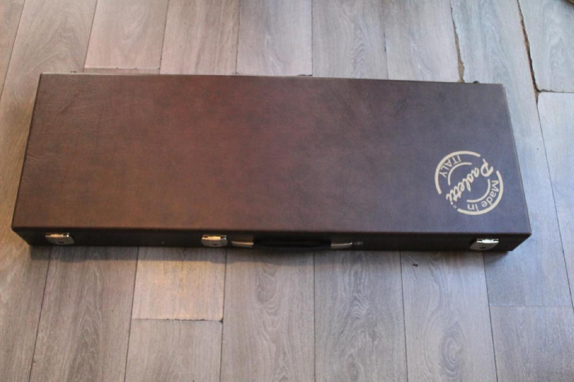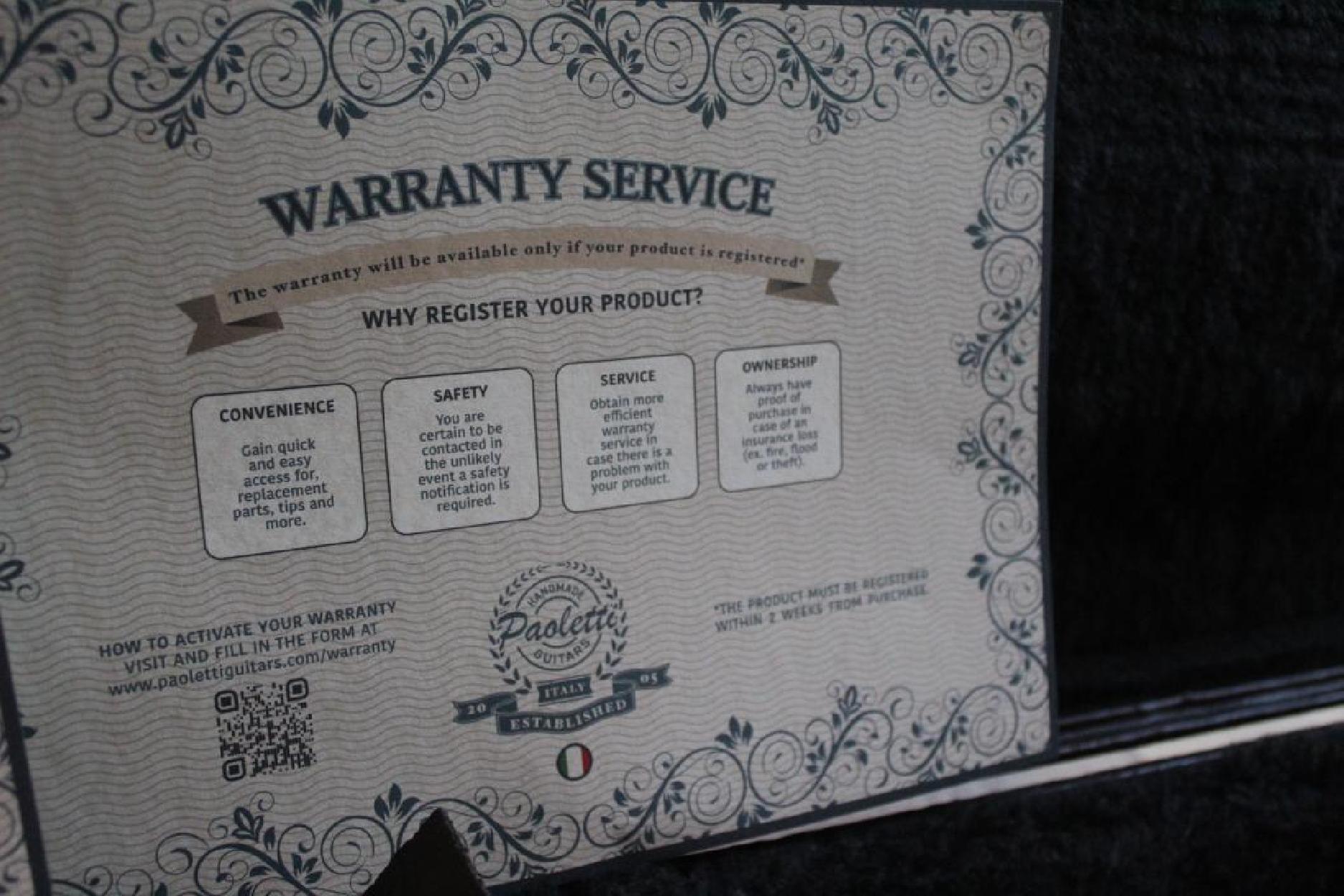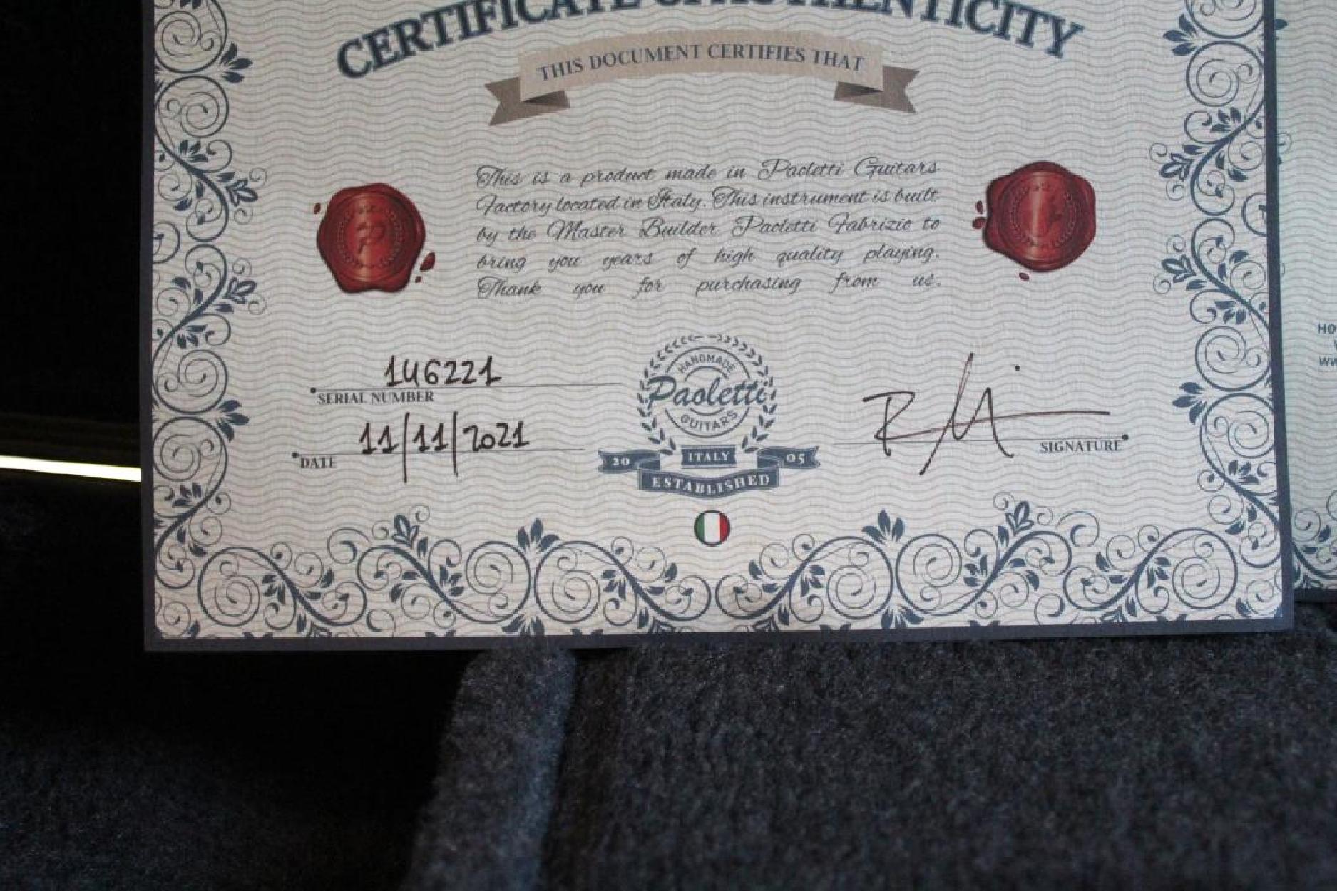 Custom Shop Guitars Made in Italy Welcome to Paoletti Guitars®, where craftsmanship meets creativity, and where every chord resonates with passion and precision. Amidst the enchanting beauty of the Tuscan hills, tradition meets innovation as centuries-old techniques are combined with modern precision to create instruments embodying the timeless beauty and elegance of Italy's artisanal legacy. Here, where Fabrizio Paoletti's family used to produce Chianti red wine, old barrels of reclaimed chestnut wood revealed their potential for carving instruments of exquisite sound and persistent taste – or sustain. Fabrizio's discovery and vision had chestnut wood become Paoletti Guitars®' trademark, as for over 15 years now we have kept using old wine barrels' chestnut wood, giving a whole new life to it. Each guitar we create is a labor of love, meticulously handcrafted by our skilled artisans who infuse every detail with care and expertise. Using only the finest materials, building and assembling each part of your guitar in-house, we ensure that every instrument is an environmentally conscious masterpiece of quality. Our workshop offers an unparalleled personalized experience as you step into a creative process leading up to your real-life dream guitar. From selecting the perfect wood essence for your fretboard to choosing custom hardware, finishes, or intricate inlays, every aspect of your guitar can be tailored to your unique preferences and style, ensuring it stands out with you on stage for years to come. Body Material: Chestnut Top material: Chestnut Color: 01/10 Sage green Neck Material: Canadian Roasted Maple Inlays: Olive wood Number of Frets: 22 Fingerboard Radius: 12" Scale Length: 648mm Bridge: Original Bigsby Bridge B5 Neck Pickup: Paoletti P90 7.8K Bridge Pickup: Paoletti P90 7.8K Electronics: 2 x CTS pots + 3 way switch Pickguard: Brass Italian Style cut Case: Hard-case Accessories: Certificate of warranty & authenticity
