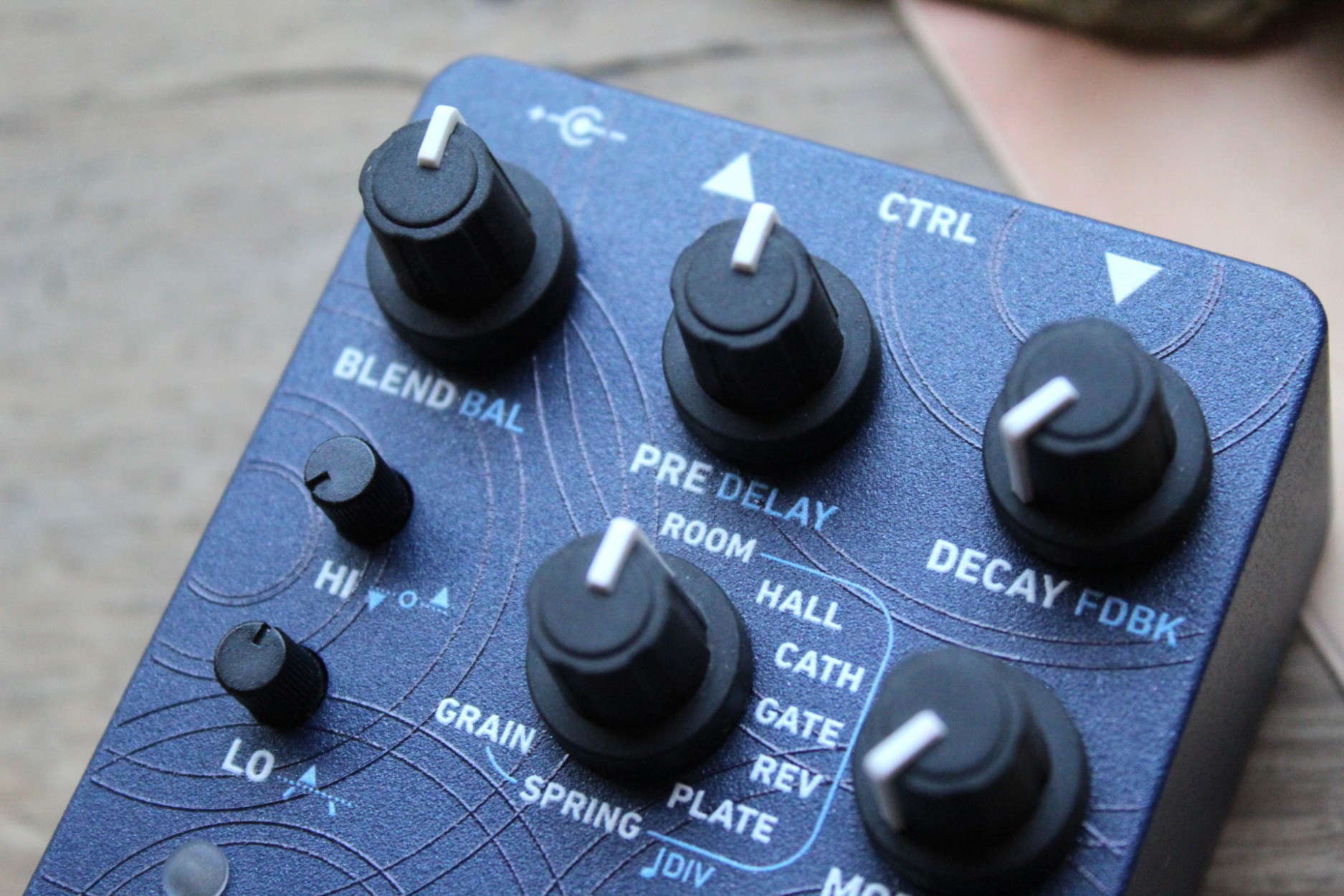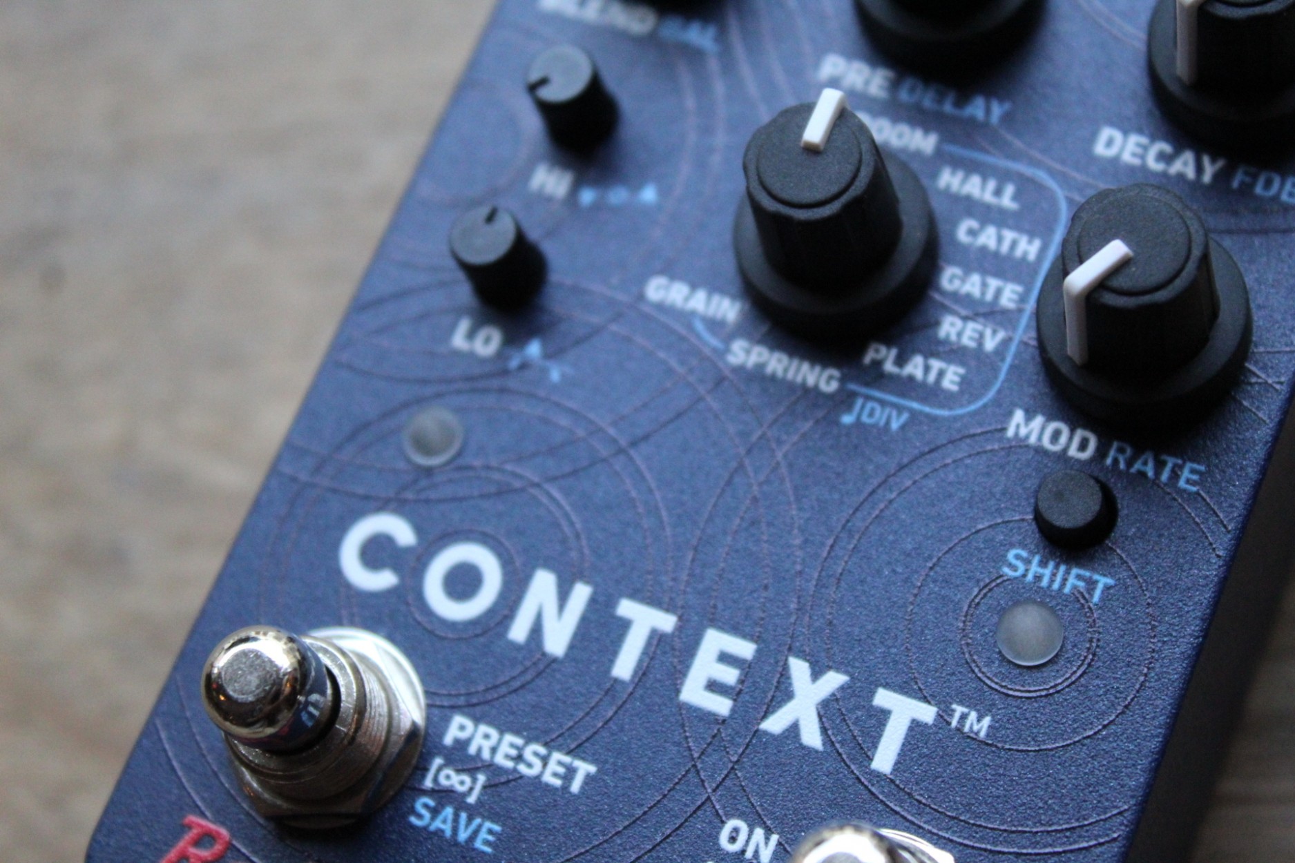 Context combines 1980s digital reverb algorithms with a clean signal path. All of the algorithms are adjustable so that you can get the right combination of pre-delay, reverb time, and tone. Reverb time is adjustable from very tight to nearly endless. The cathedral algorithm adds slight modulation to the trails, for vast ambient washes of sound. The plate algorithm gives you control over low- and high-frequency response for crisp, defined reverb even with bass instruments. Gated reverb gives you big booming drums from the 1980's, but is also great for adding power to guitar while maintaining transparency and space between notes. Finally, there is delay plus reverb for that versatile combination in one pedal.