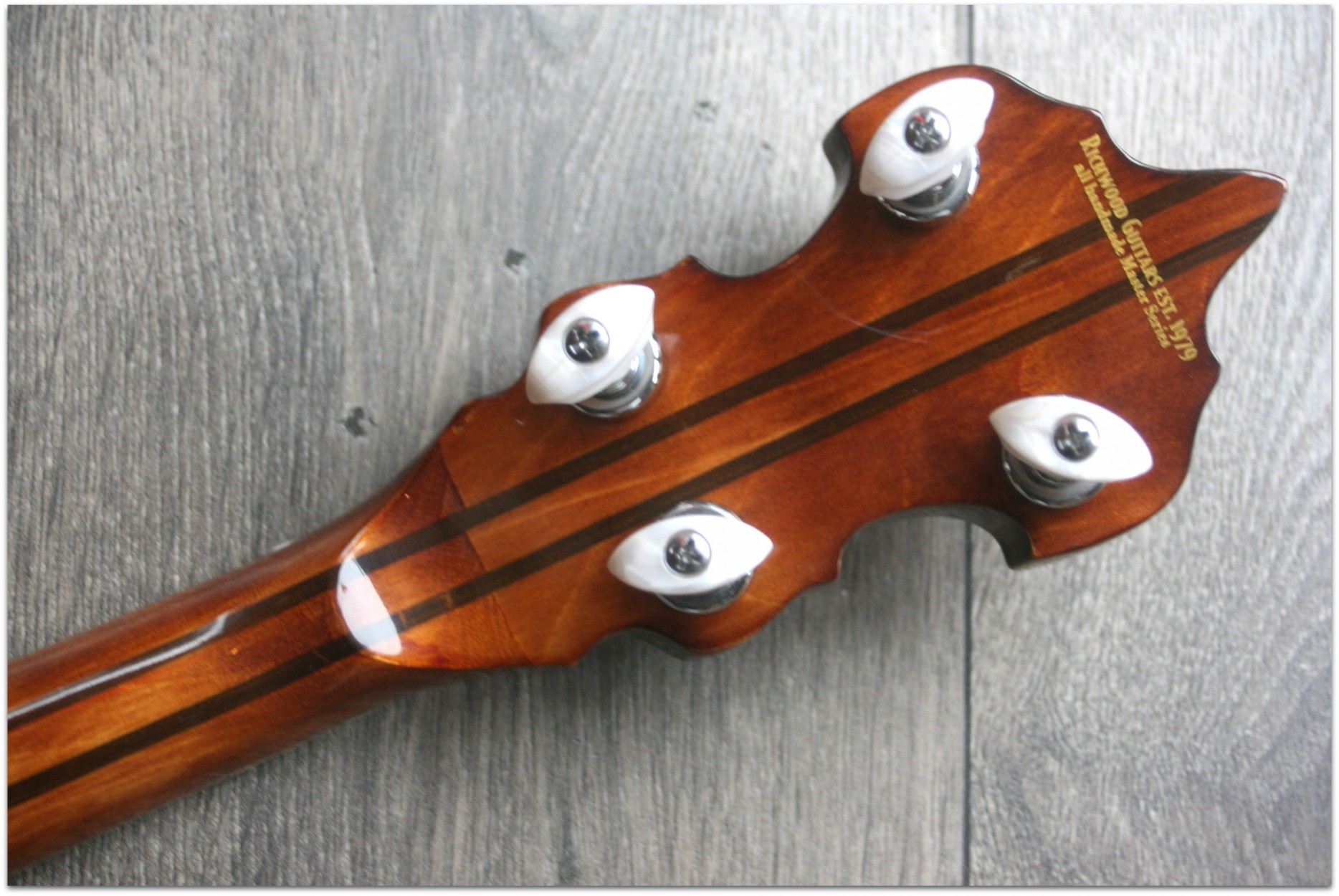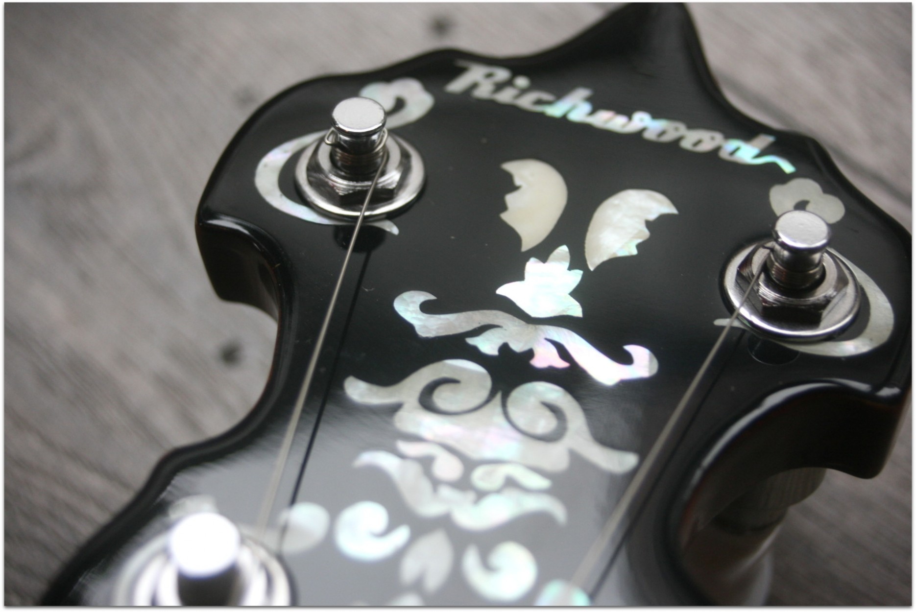 RMB-1805 OVERVIEW folk banjo with two tension rods, solid maple rim, bronze tone ring, ebony fingerboard, 24 brackets RMB-1805 The pinnacle 5-string banjo in the Richwood Master Series banjo line. Solid maple rim, chrome plated bronze tone ring, chrome plated tension hoop, flamed maple resonator, 5-part neck, two coordinator rods, all features of a top quality instrument. This is the instrument that will put a permanent smile on your face! top Remo weatherking white 11” rim solid maple resonator flamed maple with abalone purfling neck 5 part maple and rosewood fingerboard ebony bridge maple with ebony cap tonering bronze chrome plated tension ring bronze chrome plated tuners high grade Korean banjo style 4 truss rod two way adjustable scale length 67 cm total instrument length 96 cm top nut width 31,3 mm nut material bone binding ivoroid finish highgloss clear hardware chrome plated tuning GDGBD brackets 24 weight app. 5,45 kg