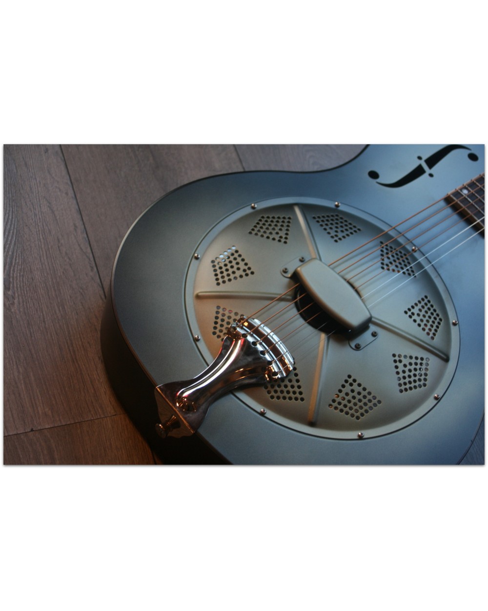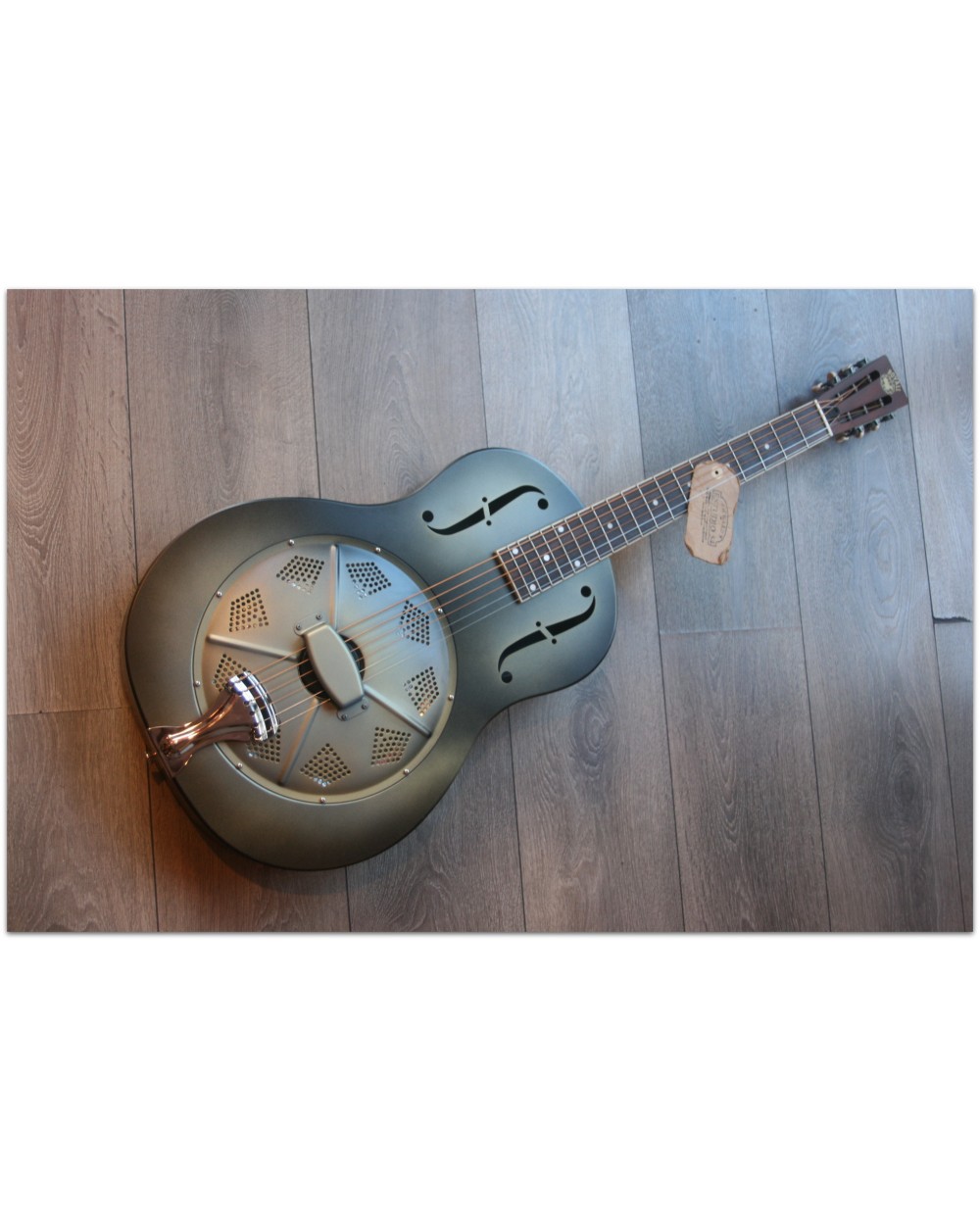 Steel body single cone resonator PONY BOY, 12 frets, antique finish, with softcase The 12 fret steel body resonator guitar is iconic for the blues style bottleneck player. The steel body's tone is loud, direct, clear and bold. Perfect for those looking for the summum in old style resonator tone. The mahogany neck with the 46 mm wide nut is comfortable to play and the set-up is done in the Royall workshop to have great playability with fingers and bottle neck alike. Royall Resonator guitars have a long history in making their own resonator cones. A unique treat that lets Royall resonators stand out from the crowd. Specifications: • resonator type: single cone biscuit bridge • cone specifications: hand spun 9,5” aluminum cone • body material: steel • body finishing: steel antique • bridge material: maple • saddle material: maple • neck joins body at: 12th fret • neck material: mahogany • fingerboard material: blackwood technical wood • truss rod: active two-way • neck finish: satin • nut material: bone • scale length: 648MM • nut width: 46 mm ( 1 13/16”) • fingerboard binding: ivoroid • body length: 508MM • lower bout width: 362MM • upper bout width: 260MM • body thickness: 76MM • top position dots: 5MM white dots • side position dots: 2MM black dots • frets: 18% nickel silver • machine head: Wilkinson vintage style • strings: 013-056 • pickguard: no • strap button: chrome • case: lightweight foam case