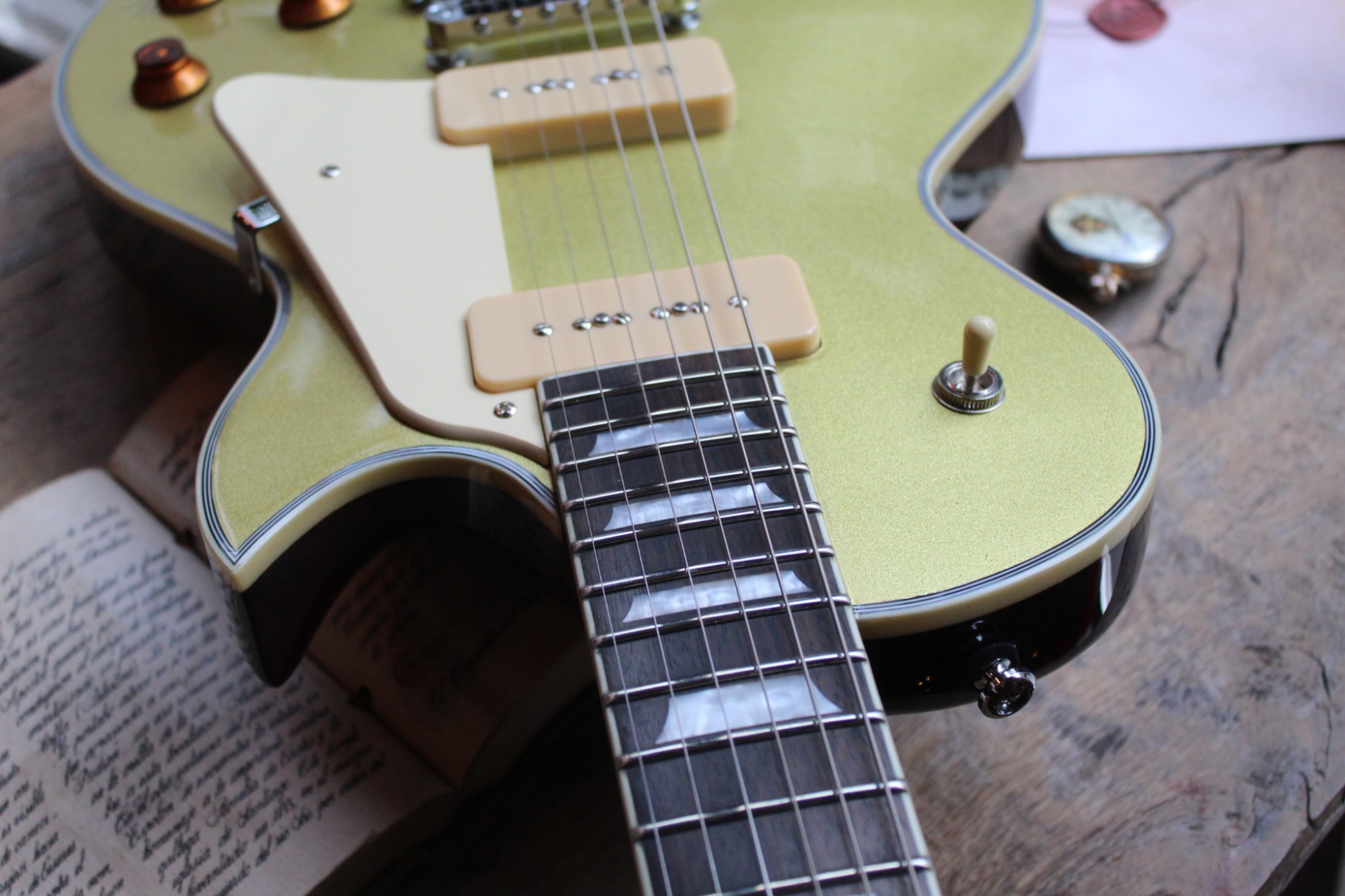 SIRE GUITARS L7V GOLD TOP. Larry Carlton tipo Singlecut LP. Cuerpo de caoba, tapa de arce con chapa de arce flameado. Mástil de caoba C-shape. Diapasón de ébano, con diapasón redondeado para mayor comodidad. Escala 627 mm (24,7’’). Radio diapasón: 305 mm (12’’). Set-neck. Inlays trapezoidales. 22 trastes Medium Jumbo. Cejilla hueso, anchura: 42 mm. Binding de marfil. Pastillas: 2x Larry Carlton P90 (Soapbar). 2 Controles de Volumen y 2 de Tono. Selector de 3 posiciones. Clavijeros con bloqueo Sire Premium Locking. Puente Tune-O-Matic y Stop Tail Piece de aluminio.