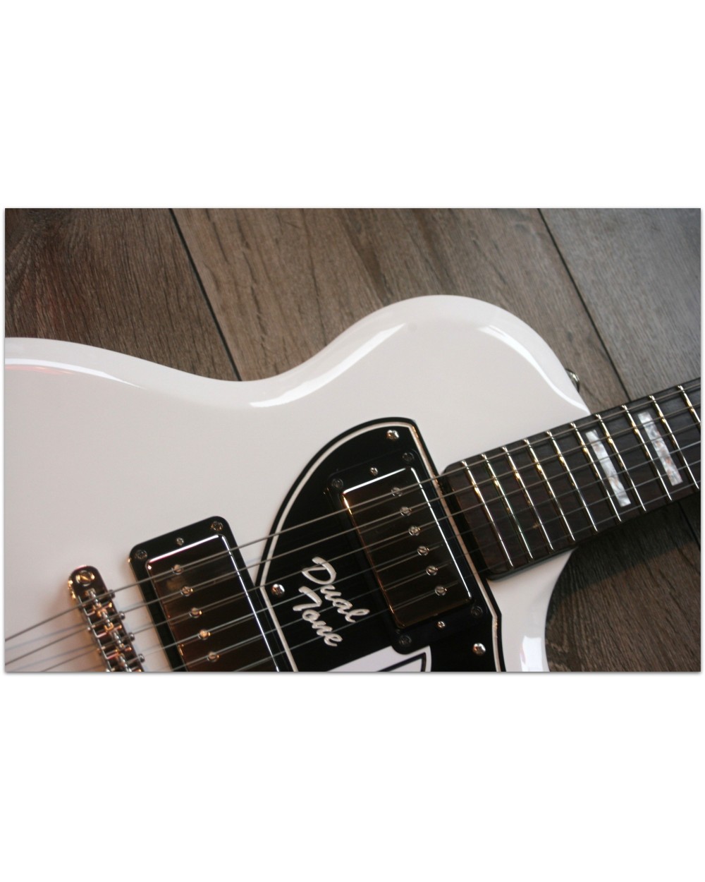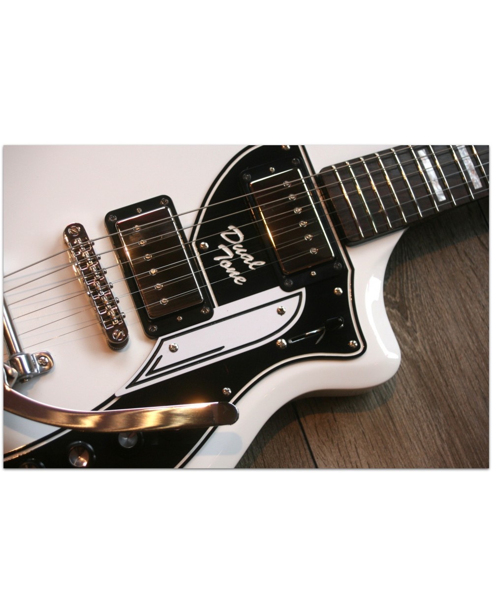 Developed by Supro with assistance from the David Bowie Archive, the David Bowie Limited Edition Dual Tone is based on the main guitar David Bowie played on the Reality album and throughout his final world tour, “A Reality Tour”, in 2003-2004. Although he played a variety of guitars throughout his career, Bowie enjoyed a special relationship with the iconic vintage 60’s Supro Dual Tone he had customized to his specifications. During the recording of the Reality album in New York City in early 2003, Bowie purchased two early-60’s Supro Dual Tone guitars on EBay. One of them, which is prominently featured on the cover art of the New Killer Starsingle, was a 1961 hardtail model.