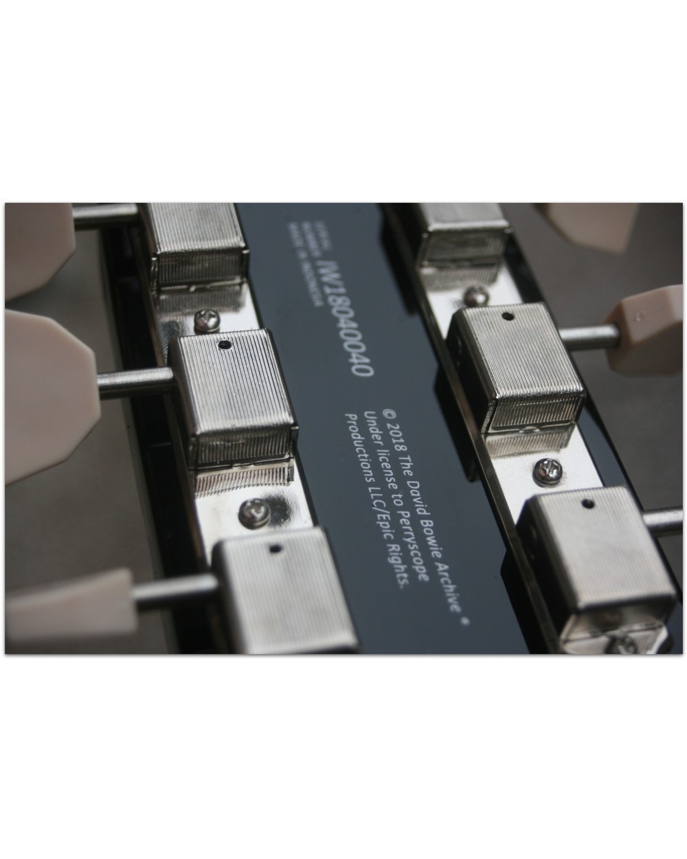 A second Dual Tone was modified by master luthier Flip Scipio, who inlaid the top five fret slots with rainbow colors after installing a Bigsby vibrato at Bowie’s request. “They brought me the second guitar and needed it done very fast, within one day,” recalls Scipio. “That is why I did not reinstall the top frets. The fret filler is made of dyed Japanese maple. David loved the way this guitar looked and sounded, so I chose the colors based on what I thought would look cheerful. I felt that if I can be happy with the guitar, then David would be happy with the guitar as well.” It was this highly customized Supro Dual Tone that became Bowie’s favorite guitar and main live instrument, appeared on the cover of the “A Reality Tour” live album, and inspired this limited edition 2018 re-creation.