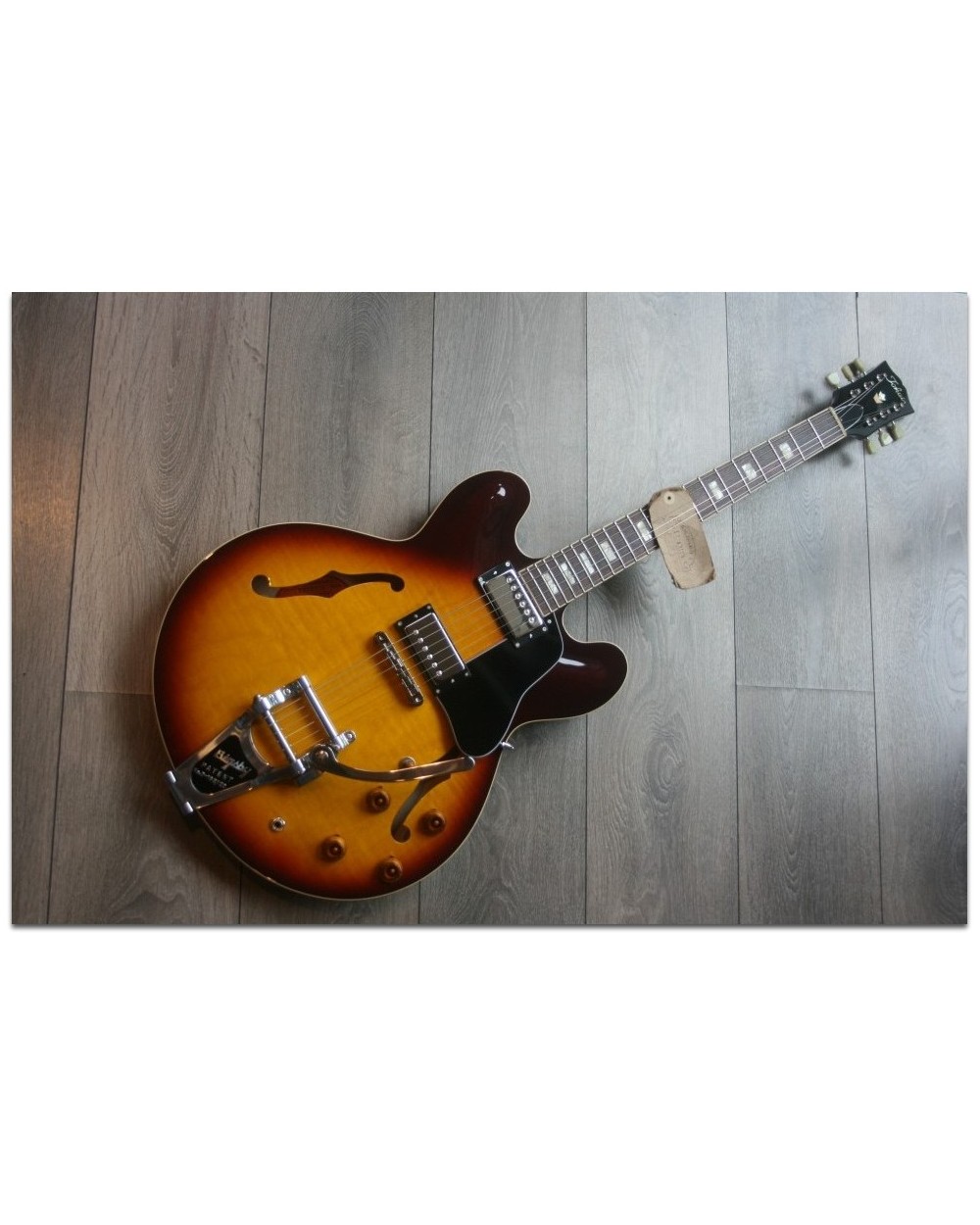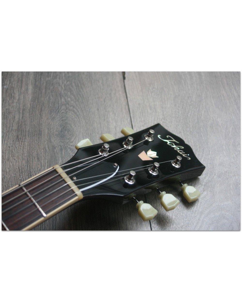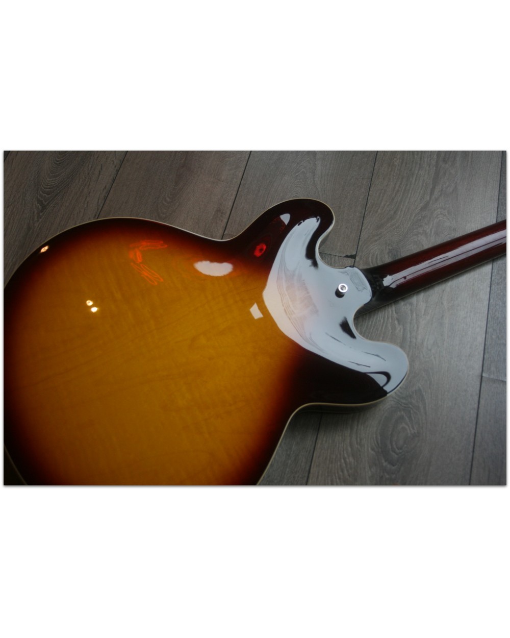 Tokai ES198 BODY: CanadianFlamed Maple Arched top Canadian Flamed Maple Side&Back NECK: African Mahogany one piece set-neck NECK Profile: Asymmetry U shape / 22F / R300 SCALE: 625.00mm FRETS: Sanko SBB-213 (Medium Jumbo Size) Made in Japan Fret Over Binding NUT: Cow Bone (Width:41.0mm) FINGERBOARD: Indian Rosewood MACHINE HEADS: Gotoh SD90-SL BRIDGE: LS-VB (Brass Saddle) Bridge TAILPIECE: LS-VT Aluminium Tailpiece PICKUPS: PAF-Vintage MK2 2x *Magnet Alnico 5 CONTROLS: 2 vol, 2 tone, 3way sw VOLUME POT: CTS CONDENSER: Sprague Orange Drop JACK: Switchcraft STRINGS: GHS 10-46 FINISH: Urethane Finish Made in Japan