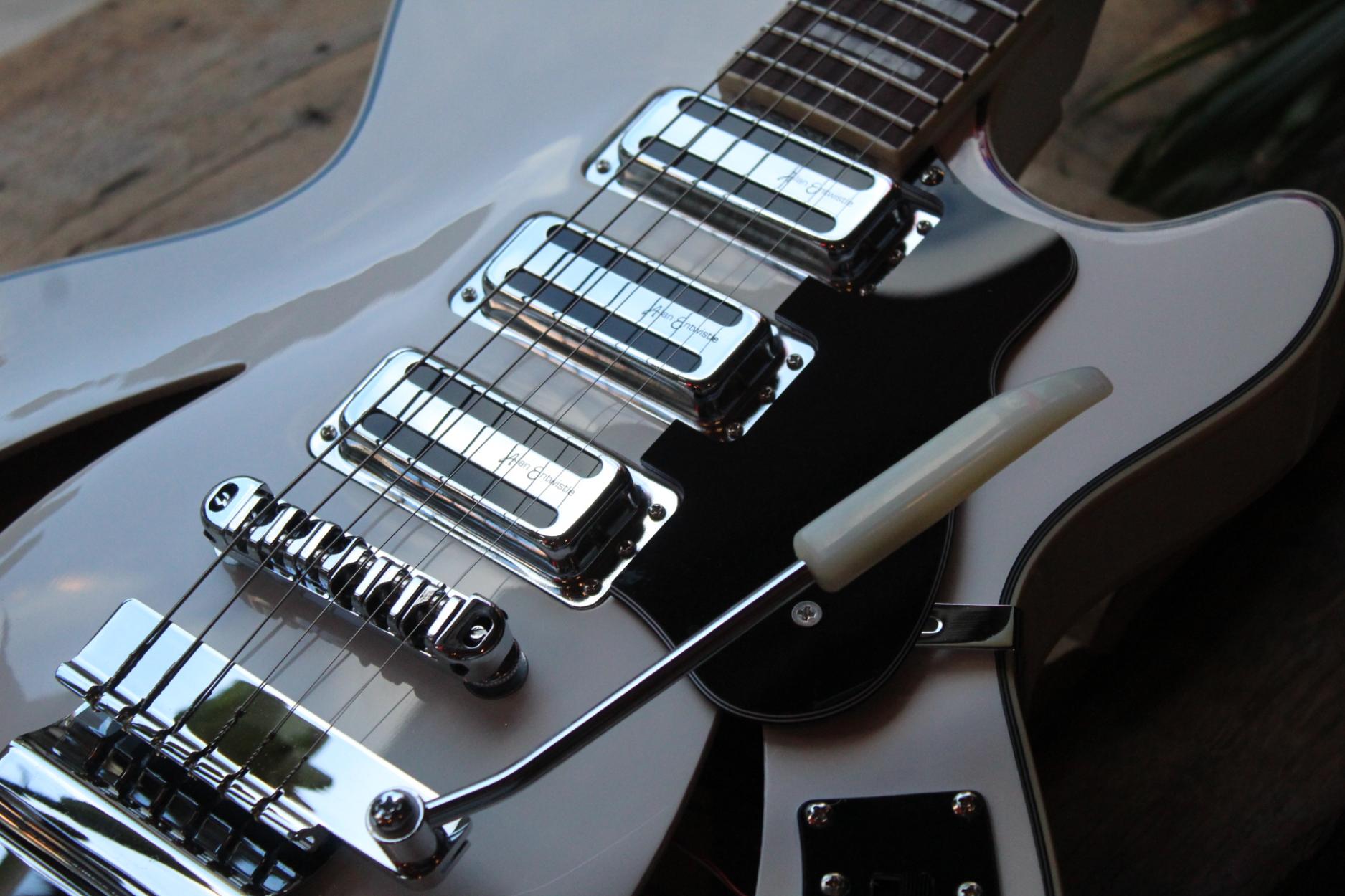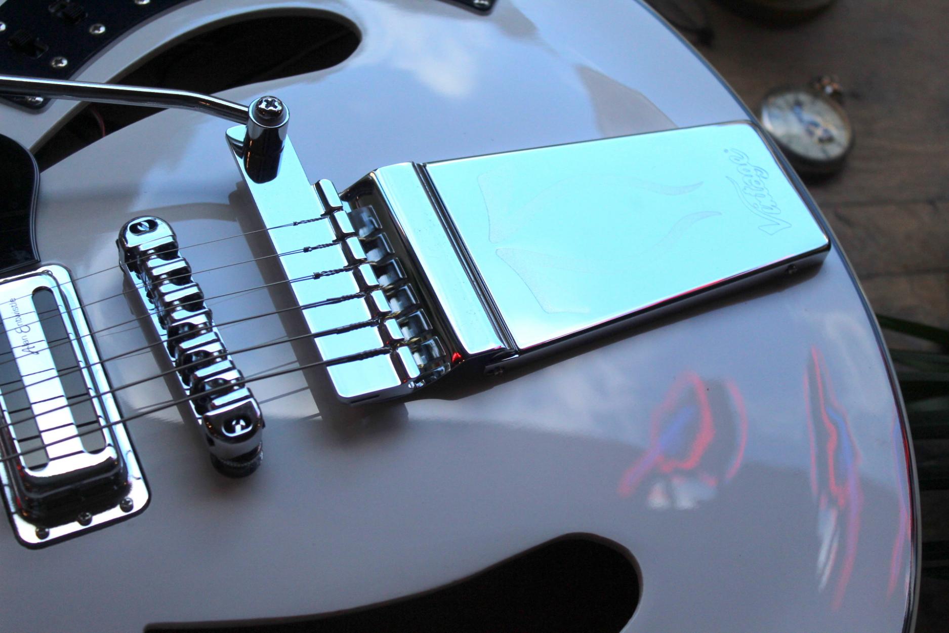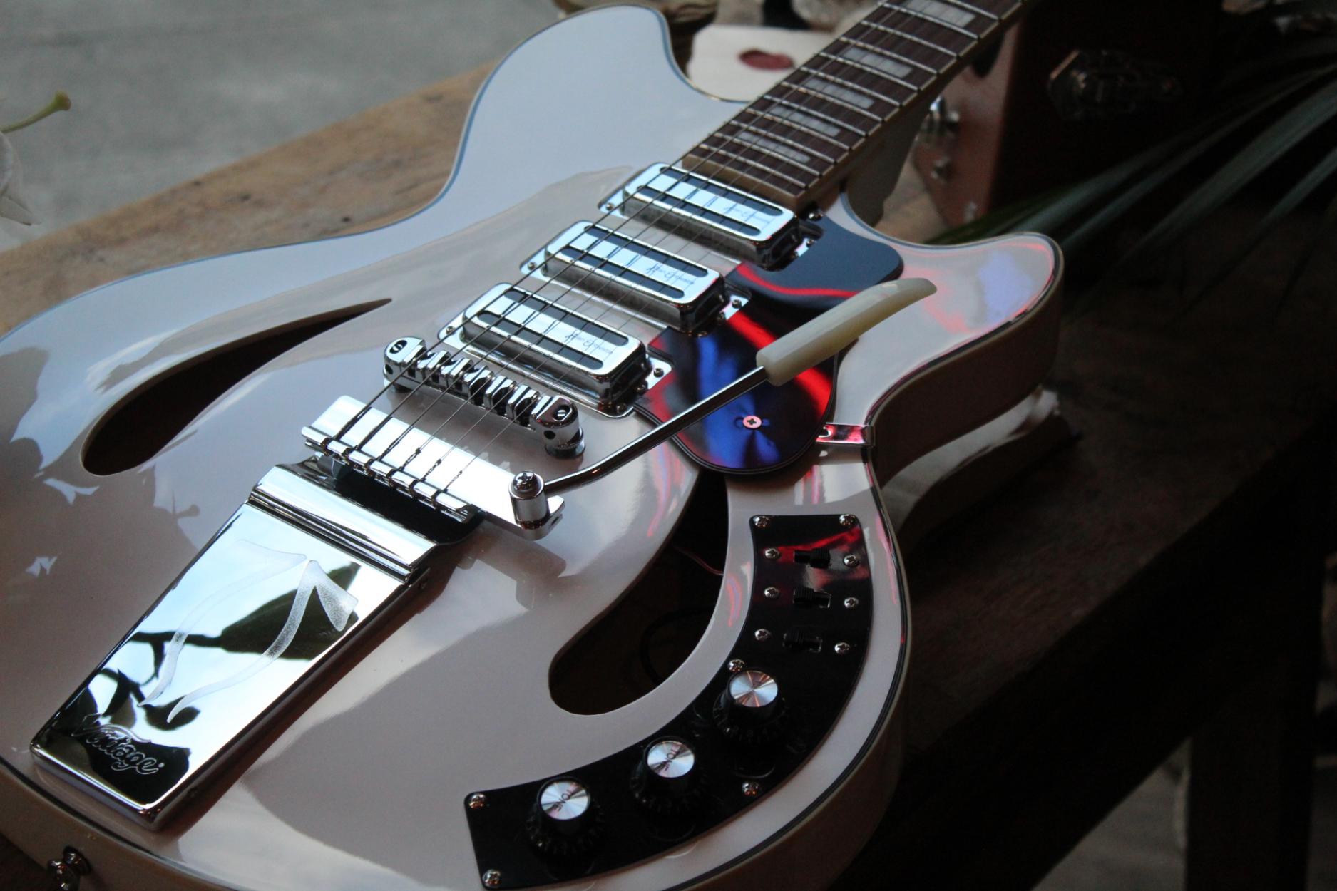 3, 82 KG The Vintage Revo Custom Supreme is themed on the guitar played by the iconic 60s British guitarist, WHO was famous for his scissor kicks and windmill swinging guitar technique. With the same semi-acoustic body, neck and fingerboard tonewood construction and 3 low noise Entwistle RT64 double coils as the Revo Supreme Baritone, this beautiful model features a vintage style vibrato system. Body: Maple Neck: Maple Fingerboard: Jatoba Frets: 22 Medium Jumbo Scale Length: 24.75" (628mm) Tuners: Wilkinson® Bridge: Roller Vibrato: Vintage Style Pickups: 3 Alan Entwistle Toaster style – Entwistle RT64 Toaster style (7.5K) Controls: Volume, Tone 1, Tone 2 Bass Cut. 3 ON/OFF pickup slide switches. Top Nut: GraphTech® Strings: Elixir Download Control Instructions Review Guitarist Magazine Download REVO Brochure The 'Custom Supreme' is an original Vintage® REVO Series™ guitar, designed and created by the UK Vintage design team and Alan Entwistle.