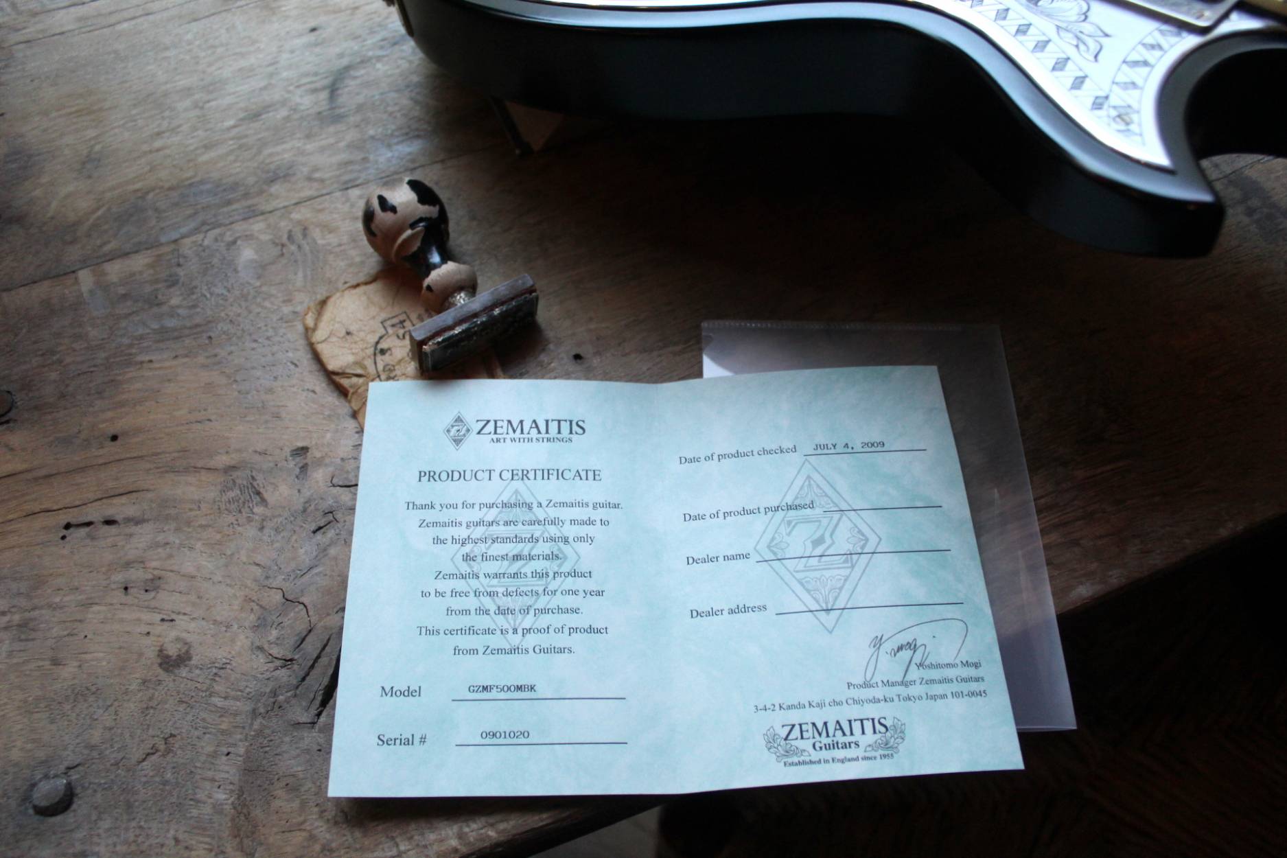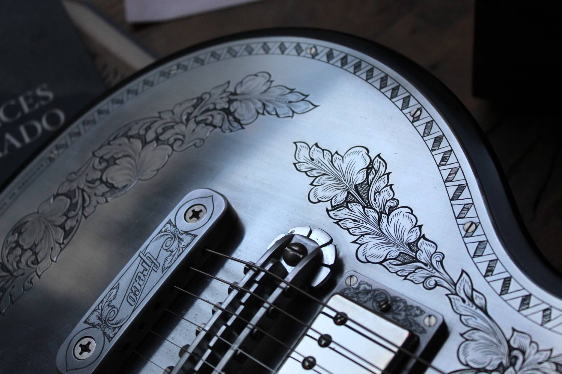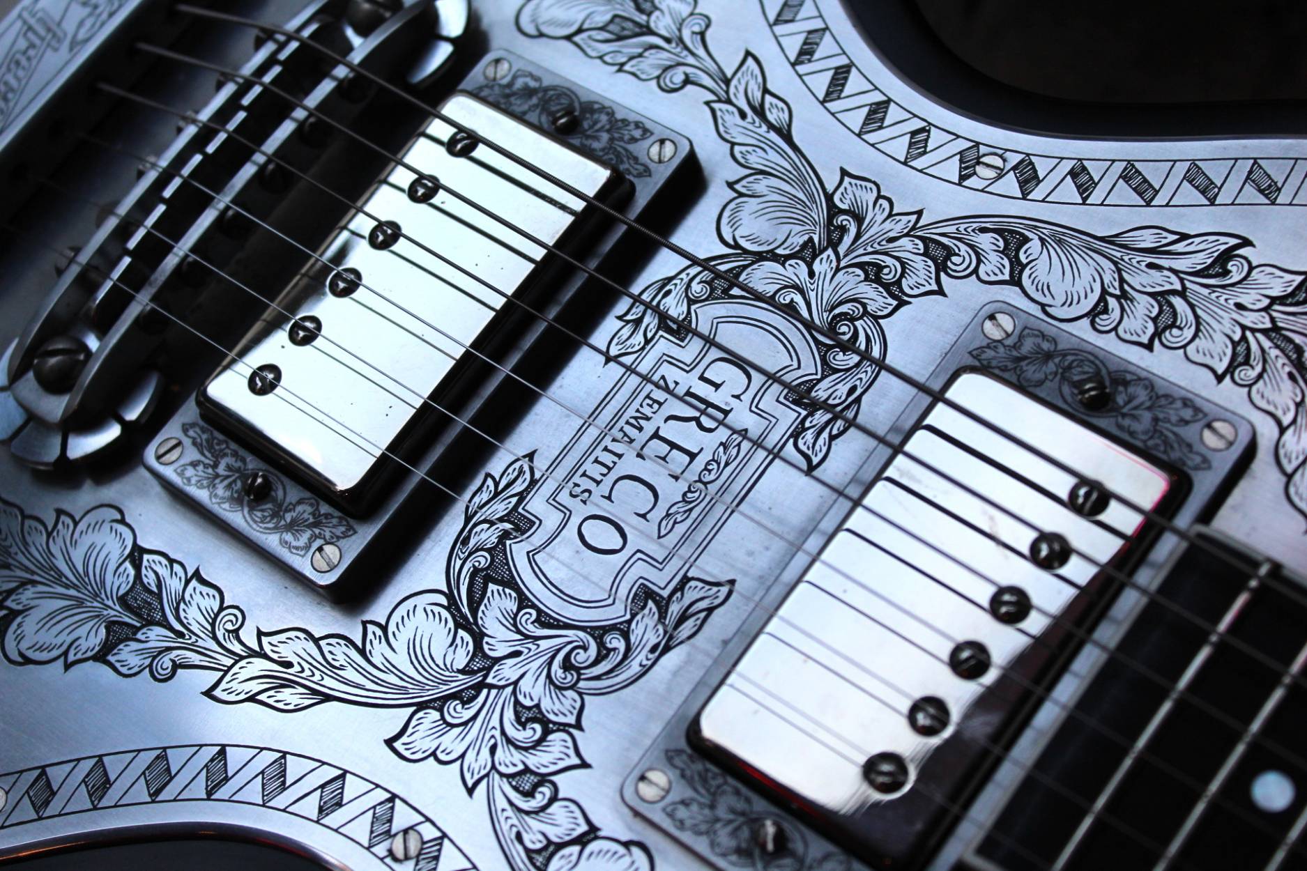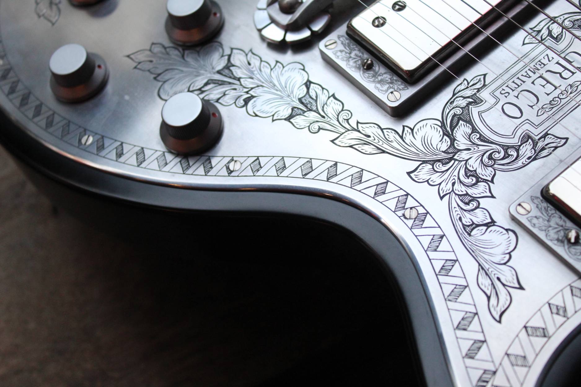 The Zemaitis Greco GZMF 500 (Greco Zemaitis, Metal Front) is part of the GZ line, handbuilt in Japan by Greco under license from Zemaitis. These are top quality instruments. The metal parts are Duralumin in the original Zemaitis design and a lot of engraving and decoration, with the engraving design by Danny OBrien.