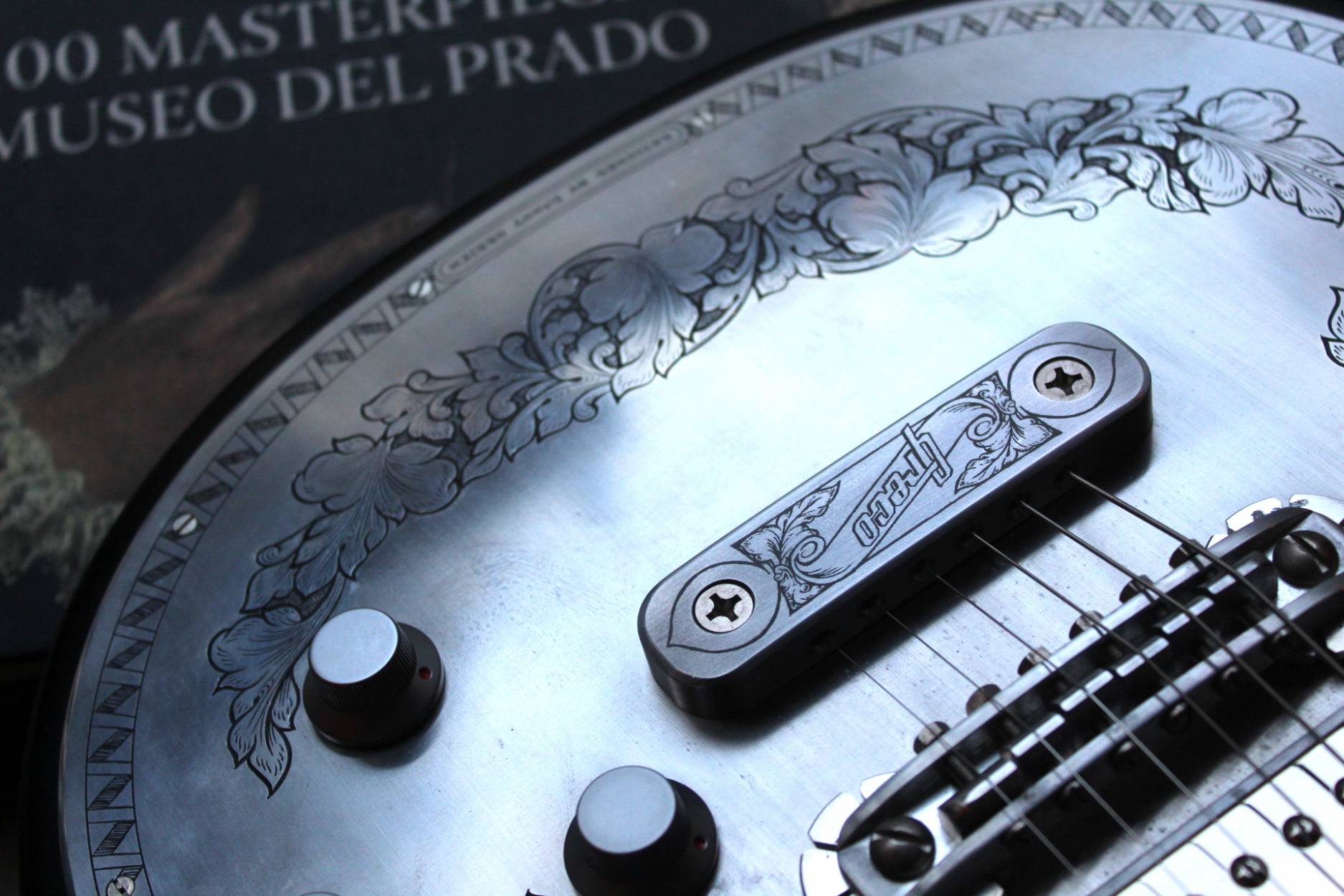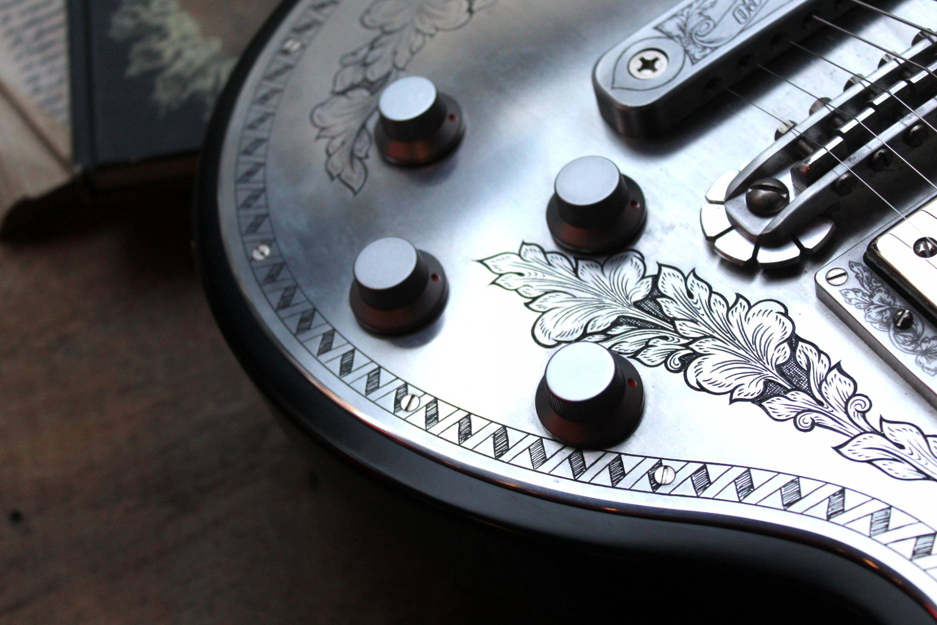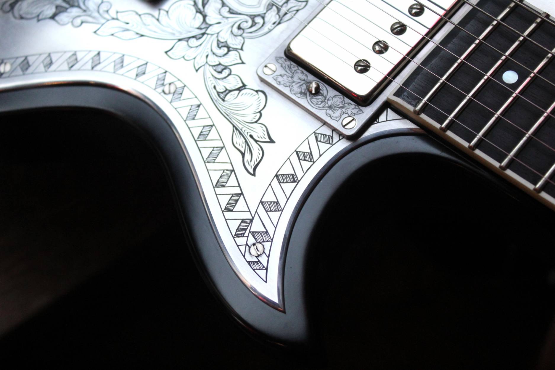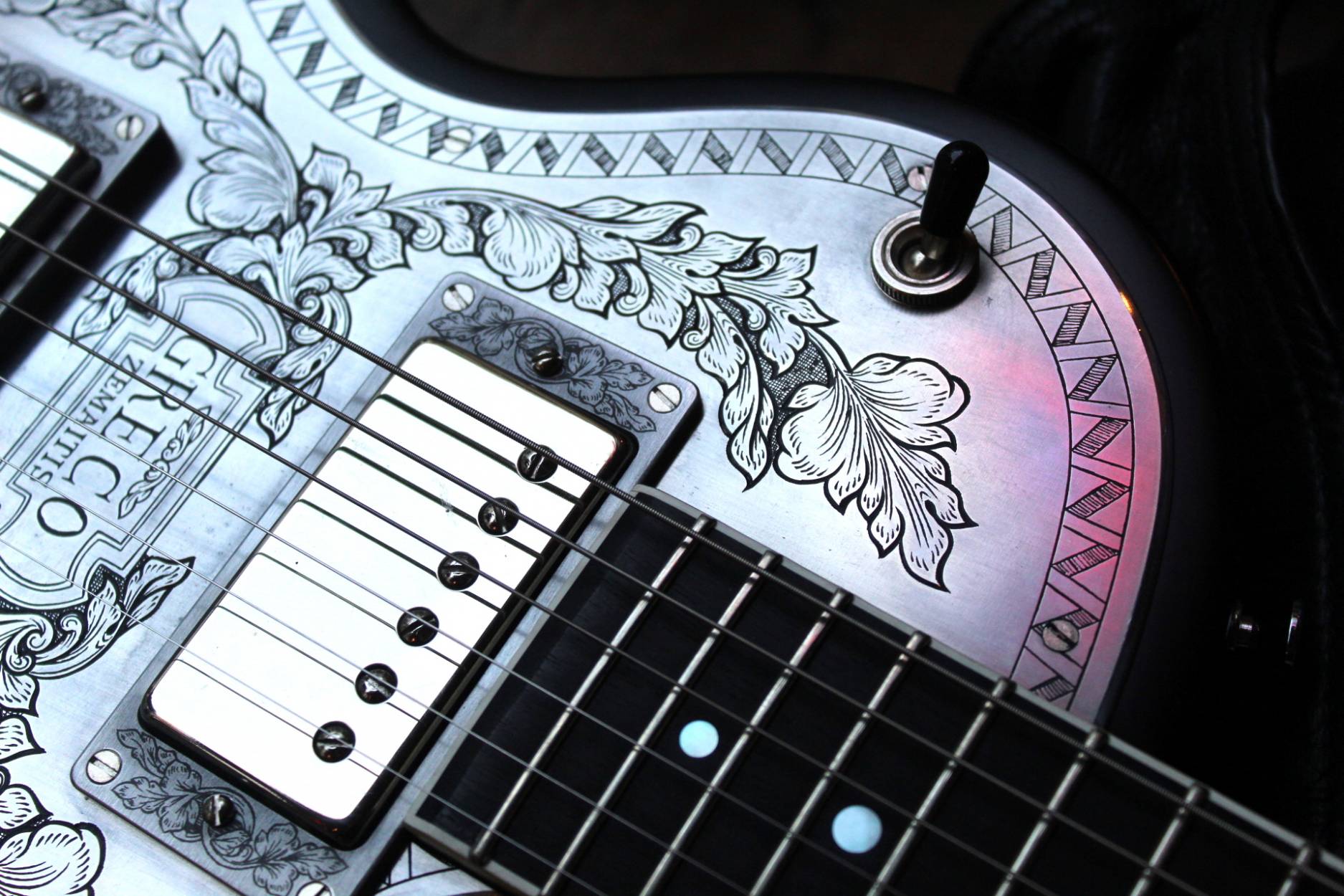 The Zemaitis Greco GZMF 500 (Greco Zemaitis, Metal Front) is part of the GZ line, handbuilt in Japan by Greco under license from Zemaitis. These are top quality instruments. The metal parts are Duralumin in the original Zemaitis design and a lot of engraving and decoration, with the engraving design by Danny OBrien.