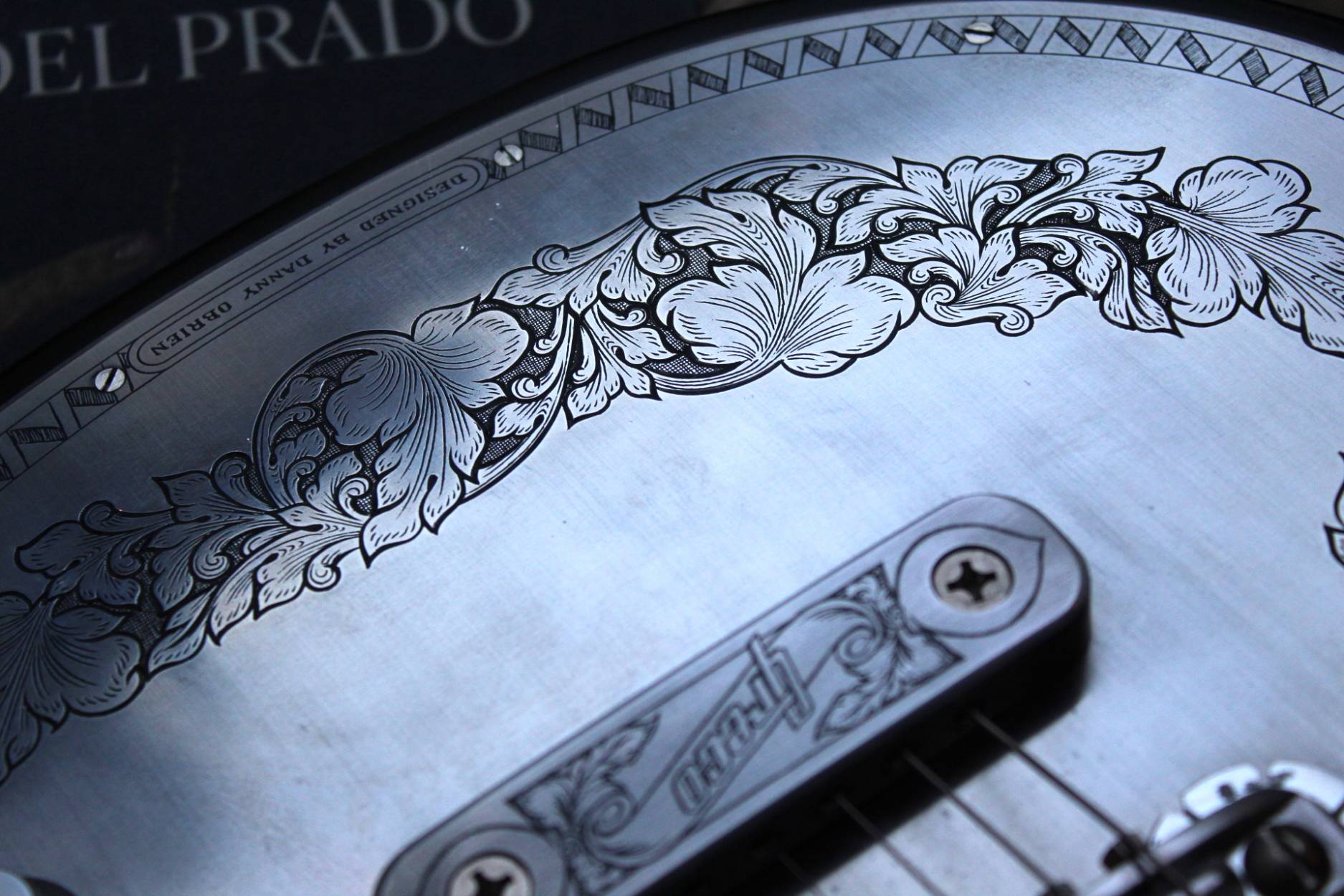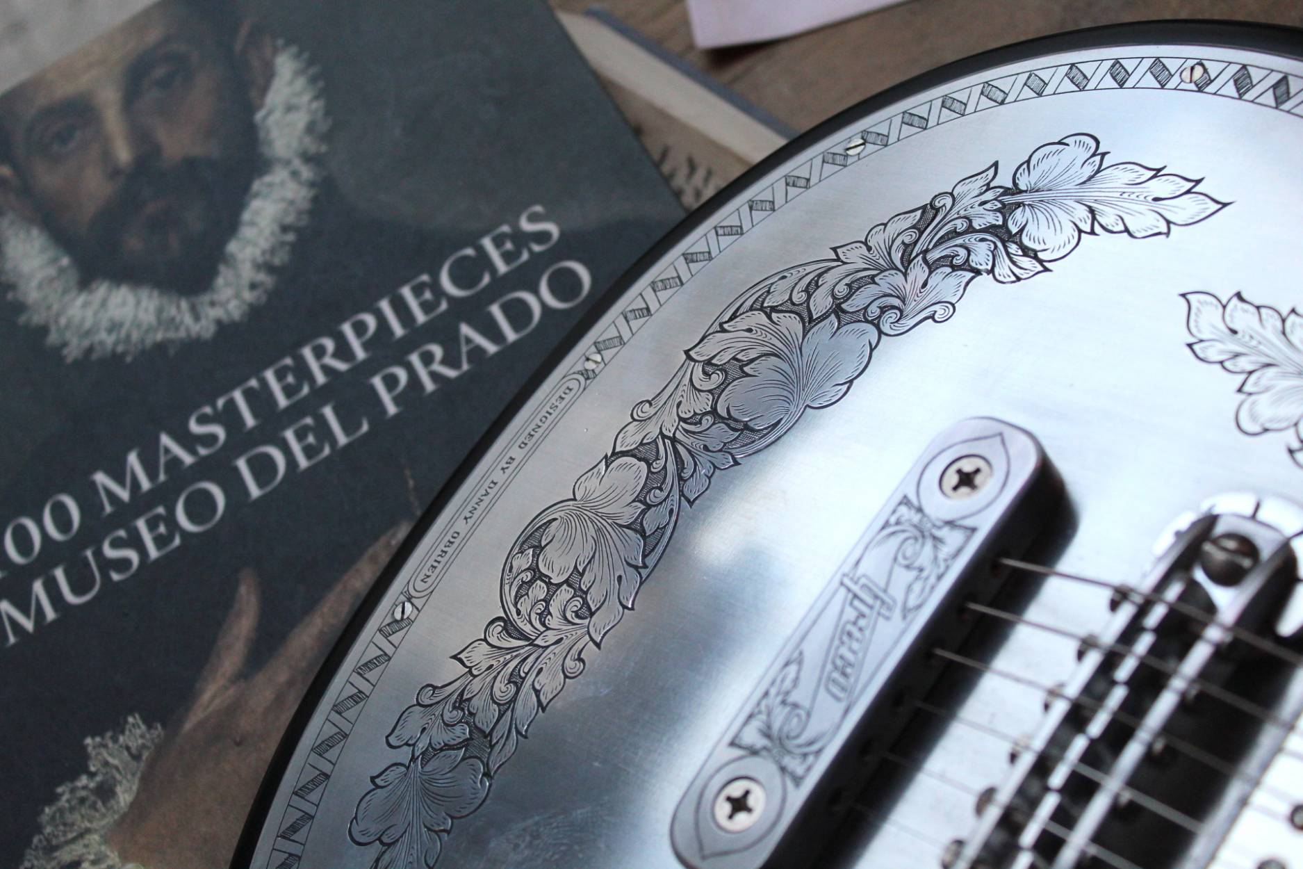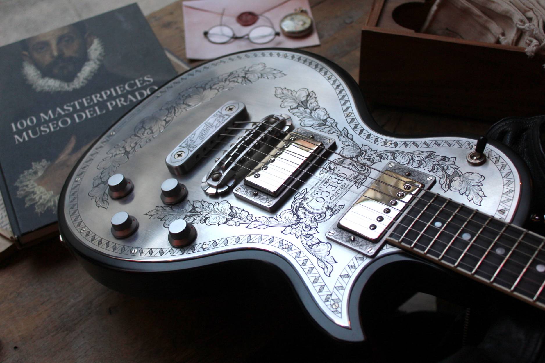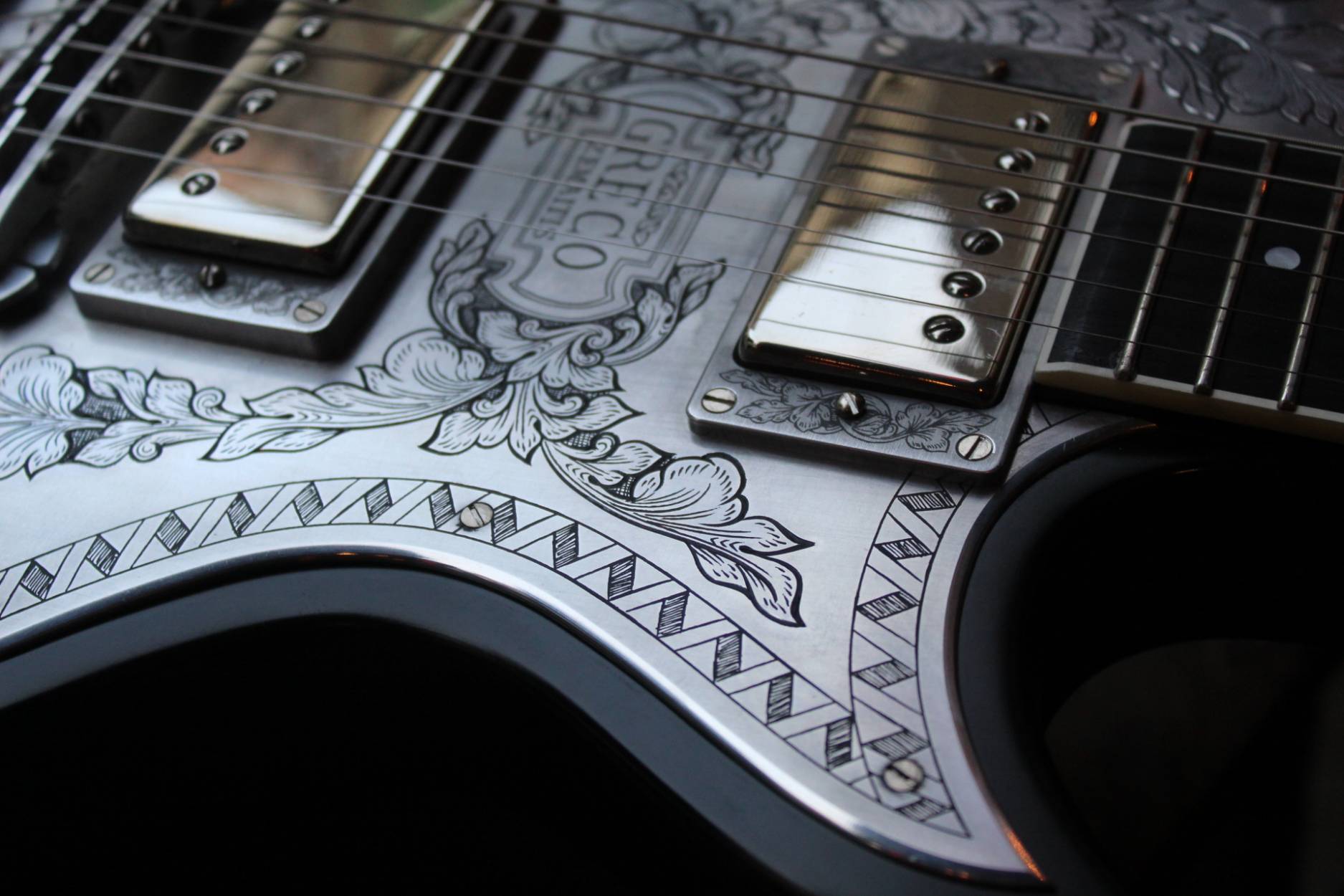 The Zemaitis Greco GZMF 500 (Greco Zemaitis, Metal Front) is part of the GZ line, handbuilt in Japan by Greco under license from Zemaitis. These are top quality instruments. The metal parts are Duralumin in the original Zemaitis design and a lot of engraving and decoration, with the engraving design by Danny OBrien.